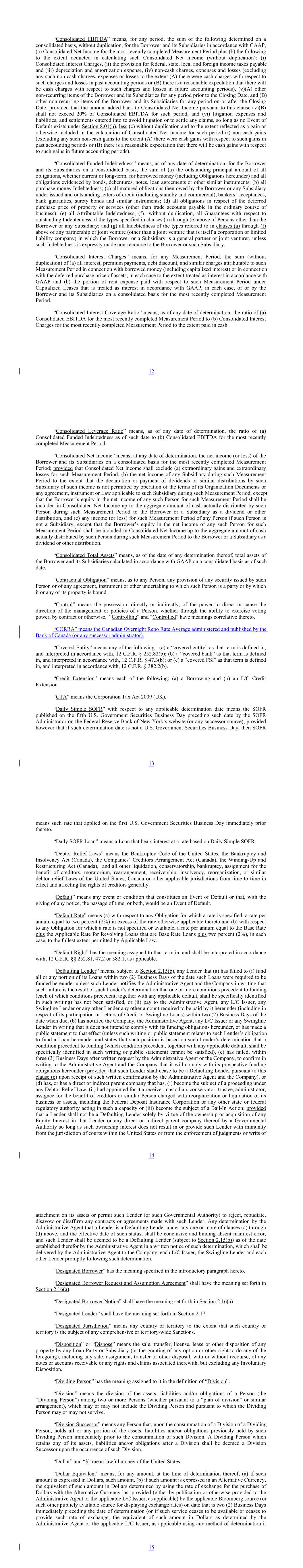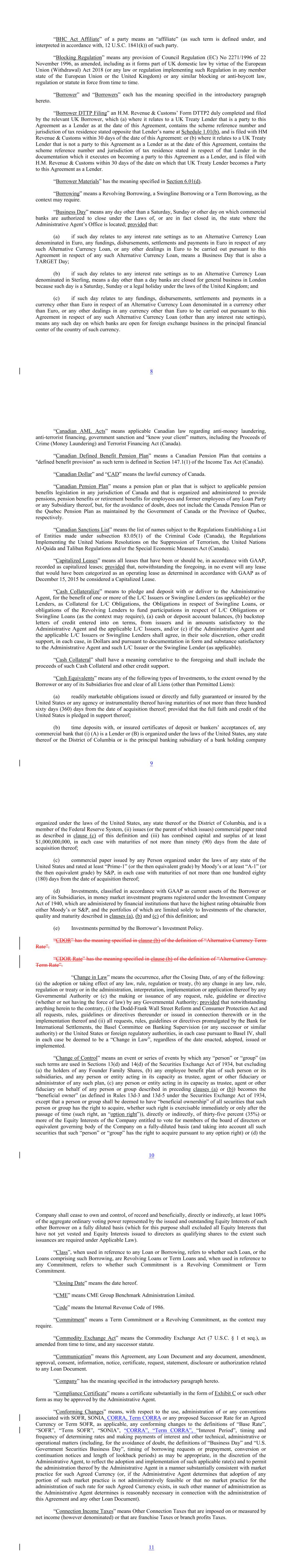 “BHC Act Affiliate” of a party means an “affiliate” (as such term is defined under, and interpreted in accordance with, 12 U.S.C. 1841(k)) of such party. “Blocking Regulation” means any provision of Council Regulation (EC) No 2271/1996 of 22 November 1996, as amended, including as it forms part of UK domestic law by virtue of the European Union (Withdrawal) Act 2018 (or any law or regulation implementing such Regulation in any member state of the European Union or the United Kingdom) or any similar blocking or anti-boycott law, regulation or statute in force from time to time. “Borrower” and “Borrowers” each has the meaning specified in the introductory paragraph hereto. “Borrower DTTP Filing” an H.M. Revenue & Customs’ Form DTTP2 duly completed and filed by the relevant UK Borrower, which (a) where it relates to a UK Treaty Lender that is a party to this Agreement as a Lender as at the date of this Agreement, contains the scheme reference number and jurisdiction of tax residence stated opposite that Lender’s name at Schedule 1.01(b), and is filed with HM Revenue & Customs within 30 days of the date of this Agreement: or (b) where it relates to a UK Treaty Lender that is not a party to this Agreement as a Lender as at the date of this Agreement, contains the scheme reference number and jurisdiction of tax residence stated in respect of that Lender in the documentation which it executes on becoming a party to this Agreement as a Lender, and is filed with H.M. Revenue & Customs within 30 days of the date on which that UK Treaty Lender becomes a Party to this Agreement as a Lender. “Borrower Materials” has the meaning specified in Section 6.01(d). “Borrowing” means a Revolving Borrowing, a Swingline Borrowing or a Term Borrowing, as the context may require. “Business Day” means any day other than a Saturday, Sunday or other day on which commercial banks are authorized to close under the Laws of, or are in fact closed in, the state where the Administrative Agent’s Office is located; provided that: (a) if such day relates to any interest rate settings as to an Alternative Currency Loan denominated in Euro, any fundings, disbursements, settlements and payments in Euro in respect of any such Alternative Currency Loan, or any other dealings in Euro to be carried out pursuant to this Agreement in respect of any such Alternative Currency Loan, means a Business Day that is also a TARGET Day; (b) if such day relates to any interest rate settings as to an Alternative Currency Loan denominated in Sterling, means a day other than a day banks are closed for general business in London because such day is a Saturday, Sunday or a legal holiday under the laws of the United Kingdom; and (c) if such day relates to any fundings, disbursements, settlements and payments in a currency other than Euro in respect of an Alternative Currency Loan denominated in a currency other than Euro, or any other dealings in any currency other than Euro to be carried out pursuant to this Agreement in respect of any such Alternative Currency Loan (other than any interest rate settings), means any such day on which banks are open for foreign exchange business in the principal financial center of the country of such currency. 8 “Canadian AML Acts” means applicable Canadian law regarding anti-money laundering, anti-terrorist financing, government sanction and “know your client” matters, including the Proceeds of Crime (Money Laundering) and Terrorist Financing Act (Canada). “Canadian Defined Benefit Pension Plan” means a Canadian Pension Plan that contains a "defined benefit provision" as such term is defined in Section 147.1(1) of the Income Tax Act (Canada). “Canadian Dollar” and “CAD” means the lawful currency of Canada. “Canadian Pension Plan” means a pension plan or plan that is subject to applicable pension benefits legislation in any jurisdiction of Canada and that is organized and administered to provide pensions, pension benefits or retirement benefits for employees and former employees of any Loan Party or any Subsidiary thereof, but, for the avoidance of doubt, does not include the Canada Pension Plan or the Quebec Pension Plan as maintained by the Government of Canada or the Province of Quebec, respectively. “Canadian Sanctions List” means the list of names subject to the Regulations Establishing a List of Entities made under subsection 83.05(1) of the Criminal Code (Canada), the Regulations Implementing the United Nations Resolutions on the Suppression of Terrorism, the United Nations Al-Qaida and Taliban Regulations and/or the Special Economic Measures Act (Canada). “Capitalized Leases” means all leases that have been or should be, in accordance with GAAP, recorded as capitalized leases; provided that, notwithstanding the foregoing, in no event will any lease that would have been categorized as an operating lease as determined in accordance with GAAP as of December 15, 2015 be considered a Capitalized Lease. “Cash Collateralize” means to pledge and deposit with or deliver to the Administrative Agent, for the benefit of one or more of the L/C Issuers or Swingline Lenders (as applicable) or the Lenders, as Collateral for L/C Obligations, the Obligations in respect of Swingline Loans, or obligations of the Revolving Lenders to fund participations in respect of L/C Obligations or Swingline Loans (as the context may require), (a) cash or deposit account balances, (b) backstop letters of credit entered into on terms, from issuers and in amounts satisfactory to the Administrative Agent and the applicable L/C Issuers, and/or (c) if the Administrative Agent and the applicable L/C Issuers or Swingline Lenders shall agree, in their sole discretion, other credit support, in each case, in Dollars and pursuant to documentation in form and substance satisfactory to the Administrative Agent and such L/C Issuer or the Swingline Lender (as applicable). “Cash