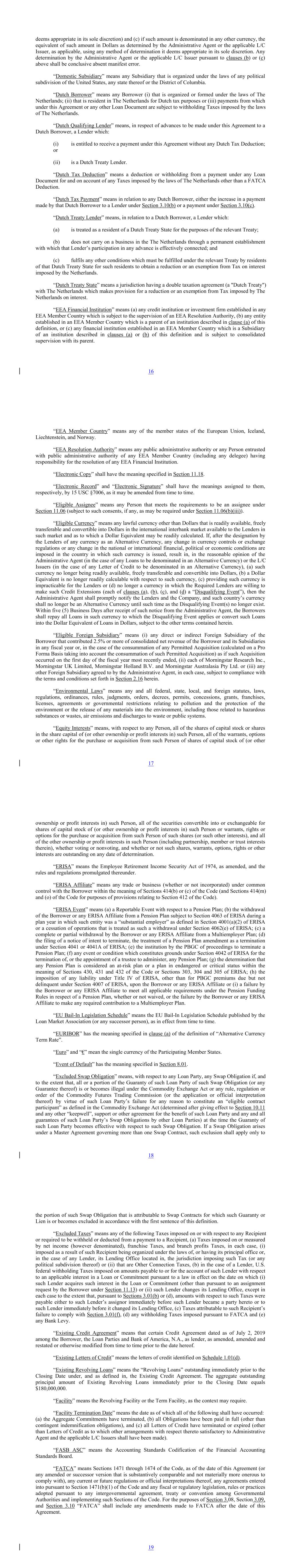 deems appropriate in its sole discretion) and (c) if such amount is denominated in any other currency, the equivalent of such amount in Dollars as determined by the Administrative Agent or the applicable L/C Issuer, as applicable, using any method of determination it deems appropriate in its sole discretion. Any determination by the Administrative Agent or the applicable L/C Issuer pursuant to clauses (b) or (c) above shall be conclusive absent manifest error. “Domestic Subsidiary” means any Subsidiary that is organized under the laws of any political subdivision of the United States, any state thereof or the District of Columbia. “Dutch Borrower” means any Borrower (i) that is organized or formed under the laws of The Netherlands; (ii) that is resident in The Netherlands for Dutch tax purposes or (iii) payments from which under this Agreement or any other Loan Document are subject to withholding Taxes imposed by the laws of The Netherlands. “Dutch Qualifying Lender” means, in respect of advances to be made under this Agreement to a Dutch Borrower, a Lender which: (i) is entitled to receive a payment under this Agreement without any Dutch Tax Deduction; or (ii) is a Dutch Treaty Lender. “Dutch Tax Deduction” means a deduction or withholding from a payment under any Loan Document for and on account of any Taxes imposed by the laws of The Netherlands other than a FATCA Deduction. “Dutch Tax Payment” means in relation to any Dutch Borrower, either the increase in a payment made by that Dutch Borrower to a Lender under Section 3.10(b) or a payment under Section 3.10(c). “Dutch Treaty Lender” means, in relation to a Dutch Borrower, a Lender which: (a) is treated as a resident of a Dutch Treaty State for the purposes of the relevant Treaty; (b) does not carry on a business in the The Netherlands through a permanent establishment with which that Lender’s participation in any advance is effectively connected; and (c) fulfils any other conditions which must be fulfilled under the relevant Treaty by residents of that Dutch Treaty State for such residents to obtain a reduction or an exemption from Tax on interest imposed by the Netherlands. “Dutch Treaty State” means a jurisdiction having a double taxation agreement (a "Dutch Treaty") with The Netherlands which makes provision for a reduction or an exemption from Tax imposed by The Netherlands on interest. “EEA Financial Institution” means (a) any credit institution or investment firm established in any EEA Member Country which is subject to the supervision of an EEA Resolution Authority, (b) any entity established in an EEA Member Country which is a parent of an institution described in clause (a) of this definition, or (c) any financial institution established in an EEA Member Country which is a Subsidiary of an institution described in clauses (a) or (b) of this definition and is subject to consolidated supervision with its parent. 16 “EEA Member Country” means any of the member states of the European Union, Iceland, Liechtenstein, and Norway. “EEA Resolution Authority” means any public administrative authority or any Person entrusted with public administrative authority of any EEA Member Country (including any delegee) having responsibility for the resolution of any EEA Financial Institution. “Electronic Copy” shall have the meaning specified in Section 11.18. “Electronic Record” and “Electronic Signature” shall have the meanings assigned to them, respectively, by 15 USC §7006, as it may be amended from time to time. “Eligible Assignee” means any Person that meets the requirements to be an assignee under Section 11.06 (subject to such consents, if any, as may be required under Section 11.06(b)(iii)). “Eligible Currency” means any lawful currency other than Dollars that is readily available, freely transferable and convertible into Dollars in the international interbank market available to the Lenders in such market and as to which a Dollar Equivalent may be readily calculated. If, after the designation by the Lenders of any currency as an Alternative Currency, any change in currency controls or exchange regulations or any change in the national or international financial, political or economic conditions are imposed in the country in which such currency is issued, result in, in the reasonable opinion of the Administrative Agent (in the case of any Loans to be denominated in an Alternative Currency) or the L/C Issuers (in the case of any Letter of Credit to be denominated in an Alternative Currency), (a) such currency no longer being readily available, freely transferable and convertible into Dollars, (b) a Dollar Equivalent is no longer readily calculable with respect to such currency, (c) providing such currency is impracticable for the Lenders or (d) no longer a currency in which the Required Lenders are willing to make such Credit Extensions (each of clauses (a), (b), (c), and (d) a “Disqualifying Event”), then the Administrative Agent shall promptly notify the Lenders and the Company, and such country’s currency shall no longer be an Alternative Currency until such time as the Disqualifying Event(s) no longer exist. Within five (5) Business Days after receipt of such notice from the Administrative Agent, the Borrowers shall repay all Loans in such currency to which the Disqualifying Event applies or convert such Loans into the Dollar Equivalent of Loans in Dollars, subject to the other terms contained herein. “Eligible Foreign Subsidiary” means (i) any direct or indirect Foreign Subsidiary of the Borrower that contributed 2.5% or more of consolidated net revenue of the Borrower and its Subsidiaries in any fiscal year or, in the case of the consummation of any Permitted Acquisition (calculated on a Pro Forma Basis taking into account the consummation of such Permitted Acquisition) as if such Acquisition occurred on the first day of the fiscal year most recently ended, (