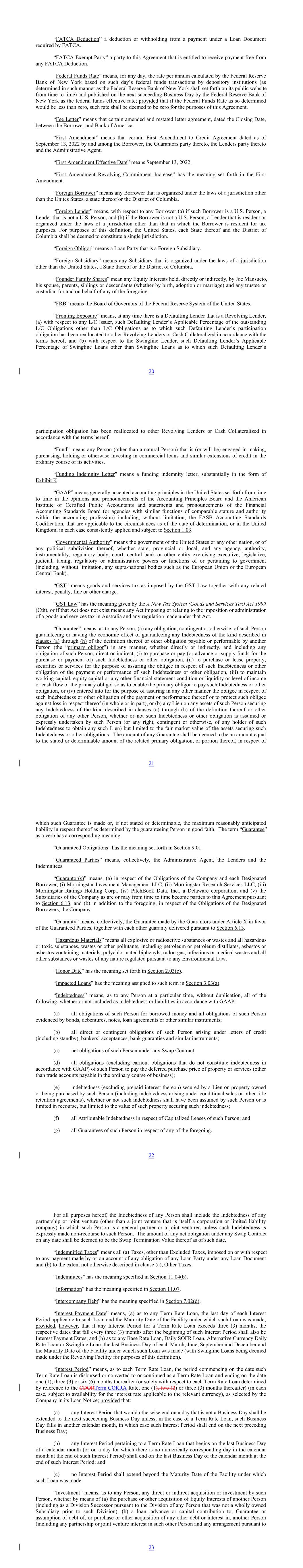 “FATCA Deduction” a deduction or withholding from a payment under a Loan Document required by FATCA. “FATCA Exempt Party” a party to this Agreement that is entitled to receive payment free from any FATCA Deduction. “Federal Funds Rate” means, for any day, the rate per annum calculated by the Federal Reserve Bank of New York based on such day’s federal funds transactions by depository institutions (as determined in such manner as the Federal Reserve Bank of New York shall set forth on its public website from time to time) and published on the next succeeding Business Day by the Federal Reserve Bank of New York as the federal funds effective rate; provided that if the Federal Funds Rate as so determined would be less than zero, such rate shall be deemed to be zero for the purposes of this Agreement. “Fee Letter” means that certain amended and restated letter agreement, dated the Closing Date, between the Borrower and Bank of America. “First Amendment” means that certain First Amendment to Credit Agreement dated as of September 13, 2022 by and among the Borrower, the Guarantors party thereto, the Lenders party thereto and the Administrative Agent. “First Amendment Effective Date” means September 13, 2022. “First Amendment Revolving Commitment Increase” has the meaning set forth in the First Amendment. “Foreign Borrower” means any Borrower that is organized under the laws of a jurisdiction other than the Unites States, a state thereof or the District of Columbia. “Foreign Lender” means, with respect to any Borrower (a) if such Borrower is a U.S. Person, a Lender that is not a U.S. Person, and (b) if the Borrower is not a U.S. Person, a Lender that is resident or organized under the laws of a jurisdiction other than that in which the Borrower is resident for tax purposes. For purposes of this definition, the United States, each State thereof and the District of Columbia shall be deemed to constitute a single jurisdiction. “Foreign Obligor” means a Loan Party that is a Foreign Subsidiary. “Foreign Subsidiary” means any Subsidiary that is organized under the laws of a jurisdiction other than the United States, a State thereof or the District of Columbia. “Founder Family Shares” mean any Equity Interests held, directly or indirectly, by Joe Mansueto, his spouse, parents, siblings or descendants (whether by birth, adoption or marriage) and any trustee or custodian for and on behalf of any of the foregoing. “FRB” means the Board of Governors of the Federal Reserve System of the United States. “Fronting Exposure” means, at any time there is a Defaulting Lender that is a Revolving Lender, (a) with respect to any L/C Issuer, such Defaulting Lender’s Applicable Percentage of the outstanding L/C Obligations other than L/C Obligations as to which such Defaulting Lender’s participation obligation has been reallocated to other Revolving Lenders or Cash Collateralized in accordance with the terms hereof, and (b) with respect to the Swingline Lender, such Defaulting Lender’s Applicable Percentage of Swingline Loans other than Swingline Loans as to which such Defaulting Lender’s 20 participation obligation has been reallocated to other Revolving Lenders or Cash Collateralized in accordance with the terms hereof. “Fund” means any Person (other than a natural Person) that is (or will be) engaged in making, purchasing, holding or otherwise investing in commercial loans and similar extensions of credit in the ordinary course of its activities. “Funding Indemnity Letter” means a funding indemnity letter, substantially in the form of Exhibit K. “GAAP” means generally accepted accounting principles in the United States set forth from time to time in the opinions and pronouncements of the Accounting Principles Board and the American Institute of Certified Public Accountants and statements and pronouncements of the Financial Accounting Standards Board (or agencies with similar functions of comparable stature and authority within the accounting profession) including, without limitation, the FASB Accounting Standards Codification, that are applicable to the circumstances as of the date of determination, or in the United Kingdom, in each case consistently applied and subject to Section 1.03. “Governmental Authority” means the government of the United States or any other nation, or of any political subdivision thereof, whether state, provincial or local, and any agency, authority, instrumentality, regulatory body, court, central bank or other entity exercising executive, legislative, judicial, taxing, regulatory or administrative powers or functions of or pertaining to government (including, without limitation, any supra-national bodies such as the European Union or the European Central Bank). “GST” means goods and services tax as imposed by the GST Law together with any related interest, penalty, fine or other charge. “GST Law” has the meaning given by the A New Tax System (Goods and Services Tax) Act 1999 (Cth), or if that Act does not exist means any Act imposing or relating to the imposition or administration of a goods and services tax in Australia and any regulation made under that Act. “Guarantee” means, as to any Person, (a) any obligation, contingent or otherwise, of such Person guaranteeing or having the economic effect of guaranteeing any Indebtedness of the kind described in clauses (a) through (h) of the definition thereof or other obligation payable or performable by another Person (the “primary obligor”) in any manner, whether directly or indirectly, and including any obligation of such Person, direct or indirect, (i) to purchase or pay (or advance or supply funds for the purchase or payment of) such Indebtedness or other obligation, (ii) to purchase or lease property, securities or services for the purpose of assuring the obligee in respect of such Indebtedness or other obligation of the payment or performanc