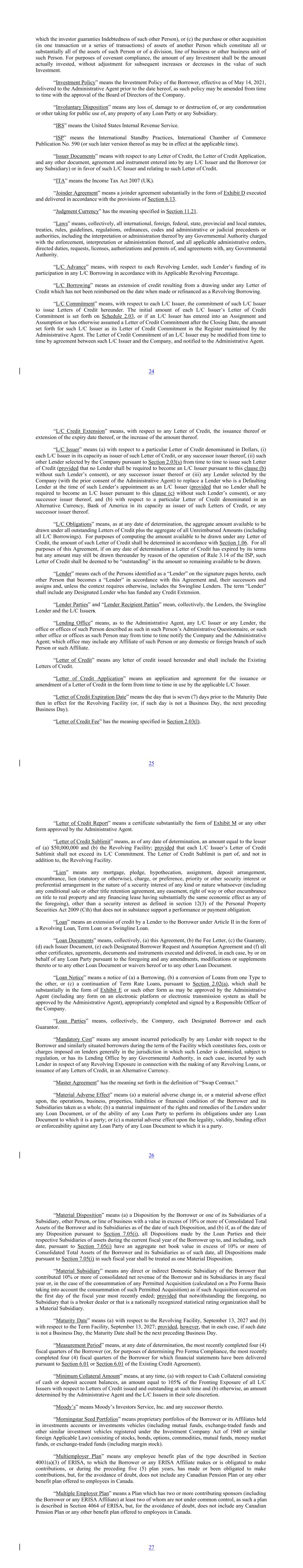 which the investor guaranties Indebtedness of such other Person), or (c) the purchase or other acquisition (in one transaction or a series of transactions) of assets of another Person which constitute all or substantially all of the assets of such Person or of a division, line of business or other business unit of such Person. For purposes of covenant compliance, the amount of any Investment shall be the amount actually invested, without adjustment for subsequent increases or decreases in the value of such Investment. “Investment Policy” means the Investment Policy of the Borrower, effective as of May 14, 2021, delivered to the Administrative Agent prior to the date hereof, as such policy may be amended from time to time with the approval of the Board of Directors of the Company. “Involuntary Disposition” means any loss of, damage to or destruction of, or any condemnation or other taking for public use of, any property of any Loan Party or any Subsidiary. “IRS” means the United States Internal Revenue Service. “ISP” means the International Standby Practices, International Chamber of Commerce Publication No. 590 (or such later version thereof as may be in effect at the applicable time). “Issuer Documents” means with respect to any Letter of Credit, the Letter of Credit Application, and any other document, agreement and instrument entered into by any L/C Issuer and the Borrower (or any Subsidiary) or in favor of such L/C Issuer and relating to such Letter of Credit. “ITA” means the Income Tax Act 2007 (UK). “Joinder Agreement” means a joinder agreement substantially in the form of Exhibit D executed and delivered in accordance with the provisions of Section 6.13. “Judgment Currency” has the meaning specified in Section 11.21. “Laws” means, collectively, all international, foreign, federal, state, provincial and local statutes, treaties, rules, guidelines, regulations, ordinances, codes and administrative or judicial precedents or authorities, including the interpretation or administration thereof by any Governmental Authority charged with the enforcement, interpretation or administration thereof, and all applicable administrative orders, directed duties, requests, licenses, authorizations and permits of, and agreements with, any Governmental Authority. “L/C Advance” means, with respect to each Revolving Lender, such Lender’s funding of its participation in any L/C Borrowing in accordance with its Applicable Revolving Percentage. “L/C Borrowing” means an extension of credit resulting from a drawing under any Letter of Credit which has not been reimbursed on the date when made or refinanced as a Revolving Borrowing. “L/C Commitment” means, with respect to each L/C Issuer, the commitment of such L/C Issuer to issue Letters of Credit hereunder. The initial amount of each L/C Issuer’s Letter of Credit Commitment is set forth on Schedule 2.03, or if an L/C Issuer has entered into an Assignment and Assumption or has otherwise assumed a Letter of Credit Commitment after the Closing Date, the amount set forth for such L/C Issuer as its Letter of Credit Commitment in the Register maintained by the Administrative Agent. The Letter of Credit Commitment of an L/C Issuer may be modified from time to time by agreement between such L/C Issuer and the Company, and notified to the Administrative Agent. 24 “L/C Credit Extension” means, with respect to any Letter of Credit, the issuance thereof or extension of the expiry date thereof, or the increase of the amount thereof. “L/C Issuer” means (a) with respect to a particular Letter of Credit denominated in Dollars, (i) each L/C Issuer in its capacity as issuer of such Letter of Credit, or any successor issuer thereof, (ii) such other Lender selected by the Company pursuant to Section 2.03(s) from time to time to issue such Letter of Credit (provided that no Lender shall be required to become an L/C Issuer pursuant to this clause (b) without such Lender’s consent), or any successor issuer thereof or (iii) any Lender selected by the Company (with the prior consent of the Administrative Agent) to replace a Lender who is a Defaulting Lender at the time of such Lender’s appointment as an L/C Issuer (provided that no Lender shall be required to become an L/C Issuer pursuant to this clause (c) without such Lender’s consent), or any successor issuer thereof, and (b) with respect to a particular Letter of Credit denominated in an Alternative Currency, Bank of America in its capacity as issuer of such Letters of Credit, or any successor issuer thereof. “L/C Obligations” means, as at any date of determination, the aggregate amount available to be drawn under all outstanding Letters of Credit plus the aggregate of all Unreimbursed Amounts (including all L/C Borrowings). For purposes of computing the amount available to be drawn under any Letter of Credit, the amount of such Letter of Credit shall be determined in accordance with Section 1.06. For all purposes of this Agreement, if on any date of determination a Letter of Credit has expired by its terms but any amount may still be drawn thereunder by reason of the operation of Rule 3.14 of the ISP, such Letter of Credit shall be deemed to be “outstanding” in the amount so remaining available to be drawn. “Lender” means each of the Persons identified as a “Lender” on the signature pages hereto, each other Person that becomes a “Lender” in accordance with this Agreement and, their successors and assigns and, unless the context requires otherwise, includes the Swingline Lenders. The term “Lender” shall include any Designated Lender who has funded any Credit Extension. “Lender Parties” and “Lender Recipient Parties” mean, collectively, the Lenders, the Swingline Lender and the L/C Issuers. “Lending Office” means, as to the Administrative Agent, any L/C Issuer or any Lender, the office or offices of such Person described as suc