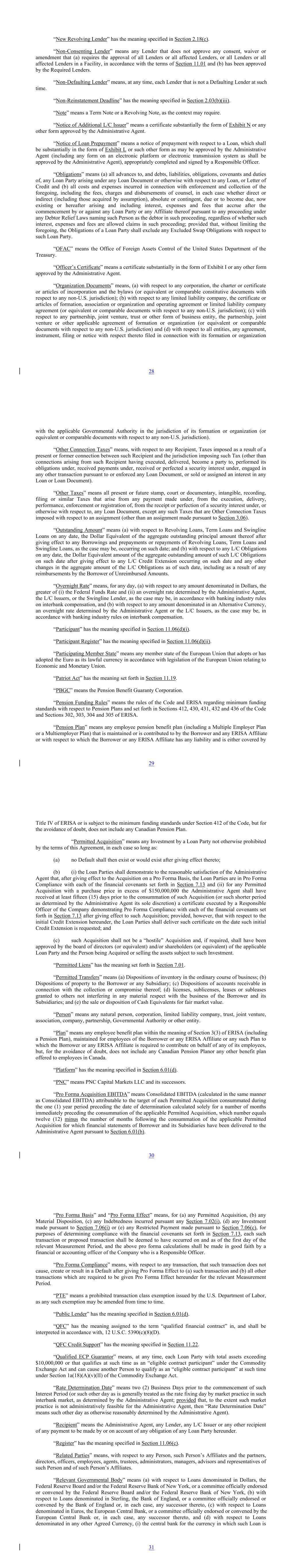 “New Revolving Lender” has the meaning specified in Section 2.18(c). “Non-Consenting Lender” means any Lender that does not approve any consent, waiver or amendment that (a) requires the approval of all Lenders or all affected Lenders, or all Lenders or all affected Lenders in a Facility, in accordance with the terms of Section 11.01 and (b) has been approved by the Required Lenders. “Non-Defaulting Lender” means, at any time, each Lender that is not a Defaulting Lender at such time. “Non-Reinstatement Deadline” has the meaning specified in Section 2.03(b)(iii). “Note” means a Term Note or a Revolving Note, as the context may require. “Notice of Additional L/C Issuer” means a certificate substantially the form of Exhibit N or any other form approved by the Administrative Agent. “Notice of Loan Prepayment” means a notice of prepayment with respect to a Loan, which shall be substantially in the form of Exhibit L or such other form as may be approved by the Administrative Agent (including any form on an electronic platform or electronic transmission system as shall be approved by the Administrative Agent), appropriately completed and signed by a Responsible Officer. “Obligations” means (a) all advances to, and debts, liabilities, obligations, covenants and duties of, any Loan Party arising under any Loan Document or otherwise with respect to any Loan, or Letter of Credit and (b) all costs and expenses incurred in connection with enforcement and collection of the foregoing, including the fees, charges and disbursements of counsel, in each case whether direct or indirect (including those acquired by assumption), absolute or contingent, due or to become due, now existing or hereafter arising and including interest, expenses and fees that accrue after the commencement by or against any Loan Party or any Affiliate thereof pursuant to any proceeding under any Debtor Relief Laws naming such Person as the debtor in such proceeding, regardless of whether such interest, expenses and fees are allowed claims in such proceeding; provided that, without limiting the foregoing, the Obligations of a Loan Party shall exclude any Excluded Swap Obligations with respect to such Loan Party. “OFAC” means the Office of Foreign Assets Control of the United States Department of the Treasury. “Officer’s Certificate” means a certificate substantially in the form of Exhibit I or any other form approved by the Administrative Agent. “Organization Documents” means, (a) with respect to any corporation, the charter or certificate or articles of incorporation and the bylaws (or equivalent or comparable constitutive documents with respect to any non-U.S. jurisdiction); (b) with respect to any limited liability company, the certificate or articles of formation, association or organization and operating agreement or limited liability company agreement (or equivalent or comparable documents with respect to any non-U.S. jurisdiction); (c) with respect to any partnership, joint venture, trust or other form of business entity, the partnership, joint venture or other applicable agreement of formation or organization (or equivalent or comparable documents with respect to any non-U.S. jurisdiction) and (d) with respect to all entities, any agreement, instrument, filing or notice with respect thereto filed in connection with its formation or organization 28 with the applicable Governmental Authority in the jurisdiction of its formation or organization (or equivalent or comparable documents with respect to any non-U.S. jurisdiction). “Other Connection Taxes” means, with respect to any Recipient, Taxes imposed as a result of a present or former connection between such Recipient and the jurisdiction imposing such Tax (other than connections arising from such Recipient having executed, delivered, become a party to, performed its obligations under, received payments under, received or perfected a security interest under, engaged in any other transaction pursuant to or enforced any Loan Document, or sold or assigned an interest in any Loan or Loan Document). “Other Taxes” means all present or future stamp, court or documentary, intangible, recording, filing or similar Taxes that arise from any payment made under, from the execution, delivery, performance, enforcement or registration of, from the receipt or perfection of a security interest under, or otherwise with respect to, any Loan Document, except any such Taxes that are Other Connection Taxes imposed with respect to an assignment (other than an assignment made pursuant to Section 3.06). “Outstanding Amount” means (a) with respect to Revolving Loans, Term Loans and Swingline Loans on any date, the Dollar Equivalent of the aggregate outstanding principal amount thereof after giving effect to any Borrowings and prepayments or repayments of Revolving Loans, Term Loans and Swingline Loans, as the case may be, occurring on such date; and (b) with respect to any L/C Obligations on any date, the Dollar Equivalent amount of the aggregate outstanding amount of such L/C Obligations on such date after giving effect to any L/C Credit Extension occurring on such date and any other changes in the aggregate amount of the L/C Obligations as of such date, including as a result of any reimbursements by the Borrower of Unreimbursed Amounts. “Overnight Rate” means, for any day, (a) with respect to any amount denominated in Dollars, the greater of (i) the Federal Funds Rate and (ii) an overnight rate determined by the Administrative Agent, the L/C Issuers, or the Swingline Lender, as the case may be, in accordance with banking industry rules on interbank compensation, and (b) with respect to any amount denominated in an Alternative Currency, an overnight rate determined by the Administrative Agent or the L/C Issuers, as the case may be, in accordance with banking industry rules on interbank compensation. “Participant” has the meaning specified