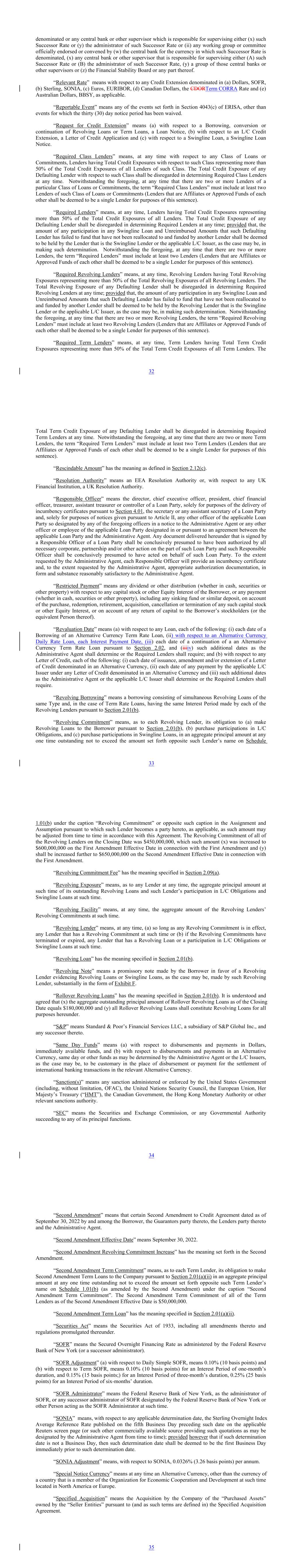 denominated or any central bank or other supervisor which is responsible for supervising either (x) such Successor Rate or (y) the administrator of such Successor Rate or (ii) any working group or committee officially endorsed or convened by (w) the central bank for the currency in which such Successor Rate is denominated, (x) any central bank or other supervisor that is responsible for supervising either (A) such Successor Rate or (B) the administrator of such Successor Rate, (y) a group of those central banks or other supervisors or (z) the Financial Stability Board or any part thereof. “Relevant Rate” means with respect to any Credit Extension denominated in (a) Dollars, SOFR, (b) Sterling, SONIA, (c) Euros, EURIBOR, (d) Canadian Dollars, the CDORTerm CORRA Rate and (e) Australian Dollars, BBSY, as applicable. “Reportable Event” means any of the events set forth in Section 4043(c) of ERISA, other than events for which the thirty (30) day notice period has been waived. “Request for Credit Extension” means (a) with respect to a Borrowing, conversion or continuation of Revolving Loans or Term Loans, a Loan Notice, (b) with respect to an L/C Credit Extension, a Letter of Credit Application and (c) with respect to a Swingline Loan, a Swingline Loan Notice. “Required Class Lenders” means, at any time with respect to any Class of Loans or Commitments, Lenders having Total Credit Exposures with respect to such Class representing more than 50% of the Total Credit Exposures of all Lenders of such Class. The Total Credit Exposure of any Defaulting Lender with respect to such Class shall be disregarded in determining Required Class Lenders at any time. Notwithstanding the foregoing, at any time that there are two or more Lenders of a particular Class of Loans or Commitments, the term “Required Class Lenders” must include at least two Lenders of such Class of Loans or Commitments (Lenders that are Affiliates or Approved Funds of each other shall be deemed to be a single Lender for purposes of this sentence). “Required Lenders” means, at any time, Lenders having Total Credit Exposures representing more than 50% of the Total Credit Exposures of all Lenders. The Total Credit Exposure of any Defaulting Lender shall be disregarded in determining Required Lenders at any time; provided that, the amount of any participation in any Swingline Loan and Unreimbursed Amounts that such Defaulting Lender has failed to fund that have not been reallocated to and funded by another Lender shall be deemed to be held by the Lender that is the Swingline Lender or the applicable L/C Issuer, as the case may be, in making such determination. Notwithstanding the foregoing, at any time that there are two or more Lenders, the term “Required Lenders” must include at least two Lenders (Lenders that are Affiliates or Approved Funds of each other shall be deemed to be a single Lender for purposes of this sentence). “Required Revolving Lenders” means, at any time, Revolving Lenders having Total Revolving Exposures representing more than 50% of the Total Revolving Exposures of all Revolving Lenders. The Total Revolving Exposure of any Defaulting Lender shall be disregarded in determining Required Revolving Lenders at any time; provided that, the amount of any participation in any Swingline Loan and Unreimbursed Amounts that such Defaulting Lender has failed to fund that have not been reallocated to and funded by another Lender shall be deemed to be held by the Revolving Lender that is the Swingline Lender or the applicable L/C Issuer, as the case may be, in making such determination. Notwithstanding the foregoing, at any time that there are two or more Revolving Lenders, the term “Required Revolving Lenders” must include at least two Revolving Lenders (Lenders that are Affiliates or Approved Funds of each other shall be deemed to be a single Lender for purposes of this sentence). “Required Term Lenders” means, at any time, Term Lenders having Total Term Credit Exposures representing more than 50% of the Total Term Credit Exposures of all Term Lenders. The 32 Total Term Credit Exposure of any Defaulting Lender shall be disregarded in determining Required Term Lenders at any time. Notwithstanding the foregoing, at any time that there are two or more Term Lenders, the term “Required Term Lenders” must include at least two Term Lenders (Lenders that are Affiliates or Approved Funds of each other shall be deemed to be a single Lender for purposes of this sentence). “Rescindable Amount” has the meaning as defined in Section 2.12(c). “Resolution Authority” means an EEA Resolution Authority or, with respect to any UK Financial Institution, a UK Resolution Authority. “Responsible Officer” means the director, chief executive officer, president, chief financial officer, treasurer, assistant treasurer or controller of a Loan Party, solely for purposes of the delivery of incumbency certificates pursuant to Section 4.01, the secretary or any assistant secretary of a Loan Party and, solely for purposes of notices given pursuant to Article II, any other officer of the applicable Loan Party so designated by any of the foregoing officers in a notice to the Administrative Agent or any other officer or employee of the applicable Loan Party designated in or pursuant to an agreement between the applicable Loan Party and the Administrative Agent. Any document delivered hereunder that is signed by a Responsible Officer of a Loan Party shall be conclusively presumed to have been authorized by all necessary corporate, partnership and/or other action on the part of such Loan Party and such Responsible Officer shall be conclusively presumed to have acted on behalf of such Loan Party. To the extent requested by the Administrative Agent, each Responsible Officer will provide an incumbency certificate and, to the extent requested by the Administrative Agent, appropriate authorization documentation, in form