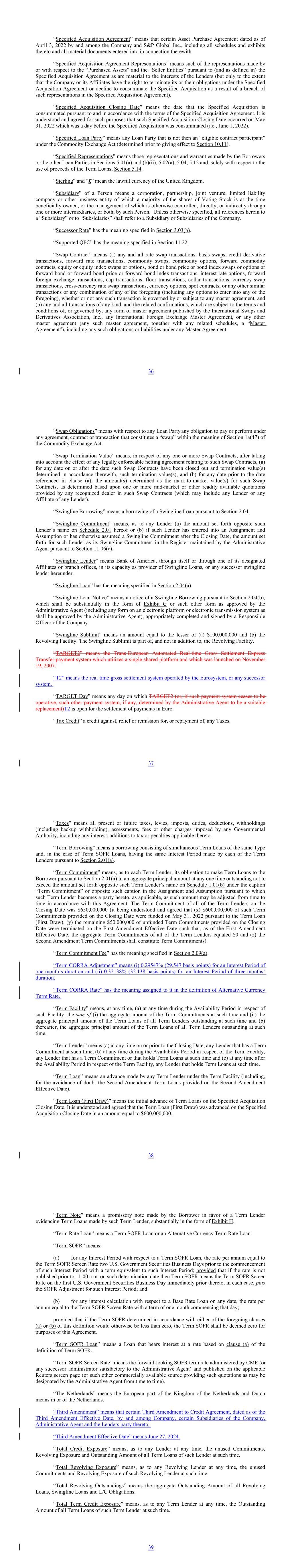 “Specified Acquisition Agreement” means that certain Asset Purchase Agreement dated as of April 3, 2022 by and among the Company and S&P Global Inc., including all schedules and exhibits thereto and all material documents entered into in connection therewith. “Specified Acquisition Agreement Representations” means such of the representations made by or with respect to the “Purchased Assets” and the “Seller Entities” pursuant to (and as defined in) the Specified Acquisition Agreement as are material to the interests of the Lenders (but only to the extent that the Company or its Affiliates have the right to terminate its or their obligations under the Specified Acquisition Agreement or decline to consummate the Specified Acquisition as a result of a breach of such representations in the Specified Acquisition Agreement). “Specified Acquisition Closing Date” means the date that the Specified Acquisition is consummated pursuant to and in accordance with the terms of the Specified Acquisition Agreement. It is understood and agreed for such purposes that such Specified Acquisition Closing Date occurred on May 31, 2022 which was a day before the Specified Acquisition was consummated (i.e., June 1, 2022). “Specified Loan Party” means any Loan Party that is not then an “eligible contract participant” under the Commodity Exchange Act (determined prior to giving effect to Section 10.11). “Specified Representations” means those representations and warranties made by the Borrowers or the other Loan Parties in Sections 5.01(a) and (b)(ii), 5.02(a), 5.04, 5.12 and, solely with respect to the use of proceeds of the Term Loans, Section 5.14. “Sterling” and “£” mean the lawful currency of the United Kingdom. “Subsidiary” of a Person means a corporation, partnership, joint venture, limited liability company or other business entity of which a majority of the shares of Voting Stock is at the time beneficially owned, or the management of which is otherwise controlled, directly, or indirectly through one or more intermediaries, or both, by such Person. Unless otherwise specified, all references herein to a “Subsidiary” or to “Subsidiaries” shall refer to a Subsidiary or Subsidiaries of the Company. “Successor Rate” has the meaning specified in Section 3.03(b). “Supported QFC” has the meaning specified in Section 11.22. “Swap Contract” means (a) any and all rate swap transactions, basis swaps, credit derivative transactions, forward rate transactions, commodity swaps, commodity options, forward commodity contracts, equity or equity index swaps or options, bond or bond price or bond index swaps or options or forward bond or forward bond price or forward bond index transactions, interest rate options, forward foreign exchange transactions, cap transactions, floor transactions, collar transactions, currency swap transactions, cross-currency rate swap transactions, currency options, spot contracts, or any other similar transactions or any combination of any of the foregoing (including any options to enter into any of the foregoing), whether or not any such transaction is governed by or subject to any master agreement, and (b) any and all transactions of any kind, and the related confirmations, which are subject to the terms and conditions of, or governed by, any form of master agreement published by the International Swaps and Derivatives Association, Inc., any International Foreign Exchange Master Agreement, or any other master agreement (any such master agreement, together with any related schedules, a “Master Agreement”), including any such obligations or liabilities under any Master Agreement. 36 “Swap Obligations” means with respect to any Loan Party any obligation to pay or perform under any agreement, contract or transaction that constitutes a “swap” within the meaning of Section 1a(47) of the Commodity Exchange Act. “Swap Termination Value” means, in respect of any one or more Swap Contracts, after taking into account the effect of any legally enforceable netting agreement relating to such Swap Contracts, (a) for any date on or after the date such Swap Contracts have been closed out and termination value(s) determined in accordance therewith, such termination value(s), and (b) for any date prior to the date referenced in clause (a), the amount(s) determined as the mark-to-market value(s) for such Swap Contracts, as determined based upon one or more mid-market or other readily available quotations provided by any recognized dealer in such Swap Contracts (which may include any Lender or any Affiliate of any Lender). “Swingline Borrowing” means a borrowing of a Swingline Loan pursuant to Section 2.04. “Swingline Commitment” means, as to any Lender (a) the amount set forth opposite such Lender’s name on Schedule 2.01 hereof or (b) if such Lender has entered into an Assignment and Assumption or has otherwise assumed a Swingline Commitment after the Closing Date, the amount set forth for such Lender as its Swingline Commitment in the Register maintained by the Administrative Agent pursuant to Section 11.06(c). “Swingline Lender” means Bank of America, through itself or through one of its designated Affiliates or branch offices, in its capacity as provider of Swingline Loans, or any successor swingline lender hereunder. “Swingline Loan” has the meaning specified in Section 2.04(a). “Swingline Loan Notice” means a notice of a Swingline Borrowing pursuant to Section 2.04(b), which shall be substantially in the form of Exhibit G or such other form as approved by the Administrative Agent (including any form on an electronic platform or electronic transmission system as shall be approved by the Administrative Agent), appropriately completed and signed by a Responsible Officer of the Company. “Swingline Sublimit” means an amount equal to the lesser of (a) $100,000,000 and (b) the Revolving Facility. The Swingline S