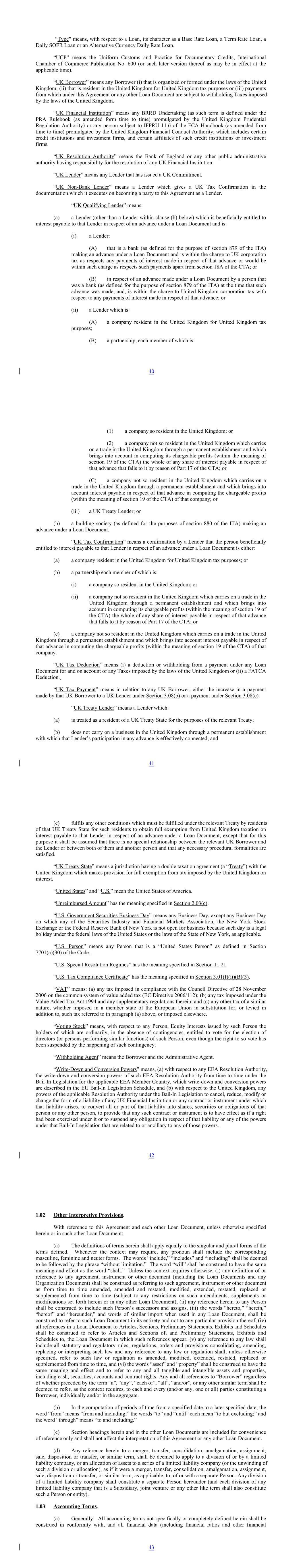 “Type” means, with respect to a Loan, its character as a Base Rate Loan, a Term Rate Loan, a Daily SOFR Loan or an Alternative Currency Daily Rate Loan. “UCP” means the Uniform Customs and Practice for Documentary Credits, International Chamber of Commerce Publication No. 600 (or such later version thereof as may be in effect at the applicable time). “UK Borrower” means any Borrower (i) that is organized or formed under the laws of the United Kingdom; (ii) that is resident in the United Kingdom for United Kingdom tax purposes or (iii) payments from which under this Agreement or any other Loan Document are subject to withholding Taxes imposed by the laws of the United Kingdom. “UK Financial Institution” means any BRRD Undertaking (as such term is defined under the PRA Rulebook (as amended form time to time) promulgated by the United Kingdom Prudential Regulation Authority) or any person subject to IFPRU 11.6 of the FCA Handbook (as amended from time to time) promulgated by the United Kingdom Financial Conduct Authority, which includes certain credit institutions and investment firms, and certain affiliates of such credit institutions or investment firms. “UK Resolution Authority” means the Bank of England or any other public administrative authority having responsibility for the resolution of any UK Financial Institution. “UK Lender” means any Lender that has issued a UK Commitment. “UK Non-Bank Lender” means a Lender which gives a UK Tax Confirmation in the documentation which it executes on becoming a party to this Agreement as a Lender. “UK Qualifying Lender” means: (a) a Lender (other than a Lender within clause (b) below) which is beneficially entitled to interest payable to that Lender in respect of an advance under a Loan Document and is: (i) a Lender: (A) that is a bank (as defined for the purpose of section 879 of the ITA) making an advance under a Loan Document and is within the charge to UK corporation tax as respects any payments of interest made in respect of that advance or would be within such charge as respects such payments apart from section 18A of the CTA; or (B) in respect of an advance made under a Loan Document by a person that was a bank (as defined for the purpose of section 879 of the ITA) at the time that such advance was made, and, is within the charge to United Kingdom corporation tax with respect to any payments of interest made in respect of that advance; or (ii) a Lender which is: (A) a company resident in the United Kingdom for United Kingdom tax purposes; (B) a partnership, each member of which is: 40 (1) a company so resident in the United Kingdom; or (2) a company not so resident in the United Kingdom which carries on a trade in the United Kingdom through a permanent establishment and which brings into account in computing its chargeable profits (within the meaning of section 19 of the CTA) the whole of any share of interest payable in respect of that advance that falls to it by reason of Part 17 of the CTA; or (C) a company not so resident in the United Kingdom which carries on a trade in the United Kingdom through a permanent establishment and which brings into account interest payable in respect of that advance in computing the chargeable profits (within the meaning of section 19 of the CTA) of that company; or (iii) a UK Treaty Lender; or (b) a building society (as defined for the purposes of section 880 of the ITA) making an advance under a Loan Document. “UK Tax Confirmation” means a confirmation by a Lender that the person beneficially entitled to interest payable to that Lender in respect of an advance under a Loan Document is either: (a) a company resident in the United Kingdom for United Kingdom tax purposes; or (b) a partnership each member of which is: (i) a company so resident in the United Kingdom; or (ii) a company not so resident in the United Kingdom which carries on a trade in the United Kingdom through a permanent establishment and which brings into account in computing its chargeable profits (within the meaning of section 19 of the CTA) the whole of any share of interest payable in respect of that advance that falls to it by reason of Part 17 of the CTA; or (c) a company not so resident in the United Kingdom which carries on a trade in the United Kingdom through a permanent establishment and which brings into account interest payable in respect of that advance in computing the chargeable profits (within the meaning of section 19 of the CTA) of that company. “UK Tax Deduction” means (i) a deduction or withholding from a payment under any Loan Document for and on account of any Taxes imposed by the laws of the United Kingdom or (ii) a FATCA Deduction. “UK Tax Payment” means in relation to any UK Borrower, either the increase in a payment made by that UK Borrower to a UK Lender under Section 3.08(b) or a payment under Section 3.08(c). “UK Treaty Lender” means a Lender which: (a) is treated as a resident of a UK Treaty State for the purposes of the relevant Treaty; (b) does not carry on a business in the United Kingdom through a permanent establishment with which that Lender’s participation in any advance is effectively connected; and 41 (c) fulfils any other conditions which must be fulfilled under the relevant Treaty by residents of that UK Treaty State for such residents to obtain full exemption from United Kingdom taxation on interest payable to that Lender in respect of an advance under a Loan Document, except that for this purpose it shall be assumed that there is no special relationship between the relevant UK Borrower and the Lender or between both of them and another person and that any necessary procedural formalities are satisfied. “UK Treaty State” means a jurisdiction having a double taxation agreement (a “Treaty”) with the United Kingdom which makes provision for full exemption from tax imposed by the United Kingdom on interest. “United States” and “U.S.” mean