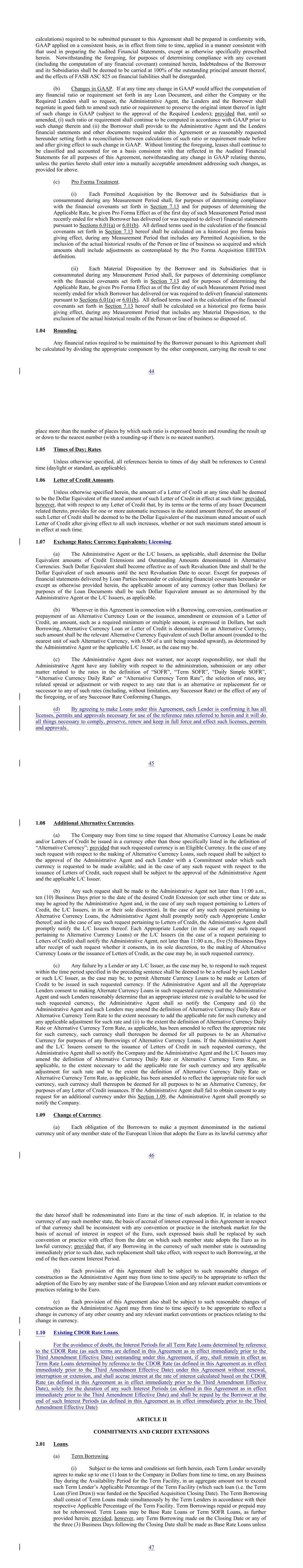 calculations) required to be submitted pursuant to this Agreement shall be prepared in conformity with, GAAP applied on a consistent basis, as in effect from time to time, applied in a manner consistent with that used in preparing the Audited Financial Statements, except as otherwise specifically prescribed herein. Notwithstanding the foregoing, for purposes of determining compliance with any covenant (including the computation of any financial covenant) contained herein, Indebtedness of the Borrower and its Subsidiaries shall be deemed to be carried at 100% of the outstanding principal amount thereof, and the effects of FASB ASC 825 on financial liabilities shall be disregarded. (b) Changes in GAAP. If at any time any change in GAAP would affect the computation of any financial ratio or requirement set forth in any Loan Document, and either the Company or the Required Lenders shall so request, the Administrative Agent, the Lenders and the Borrower shall negotiate in good faith to amend such ratio or requirement to preserve the original intent thereof in light of such change in GAAP (subject to the approval of the Required Lenders); provided that, until so amended, (i) such ratio or requirement shall continue to be computed in accordance with GAAP prior to such change therein and (ii) the Borrower shall provide to the Administrative Agent and the Lenders financial statements and other documents required under this Agreement or as reasonably requested hereunder setting forth a reconciliation between calculations of such ratio or requirement made before and after giving effect to such change in GAAP. Without limiting the foregoing, leases shall continue to be classified and accounted for on a basis consistent with that reflected in the Audited Financial Statements for all purposes of this Agreement, notwithstanding any change in GAAP relating thereto, unless the parties hereto shall enter into a mutually acceptable amendment addressing such changes, as provided for above. (c) Pro Forma Treatment. (i) Each Permitted Acquisition by the Borrower and its Subsidiaries that is consummated during any Measurement Period shall, for purposes of determining compliance with the financial covenants set forth in Section 7.13 and for purposes of determining the Applicable Rate, be given Pro Forma Effect as of the first day of such Measurement Period most recently ended for which Borrower has delivered (or was required to deliver) financial statements pursuant to Sections 6.01(a) or 6.01(b). All defined terms used in the calculation of the financial covenants set forth in Section 7.13 hereof shall be calculated on a historical pro forma basis giving effect, during any Measurement Period that includes any Permitted Acquisition, to the inclusion of the actual historical results of the Person or line of business so acquired and which amounts shall include adjustments as contemplated by the Pro Forma Acquisition EBITDA definition. (ii) Each Material Disposition by the Borrower and its Subsidiaries that is consummated during any Measurement Period shall, for purposes of determining compliance with the financial covenants set forth in Section 7.13 and for purposes of determining the Applicable Rate, be given Pro Forma Effect as of the first day of such Measurement Period most recently ended for which Borrower has delivered (or was required to deliver) financial statements pursuant to Sections 6.01(a) or 6.01(b). All defined terms used in the calculation of the financial covenants set forth in Section 7.13 hereof shall be calculated on a historical pro forma basis giving effect, during any Measurement Period that includes any Material Disposition, to the exclusion of the actual historical results of the Person or line of business so disposed of. 1.04 Rounding. Any financial ratios required to be maintained by the Borrower pursuant to this Agreement shall be calculated by dividing the appropriate component by the other component, carrying the result to one 44 place more than the number of places by which such ratio is expressed herein and rounding the result up or down to the nearest number (with a rounding-up if there is no nearest number). 1.05 Times of Day; Rates. Unless otherwise specified, all references herein to times of day shall be references to Central time (daylight or standard, as applicable). 1.06 Letter of Credit Amounts. Unless otherwise specified herein, the amount of a Letter of Credit at any time shall be deemed to be the Dollar Equivalent of the stated amount of such Letter of Credit in effect at such time; provided, however, that with respect to any Letter of Credit that, by its terms or the terms of any Issuer Document related thereto, provides for one or more automatic increases in the stated amount thereof, the amount of such Letter of Credit shall be deemed to be the Dollar Equivalent of the maximum stated amount of such Letter of Credit after giving effect to all such increases, whether or not such maximum stated amount is in effect at such time. 1.07 Exchange Rates; Currency Equivalents; Licensing. (a) The Administrative Agent or the L/C Issuers, as applicable, shall determine the Dollar Equivalent amounts of Credit Extensions and Outstanding Amounts denominated in Alternative Currencies. Such Dollar Equivalent shall become effective as of such Revaluation Date and shall be the Dollar Equivalent of such amounts until the next Revaluation Date to occur. Except for purposes of financial statements delivered by Loan Parties hereunder or calculating financial covenants hereunder or except as otherwise provided herein, the applicable amount of any currency (other than Dollars) for purposes of the Loan Documents shall be such Dollar Equivalent amount as so determined by the Administrative Agent or the L/C Issuers, as applicable. (b) Wherever in this Agreement in connection with a Borrowing, conversion, continuation or prepayment of an Alternative Currency Loan or the issuance, amendment or ext