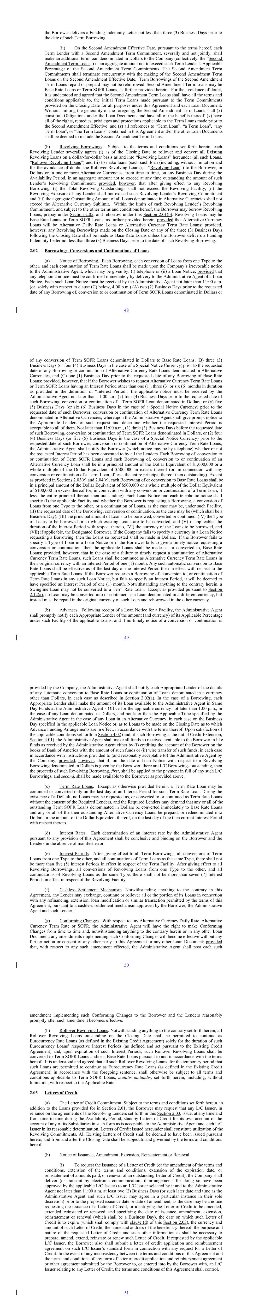 the Borrower delivers a Funding Indemnity Letter not less than three (3) Business Days prior to the date of such Term Borrowing. (ii) On the Second Amendment Effective Date, pursuant to the terms hereof, each Term Lender with a Second Amendment Term Commitment, severally and not jointly, shall make an additional term loan denominated in Dollars to the Company (collectively, the “Second Amendment Term Loans”) in an aggregate amount not to exceed such Term Lender’s Applicable Percentage of the Second Amendment Term Commitments. The Second Amendment Term Commitments shall terminate concurrently with the making of the Second Amendment Term Loans on the Second Amendment Effective Date. Term Borrowings of the Second Amendment Term Loans repaid or prepaid may not be reborrowed. Second Amendment Term Loans may be Base Rate Loans or Term SOFR Loans, as further provided herein. For the avoidance of doubt, it is understood and agreed that the Second Amendment Term Loans shall have all the terms and conditions applicable to, the initial Term Loans made pursuant to the Term Commitments provided on the Closing Date for all purposes under this Agreement and each Loan Document. Without limiting the generality of the foregoing, the Second Amendment Term Loans shall (x) constitute Obligations under the Loan Documents and have all of the benefits thereof, (x) have all of the rights, remedies, privileges and protections applicable to the Term Loans made prior to the Second Amendment Effective and (z) all references to “Term Loan”, “a Term Loan”, “any Term Loan”, or “the Term Loans” contained in this Agreement and/or the other Loan Documents shall be deemed to include the Second Amendment Term Loans. (b) Revolving Borrowings. Subject to the terms and conditions set forth herein, each Revolving Lender severally agrees (i) as of the Closing Date to rollover and convert all Existing Revolving Loans on a dollar-for-dollar basis as and into “Revolving Loans” hereunder (all such Loans, “Rollover Revolving Loans”) and (ii) to make loans (each such loan (including, without limitation and for the avoidance of doubt, the Rollover Revolving Loans), a “Revolving Loan”) to the Borrower, in Dollars or in one or more Alternative Currencies, from time to time, on any Business Day during the Availability Period, in an aggregate amount not to exceed at any time outstanding the amount of such Lender’s Revolving Commitment; provided, however, that after giving effect to any Revolving Borrowing, (i) the Total Revolving Outstandings shall not exceed the Revolving Facility, (ii) the Revolving Exposure of any Lender shall not exceed such Revolving Lender’s Revolving Commitment and (iii) the aggregate Outstanding Amount of all Loans denominated in Alternative Currencies shall not exceed the Alternative Currency Sublimit. Within the limits of each Revolving Lender’s Revolving Commitment, and subject to the other terms and conditions hereof, the Borrower may borrow Revolving Loans, prepay under Section 2.05, and reborrow under this Section 2.01(b). Revolving Loans may be Base Rate Loans or Term SOFR Loans, as further provided herein, provided that Alternative Currency Loans will be Alternative Daily Rate Loans or Alternative Currency Term Rate Loans; provided, however, any Revolving Borrowings made on the Closing Date or any of the three (3) Business Days following the Closing Date shall be made as Base Rate Loans unless the Borrower delivers a Funding Indemnity Letter not less than three (3) Business Days prior to the date of such Revolving Borrowing. 2.02 Borrowings, Conversions and Continuations of Loans. (a) Notice of Borrowing. Each Borrowing, each conversion of Loans from one Type to the other, and each continuation of Term Rate Loans shall be made upon the Company’s irrevocable notice to the Administrative Agent, which may be given by: (i) telephone or (ii) a Loan Notice; provided that any telephonic notice must be confirmed immediately by delivery to the Administrative Agent of a Loan Notice. Each such Loan Notice must be received by the Administrative Agent not later than 11:00 a.m. (or, solely with respect to clause (C) below, 4:00 p.m.) (A) two (2) Business Days prior to the requested date of any Borrowing of, conversion to or continuation of Term SOFR Loans denominated in Dollars or 48 of any conversion of Term SOFR Loans denominated in Dollars to Base Rate Loans, (B) three (3) Business Days (or four (4) Business Days in the case of a Special Notice Currency) prior to the requested date of any Borrowing or continuation of Alternative Currency Rate Loans denominated in Alternative Currencies, and (C) one (1) Business Day prior to the requested date of any Borrowing of Base Rate Loans; provided, however, that if the Borrower wishes to request Alternative Currency Term Rate Loans or Term SOFR Loans having an Interest Period other than one (1), three (3) or six (6) months in duration as provided in the definition of “Interest Period”, the applicable notice must be received by the Administrative Agent not later than 11:00 a.m. (x) four (4) Business Days prior to the requested date of such Borrowing, conversion or continuation of a Term SOFR Loan denominated in Dollars, or (y) five (5) Business Days (or six (6) Business Days in the case of a Special Notice Currency) prior to the requested date of such Borrower, conversion or continuation of Alternative Currency Term Rate Loans denominated in Alternative Currencies, whereupon the Administrative Agent shall give prompt notice to the Appropriate Lenders of such request and determine whether the requested Interest Period is acceptable to all of them. Not later than 11:00 a.m., (1) three (3) Business Days before the requested date of such Borrowing, conversion or continuation of Term SOFR Loans denominated in Dollars, or (2) four (4) Business Days (or five (5) Business Days in the case of a Special Notice Currency) prior to the requested 