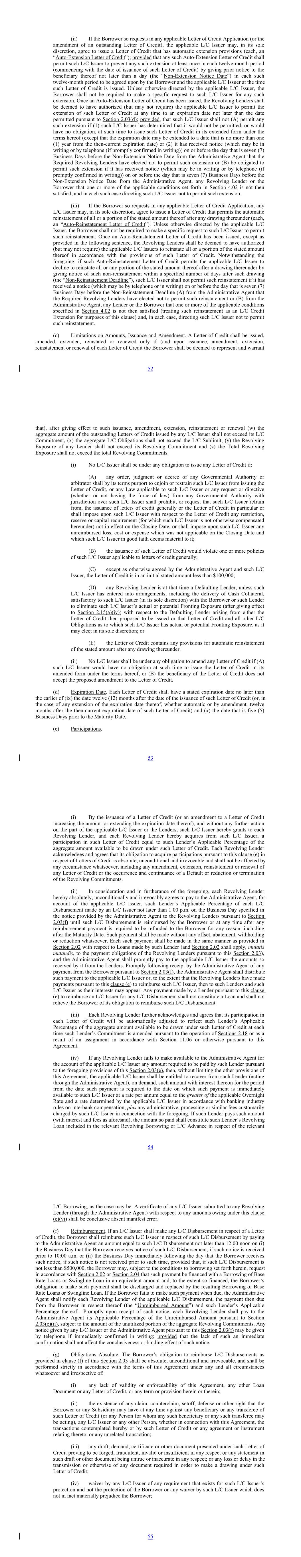 (ii) If the Borrower so requests in any applicable Letter of Credit Application (or the amendment of an outstanding Letter of Credit), the applicable L/C Issuer may, in its sole discretion, agree to issue a Letter of Credit that has automatic extension provisions (each, an “Auto-Extension Letter of Credit”); provided that any such Auto-Extension Letter of Credit shall permit such L/C Issuer to prevent any such extension at least once in each twelve-month period (commencing with the date of issuance of such Letter of Credit) by giving prior notice to the beneficiary thereof not later than a day (the “Non-Extension Notice Date”) in each such twelve-month period to be agreed upon by the Borrower and the applicable L/C Issuer at the time such Letter of Credit is issued. Unless otherwise directed by the applicable L/C Issuer, the Borrower shall not be required to make a specific request to such L/C Issuer for any such extension. Once an Auto-Extension Letter of Credit has been issued, the Revolving Lenders shall be deemed to have authorized (but may not require) the applicable L/C Issuer to permit the extension of such Letter of Credit at any time to an expiration date not later than the date permitted pursuant to Section 2.03(d); provided, that such L/C Issuer shall not (A) permit any such extension if (1) such L/C Issuer has determined that it would not be permitted, or would have no obligation, at such time to issue such Letter of Credit in its extended form under the terms hereof (except that the expiration date may be extended to a date that is no more than one (1) year from the then-current expiration date) or (2) it has received notice (which may be in writing or by telephone (if promptly confirmed in writing)) on or before the day that is seven (7) Business Days before the Non-Extension Notice Date from the Administrative Agent that the Required Revolving Lenders have elected not to permit such extension or (B) be obligated to permit such extension if it has received notice (which may be in writing or by telephone (if promptly confirmed in writing)) on or before the day that is seven (7) Business Days before the Non-Extension Notice Date from the Administrative Agent, any Revolving Lender or the Borrower that one or more of the applicable conditions set forth in Section 4.02 is not then satisfied, and in each such case directing such L/C Issuer not to permit such extension. (iii) If the Borrower so requests in any applicable Letter of Credit Application, any L/C Issuer may, in its sole discretion, agree to issue a Letter of Credit that permits the automatic reinstatement of all or a portion of the stated amount thereof after any drawing thereunder (each, an “Auto-Reinstatement Letter of Credit”). Unless otherwise directed by the applicable L/C Issuer, the Borrower shall not be required to make a specific request to such L/C Issuer to permit such reinstatement. Once an Auto-Reinstatement Letter of Credit has been issued, except as provided in the following sentence, the Revolving Lenders shall be deemed to have authorized (but may not require) the applicable L/C Issuers to reinstate all or a portion of the stated amount thereof in accordance with the provisions of such Letter of Credit. Notwithstanding the foregoing, if such Auto-Reinstatement Letter of Credit permits the applicable L/C Issuer to decline to reinstate all or any portion of the stated amount thereof after a drawing thereunder by giving notice of such non-reinstatement within a specified number of days after such drawing (the “Non-Reinstatement Deadline”), such L/C Issuer shall not permit such reinstatement if it has received a notice (which may be by telephone or in writing) on or before the day that is seven (7) Business Days before the Non-Reinstatement Deadline (A) from the Administrative Agent that the Required Revolving Lenders have elected not to permit such reinstatement or (B) from the Administrative Agent, any Lender or the Borrower that one or more of the applicable conditions specified in Section 4.02 is not then satisfied (treating such reinstatement as an L/C Credit Extension for purposes of this clause) and, in each case, directing such L/C Issuer not to permit such reinstatement. (c) Limitations on Amounts, Issuance and Amendment. A Letter of Credit shall be issued, amended, extended, reinstated or renewed only if (and upon issuance, amendment, extension, reinstatement or renewal of each Letter of Credit the Borrower shall be deemed to represent and warrant 52 that), after giving effect to such issuance, amendment, extension, reinstatement or renewal (w) the aggregate amount of the outstanding Letters of Credit issued by any L/C Issuer shall not exceed its L/C Commitment, (x) the aggregate L/C Obligations shall not exceed the L/C Sublimit, (y) the Revolving Exposure of any Lender shall not exceed its Revolving Commitment and (z) the Total Revolving Exposure shall not exceed the total Revolving Commitments. (i) No L/C Issuer shall be under any obligation to issue any Letter of Credit if: (A) any order, judgment or decree of any Governmental Authority or arbitrator shall by its terms purport to enjoin or restrain such L/C Issuer from issuing the Letter of Credit, or any Law applicable to such L/C Issuer or any request or directive (whether or not having the force of law) from any Governmental Authority with jurisdiction over such L/C Issuer shall prohibit, or request that such L/C Issuer refrain from, the issuance of letters of credit generally or the Letter of Credit in particular or shall impose upon such L/C Issuer with respect to the Letter of Credit any restriction, reserve or capital requirement (for which such L/C Issuer is not otherwise compensated hereunder) not in effect on the Closing Date, or shall impose upon such L/C Issuer any unreimbursed loss, cost or expense which was not applicable on the Closing Date and which such L/C Issuer in good faith deems material to it; (B) the iss