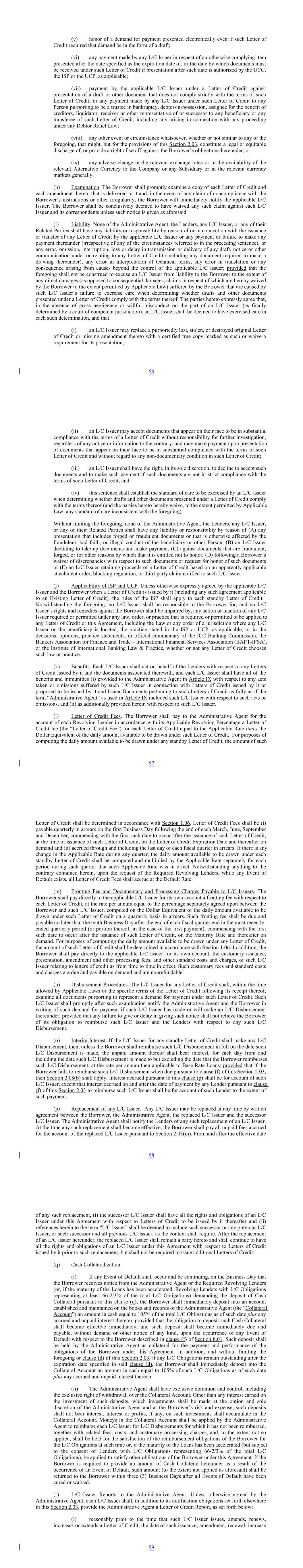 (v) honor of a demand for payment presented electronically even if such Letter of Credit required that demand be in the form of a draft; (vi) any payment made by any L/C Issuer in respect of an otherwise complying item presented after the date specified as the expiration date of, or the date by which documents must be received under such Letter of Credit if presentation after such date is authorized by the UCC, the ISP or the UCP, as applicable; (vii) payment by the applicable L/C Issuer under a Letter of Credit against presentation of a draft or other document that does not comply strictly with the terms of such Letter of Credit; or any payment made by any L/C Issuer under such Letter of Credit to any Person purporting to be a trustee in bankruptcy, debtor-in-possession, assignee for the benefit of creditors, liquidator, receiver or other representative of or successor to any beneficiary or any transferee of such Letter of Credit, including any arising in connection with any proceeding under any Debtor Relief Law; (viii) any other event or circumstance whatsoever, whether or not similar to any of the foregoing, that might, but for the provisions of this Section 2.03, constitute a legal or equitable discharge of, or provide a right of setoff against, the Borrower’s obligations hereunder; or (ix) any adverse change in the relevant exchange rates or in the availability of the relevant Alternative Currency to the Company or any Subsidiary or in the relevant currency markets generally. (h) Examination. The Borrower shall promptly examine a copy of each Letter of Credit and each amendment thereto that is delivered to it and, in the event of any claim of noncompliance with the Borrower’s instructions or other irregularity, the Borrower will immediately notify the applicable L/C Issuer. The Borrower shall be conclusively deemed to have waived any such claim against each L/C Issuer and its correspondents unless such notice is given as aforesaid. (i) Liability. None of the Administrative Agent, the Lenders, any L/C Issuer, or any of their Related Parties shall have any liability or responsibility by reason of or in connection with the issuance or transfer of any Letter of Credit by the applicable L/C Issuer or any payment or failure to make any payment thereunder (irrespective of any of the circumstances referred to in the preceding sentence), or any error, omission, interruption, loss or delay in transmission or delivery of any draft, notice or other communication under or relating to any Letter of Credit (including any document required to make a drawing thereunder), any error in interpretation of technical terms, any error in translation or any consequence arising from causes beyond the control of the applicable L/C Issuer; provided that the foregoing shall not be construed to excuse an L/C Issuer from liability to the Borrower to the extent of any direct damages (as opposed to consequential damages, claims in respect of which are hereby waived by the Borrower to the extent permitted by Applicable Law) suffered by the Borrower that are caused by such L/C Issuer’s failure to exercise care when determining whether drafts and other documents presented under a Letter of Credit comply with the terms thereof. The parties hereto expressly agree that, in the absence of gross negligence or willful misconduct on the part of an L/C Issuer (as finally determined by a court of competent jurisdiction), an L/C Issuer shall be deemed to have exercised care in each such determination, and that (i) an L/C Issuer may replace a purportedly lost, stolen, or destroyed original Letter of Credit or missing amendment thereto with a certified true copy marked as such or waive a requirement for its presentation; 56 (ii) an L/C Issuer may accept documents that appear on their face to be in substantial compliance with the terms of a Letter of Credit without responsibility for further investigation, regardless of any notice or information to the contrary, and may make payment upon presentation of documents that appear on their face to be in substantial compliance with the terms of such Letter of Credit and without regard to any non-documentary condition in such Letter of Credit; (iii) an L/C Issuer shall have the right, in its sole discretion, to decline to accept such documents and to make such payment if such documents are not in strict compliance with the terms of such Letter of Credit; and (iv) this sentence shall establish the standard of care to be exercised by an L/C Issuer when determining whether drafts and other documents presented under a Letter of Credit comply with the terms thereof (and the parties hereto hereby waive, to the extent permitted by Applicable Law, any standard of care inconsistent with the foregoing). Without limiting the foregoing, none of the Administrative Agent, the Lenders, any L/C Issuer, or any of their Related Parties shall have any liability or responsibility by reason of (A) any presentation that includes forged or fraudulent documents or that is otherwise affected by the fraudulent, bad faith, or illegal conduct of the beneficiary or other Person, (B) an L/C Issuer declining to take-up documents and make payment, (C) against documents that are fraudulent, forged, or for other reasons by which that it is entitled not to honor, (D) following a Borrower’s waiver of discrepancies with respect to such documents or request for honor of such documents or (E) an L/C Issuer retaining proceeds of a Letter of Credit based on an apparently applicable attachment order, blocking regulation, or third-party claim notified to such L/C Issuer. (j) Applicability of ISP and UCP. Unless otherwise expressly agreed by the applicable L/C Issuer and the Borrower when a Letter of Credit is issued by it (including any such agreement applicable to an Existing Letter of Credit), the rules of the ISP shall apply to each standby Letter of Credit. Notwithstanding the foregoing, no L/C Issuer shall be respons