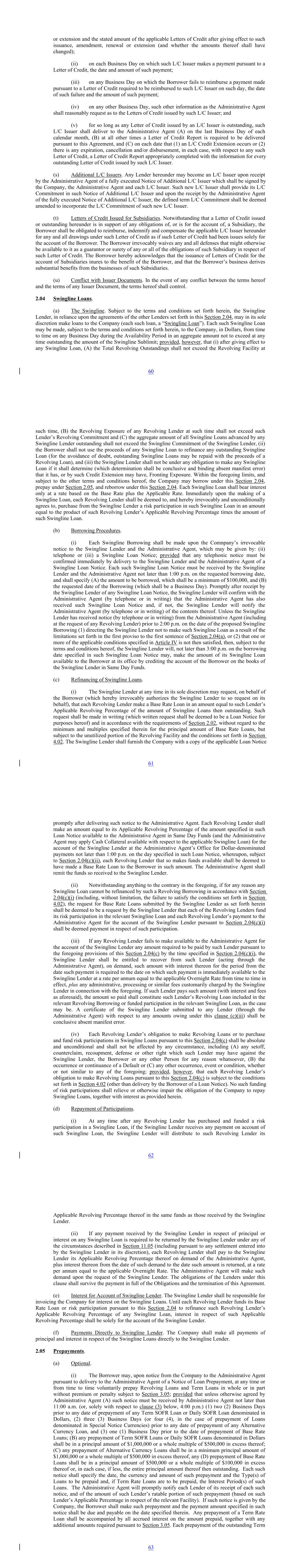 Loans pursuant to this Section 2.05 shall be applied to the principal repayment installments thereof in direct order of maturity. Subject to Section 2.15, such prepayments shall be paid to the Lenders in accordance with their respective Applicable Percentages in respect of each of the relevant Facilities. (ii) The Borrower may, upon notice from the Company to the Swingline Lender pursuant to delivery to the Swingline Lender of a Notice of Loan Prepayment (with a copy to the Administrative Agent), at any time or from time to time, voluntarily prepay Swingline Loans in whole or in part without premium or penalty; provided that, unless otherwise agreed by the Swingline Lender, (A) such notice must be received by the Swingline Lender and the Administrative Agent not later than 1:00 p.m. on the date of the prepayment, and (B) any such prepayment shall be in a minimum principal amount of $100,000 or a whole multiple of $100,000 in excess hereof (or, if less, the entire principal thereof then outstanding). Each such notice shall specify the date and amount of such prepayment. If such notice is given by the Borrower, the Borrower shall make such prepayment and the payment amount specified in such notice shall be due and payable on the date specified therein. (b) Mandatory. (i) Revolving Outstandings. If for any reason the Total Revolving Outstandings at any time exceed the Revolving Facility at such time, the Borrower shall immediately prepay Revolving Loans, Swingline Loans and L/C Borrowings, and/or Cash Collateralize the L/C Obligations in an aggregate amount equal to such excess (together with all accrued by unpaid interest thereon); provided, however, that the Borrower shall not be required to Cash Collateralize the L/C Obligations pursuant to this Section 2.05(b)(i) unless, after the prepayment of the Revolving Loans and Swingline Loans, the Total Revolving Outstandings exceed the Revolving Facility at such time. (ii) Application of Other Payments. Except as otherwise provided in Section 2.15, prepayments of the Revolving Facility made pursuant to this Section 2.05(b), first, shall be applied ratably to the L/C Borrowings and the Swingline Loans, second, shall be applied to the outstanding Revolving Loans, and, third, shall be used to Cash Collateralize the remaining L/C Obligations; and the amount remaining, if any, after the prepayment in full of all L/C Borrowings, Swingline Loans and Revolving Loans outstanding at such time and the Cash Collateralization of the remaining L/C Obligations in full (the sum of such prepayment amounts, Cash Collateralization amounts and remaining amount being, collectively, the “Reduction Amount”) may be retained by the Borrower for use in the ordinary course of its business, and the Revolving Facility shall be automatically and permanently reduced by the Reduction Amount as set forth in Section 2.06. Upon the drawing of any Letter of Credit that has been Cash Collateralized, the funds held as Cash Collateral shall be applied (without any further action by or notice to or from the Borrower or any other Loan Party or any Defaulting Lender that has provided Cash Collateral) to reimburse the applicable L/C Issuers or the Revolving Lenders, as applicable. (iii) Alternative Currencies. If the Administrative Agent notifies the Company at any time that the Outstanding Amount of all Loans and L/C Obligations denominated in Alternative Currencies at such time exceeds an amount equal to 105% of the Alternative Currency Sublimit then in effect, then, within two (2) Business Days after receipt of such notice, the Borrowers shall prepay Loans and/or Cash Collateralize Letters of Credit in an aggregate amount sufficient 64 to reduce such Outstanding Amount as of such date of payment to an amount not to exceed 100% of the Alternative Currency Sublimit then in effect. Within the parameters of the applications set forth above, prepayments pursuant to this Section 2.05(b) shall be applied first to Base Rate Loans and then to Term Rate Loans (and, if applicable, Daily SOFR Loans and Alternative Currency Daily Rate Loans) in direct order of Interest Period maturities. All prepayments under this Section 2.05(b) shall be subject to Section 3.05, but otherwise without premium or penalty, and shall be accompanied by interest on the principal amount prepaid through the date of prepayment. 2.06 Termination or Reduction of Commitments. (a) The Borrower may, upon notice from the Company to the Administrative Agent, terminate the Revolving Facility, the Letter of Credit Sublimit or the Swingline Sublimit or from time to time permanently reduce the Revolving Facility, the Letter of Credit Sublimit or the Swingline Sublimit; provided that (i) any such notice shall be received by the Administrative Agent not later than 11:00 a.m. five (5) Business Days prior to the date of termination or reduction, (ii) any such partial reduction shall be in an aggregate amount of $10,000,000 or any whole multiple of $1,000,000 in excess thereof and (iii) the Borrower shall not terminate or reduce (A) the Revolving Facility if, after giving effect thereto and to any concurrent prepayments hereunder, the Total Revolving Outstandings would exceed the Revolving Facility, (B) the Letter of Credit Sublimit if, after giving effect thereto, the Outstanding Amount of L/C Obligations not fully Cash Collateralized hereunder would exceed the Letter of Credit Sublimit or (C) the Swingline Sublimit if, after giving effect thereto and to any concurrent prepayments hereunder, the Outstanding Amount of Swingline Loans would exceed the Letter of Credit Sublimit. If after giving effect to any reduction or termination of Revolving Commitments under this Section 2.06, the Letter of Credit Sublimit, the Alternative Currency Sublimit or the Swingline Sublimit exceeds the Revolving Facility at such time, the Letter of Credit Sublimit, the Alternative Currency Sublimit or the Swingline Sublimit, as the case may be, shall be 
