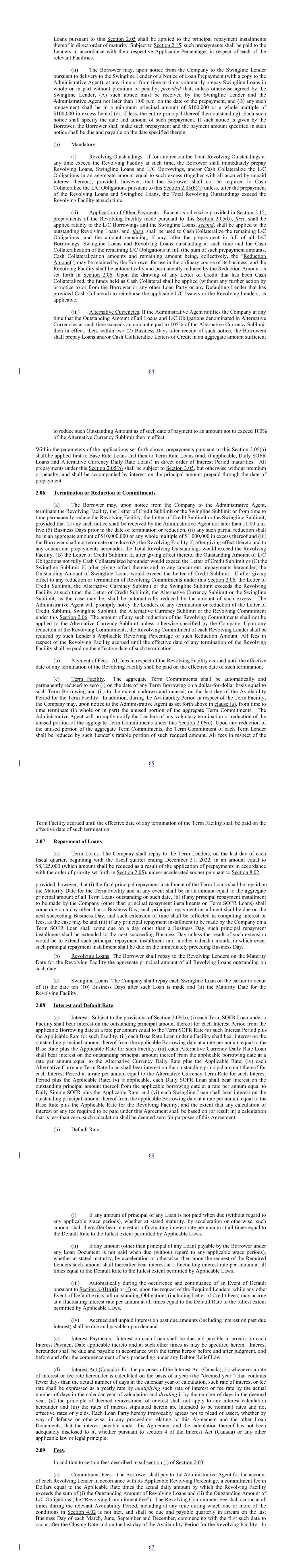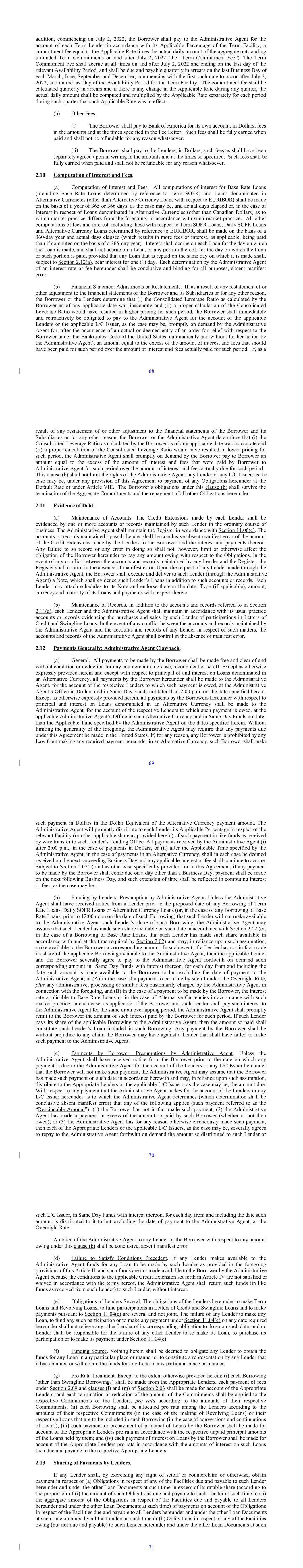 addition, commencing on July 2, 2022, the Borrower shall pay to the Administrative Agent for the account of each Term Lender in accordance with its Applicable Percentage of the Term Facility, a commitment fee equal to the Applicable Rate times the actual daily amount of the aggregate outstanding unfunded Term Commitments on and after July 2, 2022 (the “Term Commitment Fee”). The Term Commitment Fee shall accrue at all times on and after July 2, 2022 and ending on the last day of the relevant Availability Period, and shall be due and payable quarterly in arrears on the last Business Day of each March, June, September and December, commencing with the first such date to occur after July 2, 2022, and on the last day of the Availability Period for the Term Facility. The commitment fee shall be calculated quarterly in arrears and if there is any change in the Applicable Rate during any quarter, the actual daily amount shall be computed and multiplied by the Applicable Rate separately for each period during such quarter that such Applicable Rate was in effect. (b) Other Fees. (i) The Borrower shall pay to Bank of America for its own account, in Dollars, fees in the amounts and at the times specified in the Fee Letter. Such fees shall be fully earned when paid and shall not be refundable for any reason whatsoever. (ii) The Borrower shall pay to the Lenders, in Dollars, such fees as shall have been separately agreed upon in writing in the amounts and at the times so specified. Such fees shall be fully earned when paid and shall not be refundable for any reason whatsoever. 2.10 Computation of Interest and Fees. (a) Computation of Interest and Fees. All computations of interest for Base Rate Loans (including Base Rate Loans determined by reference to Term SOFR) and Loans denominated in Alternative Currencies (other than Alternative Currency Loans with respect to EURIBOR) shall be made on the basis of a year of 365 or 366 days, as the case may be, and actual days elapsed or, in the case of interest in respect of Loans denominated in Alternative Currencies (other than Canadian Dollars) as to which market practice differs from the foregoing, in accordance with such market practice. All other computations of fees and interest, including those with respect to Term SOFR Loans, Daily SOFR Loans and Alternative Currency Loans determined by reference to EURIBOR, shall be made on the basis of a 360-day year and actual days elapsed (which results in more fees or interest, as applicable, being paid than if computed on the basis of a 365-day year). Interest shall accrue on each Loan for the day on which the Loan is made, and shall not accrue on a Loan, or any portion thereof, for the day on which the Loan or such portion is paid, provided that any Loan that is repaid on the same day on which it is made shall, subject to Section 2.12(a), bear interest for one (1) day. Each determination by the Administrative Agent of an interest rate or fee hereunder shall be conclusive and binding for all purposes, absent manifest error. (b) Financial Statement Adjustments or Restatements. If, as a result of any restatement of or other adjustment to the financial statements of the Borrower and its Subsidiaries or for any other reason, the Borrower or the Lenders determine that (i) the Consolidated Leverage Ratio as calculated by the Borrower as of any applicable date was inaccurate and (ii) a proper calculation of the Consolidated Leverage Ratio would have resulted in higher pricing for such period, the Borrower shall immediately and retroactively be obligated to pay to the Administrative Agent for the account of the applicable Lenders or the applicable L/C Issuer, as the case may be, promptly on demand by the Administrative Agent (or, after the occurrence of an actual or deemed entry of an order for relief with respect to the Borrower under the Bankruptcy Code of the United States, automatically and without further action by the Administrative Agent), an amount equal to the excess of the amount of interest and fees that should have been paid for such period over the amount of interest and fees actually paid for such period. If, as a 68 result of any restatement of or other adjustment to the financial statements of the Borrower and its Subsidiaries or for any other reason, the Borrower or the Administrative Agent determines that (i) the Consolidated Leverage Ratio as calculated by the Borrower as of any applicable date was inaccurate and (ii) a proper calculation of the Consolidated Leverage Ratio would have resulted in lower pricing for such period, the Administrative Agent shall promptly on demand by the Borrower pay to Borrower an amount equal to the excess of the amount of interest and fees that were paid by Borrower to Administrative Agent for such period over the amount of interest and fees actually due for such period. This clause (b) shall not limit the rights of the Administrative Agent, any Lender or any L/C Issuer, as the case may be, under any provision of this Agreement to payment of any Obligations hereunder at the Default Rate or under Article VIII. The Borrower’s obligations under this clause (b) shall survive the termination of the Aggregate Commitments and the repayment of all other Obligations hereunder. 2.11 Evidence of Debt. (a) Maintenance of Accounts. The Credit Extensions made by each Lender shall be evidenced by one or more accounts or records maintained by such Lender in the ordinary course of business. The Administrative Agent shall maintain the Register in accordance with Section 11.06(c). The accounts or records maintained by each Lender shall be conclusive absent manifest error of the amount of the Credit Extensions made by the Lenders to the Borrower and the interest and payments thereon. Any failure to so record or any error in doing so shall not, however, limit or otherwise affect the obligation of the Borrower hereunder to pay any amount owing with respect to the Obligations. In the even