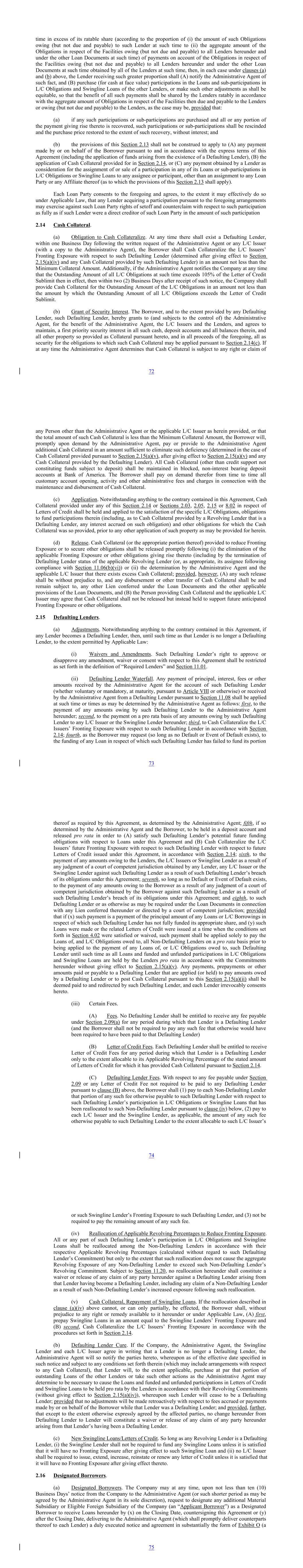 time in excess of its ratable share (according to the proportion of (i) the amount of such Obligations owing (but not due and payable) to such Lender at such time to (ii) the aggregate amount of the Obligations in respect of the Facilities owing (but not due and payable) to all Lenders hereunder and under the other Loan Documents at such time) of payments on account of the Obligations in respect of the Facilities owing (but not due and payable) to all Lenders hereunder and under the other Loan Documents at such time obtained by all of the Lenders at such time, then, in each case under clauses (a) and (b) above, the Lender receiving such greater proportion shall (A) notify the Administrative Agent of such fact, and (B) purchase (for cash at face value) participations in the Loans and sub-participations in L/C Obligations and Swingline Loans of the other Lenders, or make such other adjustments as shall be equitable, so that the benefit of all such payments shall be shared by the Lenders ratably in accordance with the aggregate amount of Obligations in respect of the Facilities then due and payable to the Lenders or owing (but not due and payable) to the Lenders, as the case may be, provided that: (a) if any such participations or sub-participations are purchased and all or any portion of the payment giving rise thereto is recovered, such participations or sub-participations shall be rescinded and the purchase price restored to the extent of such recovery, without interest; and (b) the provisions of this Section 2.13 shall not be construed to apply to (A) any payment made by or on behalf of the Borrower pursuant to and in accordance with the express terms of this Agreement (including the application of funds arising from the existence of a Defaulting Lender), (B) the application of Cash Collateral provided for in Section 2.14, or (C) any payment obtained by a Lender as consideration for the assignment of or sale of a participation in any of its Loans or sub-participations in L/C Obligations or Swingline Loans to any assignee or participant, other than an assignment to any Loan Party or any Affiliate thereof (as to which the provisions of this Section 2.13 shall apply). Each Loan Party consents to the foregoing and agrees, to the extent it may effectively do so under Applicable Law, that any Lender acquiring a participation pursuant to the foregoing arrangements may exercise against such Loan Party rights of setoff and counterclaim with respect to such participation as fully as if such Lender were a direct creditor of such Loan Party in the amount of such participation 2.14 Cash Collateral. (a) Obligation to Cash Collateralize. At any time there shall exist a Defaulting Lender, within one Business Day following the written request of the Administrative Agent or any L/C Issuer (with a copy to the Administrative Agent), the Borrower shall Cash Collateralize the L/C Issuers’ Fronting Exposure with respect to such Defaulting Lender (determined after giving effect to Section 2.15(a)(iv) and any Cash Collateral provided by such Defaulting Lender) in an amount not less than the Minimum Collateral Amount. Additionally, if the Administrative Agent notifies the Company at any time that the Outstanding Amount of all L/C Obligations at such time exceeds 105% of the Letter of Credit Sublimit then in effect, then within two (2) Business Days after receipt of such notice, the Company shall provide Cash Collateral for the Outstanding Amount of the L/C Obligations in an amount not less than the amount by which the Outstanding Amount of all L/C Obligations exceeds the Letter of Credit Sublimit. (b) Grant of Security Interest. The Borrower, and to the extent provided by any Defaulting Lender, such Defaulting Lender, hereby grants to (and subjects to the control of) the Administrative Agent, for the benefit of the Administrative Agent, the L/C Issuers and the Lenders, and agrees to maintain, a first priority security interest in all such cash, deposit accounts and all balances therein, and all other property so provided as Collateral pursuant hereto, and in all proceeds of the foregoing, all as security for the obligations to which such Cash Collateral may be applied pursuant to Section 2.14(c). If at any time the Administrative Agent determines that Cash Collateral is subject to any right or claim of 72 any Person other than the Administrative Agent or the applicable L/C Issuer as herein provided, or that the total amount of such Cash Collateral is less than the Minimum Collateral Amount, the Borrower will, promptly upon demand by the Administrative Agent, pay or provide to the Administrative Agent additional Cash Collateral in an amount sufficient to eliminate such deficiency (determined in the case of Cash Collateral provided pursuant to Section 2.15(a)(v), after giving effect to Section 2.15(a)(v) and any Cash Collateral provided by the Defaulting Lender). All Cash Collateral (other than credit support not constituting funds subject to deposit) shall be maintained in blocked, non-interest bearing deposit accounts at Bank of America. The Borrower shall pay on demand therefor from time to time all customary account opening, activity and other administrative fees and charges in connection with the maintenance and disbursement of Cash Collateral. (c) Application. Notwithstanding anything to the contrary contained in this Agreement, Cash Collateral provided under any of this Section 2.14 or Sections 2.03, 2.05, 2.15 or 8.02 in respect of Letters of Credit shall be held and applied to the satisfaction of the specific L/C Obligations, obligations to fund participations therein (including, as to Cash Collateral provided by a Revolving Lender that is a Defaulting Lender, any interest accrued on such obligation) and other obligations for which the Cash Collateral was so provided, prior to any other application of such property as may be provided for herein. (d) Release. Cash Collateral (or the appropriate portion t