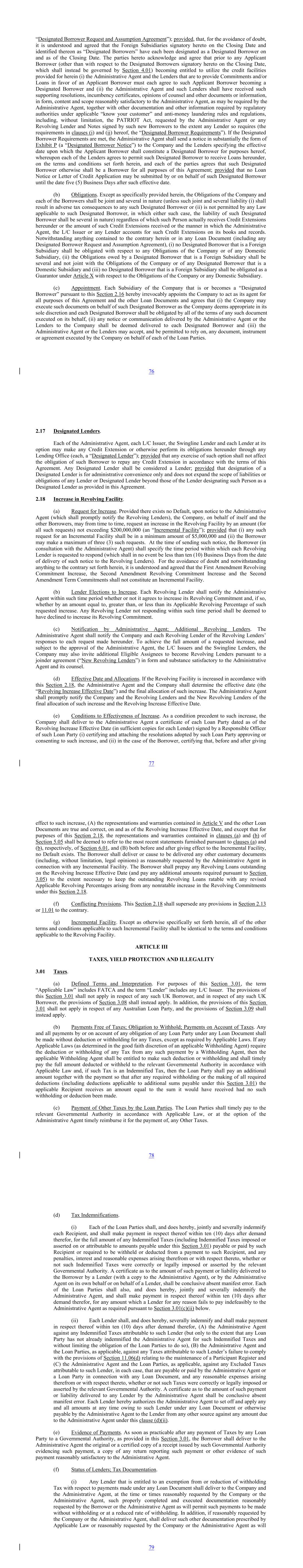 “Designated Borrower Request and Assumption Agreement”); provided, that, for the avoidance of doubt, it is understood and agreed that the Foreign Subsidiaries signatory hereto on the Closing Date and identified thereon as “Designated Borrowers” have each been designated as a Designated Borrower on and as of the Closing Date. The parties hereto acknowledge and agree that prior to any Applicant Borrower (other than with respect to the Designated Borrowers signatory hereto on the Closing Date, which shall instead be governed by Section 4.01) becoming entitled to utilize the credit facilities provided for herein (i) the Administrative Agent and the Lenders that are to provide Commitments and/or Loans in favor of an Applicant Borrower must each agree to such Applicant Borrower becoming a Designated Borrower and (ii) the Administrative Agent and such Lenders shall have received such supporting resolutions, incumbency certificates, opinions of counsel and other documents or information, in form, content and scope reasonably satisfactory to the Administrative Agent, as may be required by the Administrative Agent, together with other documentation and other information required by regulatory authorities under applicable “know your customer” and anti-money laundering rules and regulations, including, without limitation, the PATRIOT Act, requested by the Administrative Agent or any Revolving Lender and Notes signed by such new Borrowers to the extent any Lender so requires (the requirements in clauses (i) and (ii) hereof, the “Designated Borrower Requirements”). If the Designated Borrower Requirements are met, the Administrative Agent shall send a notice in substantially the form of Exhibit P (a “Designated Borrower Notice”) to the Company and the Lenders specifying the effective date upon which the Applicant Borrower shall constitute a Designated Borrower for purposes hereof, whereupon each of the Lenders agrees to permit such Designated Borrower to receive Loans hereunder, on the terms and conditions set forth herein, and each of the parties agrees that such Designated Borrower otherwise shall be a Borrower for all purposes of this Agreement; provided that no Loan Notice or Letter of Credit Application may be submitted by or on behalf of such Designated Borrower until the date five (5) Business Days after such effective date. (b) Obligations. Except as specifically provided herein, the Obligations of the Company and each of the Borrowers shall be joint and several in nature (unless such joint and several liability (i) shall result in adverse tax consequences to any such Designated Borrower or (ii) is not permitted by any Law applicable to such Designated Borrower, in which either such case, the liability of such Designated Borrower shall be several in nature) regardless of which such Person actually receives Credit Extensions hereunder or the amount of such Credit Extensions received or the manner in which the Administrative Agent, the L/C Issuer or any Lender accounts for such Credit Extensions on its books and records. Notwithstanding anything contained to the contrary herein or in any Loan Document (including any Designated Borrower Request and Assumption Agreement), (i) no Designated Borrower that is a Foreign Subsidiary shall be obligated with respect to any Obligations of the Company or of any Domestic Subsidiary, (ii) the Obligations owed by a Designated Borrower that is a Foreign Subsidiary shall be several and not joint with the Obligations of the Company or of any Designated Borrower that is a Domestic Subsidiary and (iii) no Designated Borrower that is a Foreign Subsidiary shall be obligated as a Guarantor under Article X with respect to the Obligations of the Company or any Domestic Subsidiary. (c) Appointment. Each Subsidiary of the Company that is or becomes a “Designated Borrower” pursuant to this Section 2.16 hereby irrevocably appoints the Company to act as its agent for all purposes of this Agreement and the other Loan Documents and agrees that (i) the Company may execute such documents on behalf of such Designated Borrower as the Company deems appropriate in its sole discretion and each Designated Borrower shall be obligated by all of the terms of any such document executed on its behalf, (ii) any notice or communication delivered by the Administrative Agent or the Lenders to the Company shall be deemed delivered to each Designated Borrower and (iii) the Administrative Agent or the Lenders may accept, and be permitted to rely on, any document, instrument or agreement executed by the Company on behalf of each of the Loan Parties. 76 2.17 Designated Lenders. Each of the Administrative Agent, each L/C Issuer, the Swingline Lender and each Lender at its option may make any Credit Extension or otherwise perform its obligations hereunder through any Lending Office (each, a “Designated Lender”); provided that any exercise of such option shall not affect the obligation of such Borrower to repay any Credit Extension in accordance with the terms of this Agreement. Any Designated Lender shall be considered a Lender; provided that designation of a Designated Lender is for administrative convenience only and does not expand the scope of liabilities or obligations of any Lender or Designated Lender beyond those of the Lender designating such Person as a Designated Lender as provided in this Agreement. 2.18 Increase in Revolving Facility. (a) Request for Increase. Provided there exists no Default, upon notice to the Administrative Agent (which shall promptly notify the Revolving Lenders), the Company, on behalf of itself and the other Borrowers, may from time to time, request an increase in the Revolving Facility by an amount (for all such requests) not exceeding $200,000,000 (an “Incremental Facility”); provided that (i) any such request for an Incremental Facility shall be in a minimum amount of $5,000,000 and (ii) the Borrower may make a maximum of three (3)