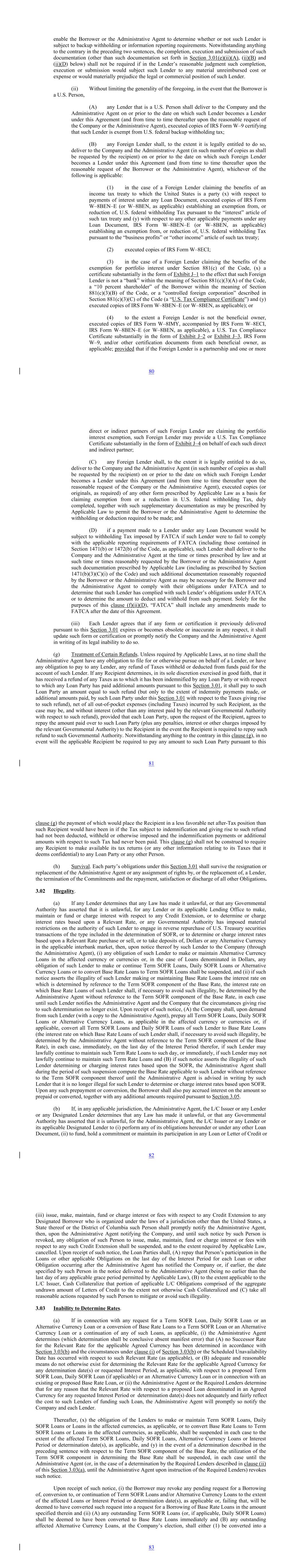 enable the Borrower or the Administrative Agent to determine whether or not such Lender is subject to backup withholding or information reporting requirements. Notwithstanding anything to the contrary in the preceding two sentences, the completion, execution and submission of such documentation (other than such documentation set forth in Section 3.01(e)(ii)(A), (ii)(B) and (ii)(D) below) shall not be required if in the Lender’s reasonable judgment such completion, execution or submission would subject such Lender to any material unreimbursed cost or expense or would materially prejudice the legal or commercial position of such Lender. (ii) Without limiting the generality of the foregoing, in the event that the Borrower is a U.S. Person, (A) any Lender that is a U.S. Person shall deliver to the Company and the Administrative Agent on or prior to the date on which such Lender becomes a Lender under this Agreement (and from time to time thereafter upon the reasonable request of the Company or the Administrative Agent), executed copies of IRS Form W–9 certifying that such Lender is exempt from U.S. federal backup withholding tax; (B) any Foreign Lender shall, to the extent it is legally entitled to do so, deliver to the Company and the Administrative Agent (in such number of copies as shall be requested by the recipient) on or prior to the date on which such Foreign Lender becomes a Lender under this Agreement (and from time to time thereafter upon the reasonable request of the Borrower or the Administrative Agent), whichever of the following is applicable: (1) in the case of a Foreign Lender claiming the benefits of an income tax treaty to which the United States is a party (x) with respect to payments of interest under any Loan Document, executed copies of IRS Form W–8BEN–E (or W–8BEN, as applicable) establishing an exemption from, or reduction of, U.S. federal withholding Tax pursuant to the “interest” article of such tax treaty and (y) with respect to any other applicable payments under any Loan Document, IRS Form W–8BEN–E (or W–8BEN, as applicable) establishing an exemption from, or reduction of, U.S. federal withholding Tax pursuant to the “business profits” or “other income” article of such tax treaty; (2) executed copies of IRS Form W–8ECI; (3) in the case of a Foreign Lender claiming the benefits of the exemption for portfolio interest under Section 881(c) of the Code, (x) a certificate substantially in the form of Exhibit J–1 to the effect that such Foreign Lender is not a “bank” within the meaning of Section 881(c)(3)(A) of the Code, a “10 percent shareholder” of the Borrower within the meaning of Section 881(c)(3)(B) of the Code, or a “controlled foreign corporation” described in Section 881(c)(3)(C) of the Code (a “U.S. Tax Compliance Certificate”) and (y) executed copies of IRS Form W–8BEN–E (or W–8BEN, as applicable); or (4) to the extent a Foreign Lender is not the beneficial owner, executed copies of IRS Form W–8IMY, accompanied by IRS Form W–8ECI, IRS Form W–8BEN–E (or W–8BEN, as applicable), a U.S. Tax Compliance Certificate substantially in the form of Exhibit J–2 or Exhibit J–3, IRS Form W–9, and/or other certification documents from each beneficial owner, as applicable; provided that if the Foreign Lender is a partnership and one or more 80 direct or indirect partners of such Foreign Lender are claiming the portfolio interest exemption, such Foreign Lender may provide a U.S. Tax Compliance Certificate substantially in the form of Exhibit J–4 on behalf of each such direct and indirect partner; (C) any Foreign Lender shall, to the extent it is legally entitled to do so, deliver to the Company and the Administrative Agent (in such number of copies as shall be requested by the recipient) on or prior to the date on which such Foreign Lender becomes a Lender under this Agreement (and from time to time thereafter upon the reasonable request of the Company or the Administrative Agent), executed copies (or originals, as required) of any other form prescribed by Applicable Law as a basis for claiming exemption from or a reduction in U.S. federal withholding Tax, duly completed, together with such supplementary documentation as may be prescribed by Applicable Law to permit the Borrower or the Administrative Agent to determine the withholding or deduction required to be made; and (D) if a payment made to a Lender under any Loan Document would be subject to withholding Tax imposed by FATCA if such Lender were to fail to comply with the applicable reporting requirements of FATCA (including those contained in Section 1471(b) or 1472(b) of the Code, as applicable), such Lender shall deliver to the Company and the Administrative Agent at the time or times prescribed by law and at such time or times reasonably requested by the Borrower or the Administrative Agent such documentation prescribed by Applicable Law (including as prescribed by Section 1471(b)(3)(C)(i) of the Code) and such additional documentation reasonably requested by the Borrower or the Administrative Agent as may be necessary for the Borrower and the Administrative Agent to comply with their obligations under FATCA and to determine that such Lender has complied with such Lender’s obligations under FATCA or to determine the amount to deduct and withhold from such payment. Solely for the purposes of this clause (f)(ii)(D), “FATCA” shall include any amendments made to FATCA after the date of this Agreement. (iii) Each Lender agrees that if any form or certification it previously delivered pursuant to this Section 3.01 expires or becomes obsolete or inaccurate in any respect, it shall update such form or certification or promptly notify the Company and the Administrative Agent in writing of its legal inability to do so. (g) Treatment of Certain Refunds. Unless required by Applicable Laws, at no time shall the Administrative Agent have any obligation