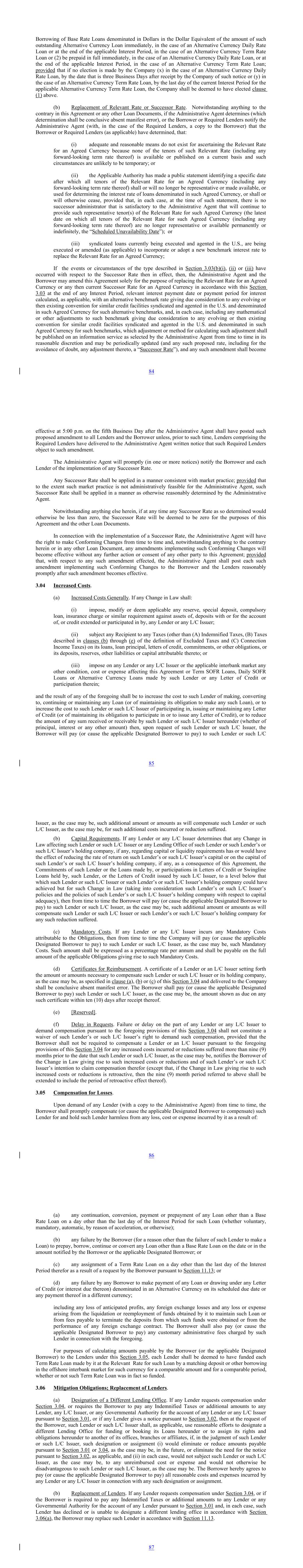 Borrowing of Base Rate Loans denominated in Dollars in the Dollar Equivalent of the amount of such outstanding Alternative Currency Loan immediately, in the case of an Alternative Currency Daily Rate Loan or at the end of the applicable Interest Period, in the case of an Alternative Currency Term Rate Loan or (2) be prepaid in full immediately, in the case of an Alternative Currency Daily Rate Loan, or at the end of the applicable Interest Period, in the case of an Alternative Currency Term Rate Loan; provided that if no election is made by the Company (x) in the case of an Alternative Currency Daily Rate Loan, by the date that is three Business Days after receipt by the Company of such notice or (y) in the case of an Alternative Currency Term Rate Loan, by the last day of the current Interest Period for the applicable Alternative Currency Term Rate Loan, the Company shall be deemed to have elected clause (1) above. (b) Replacement of Relevant Rate or Successor Rate. Notwithstanding anything to the contrary in this Agreement or any other Loan Documents, if the Administrative Agent determines (which determination shall be conclusive absent manifest error), or the Borrower or Required Lenders notify the Administrative Agent (with, in the case of the Required Lenders, a copy to the Borrower) that the Borrower or Required Lenders (as applicable) have determined, that: (i) adequate and reasonable means do not exist for ascertaining the Relevant Rate for an Agreed Currency because none of the tenors of such Relevant Rate (including any forward-looking term rate thereof) is available or published on a current basis and such circumstances are unlikely to be temporary; or (ii) the Applicable Authority has made a public statement identifying a specific date after which all tenors of the Relevant Rate for an Agreed Currency (including any forward-looking term rate thereof) shall or will no longer be representative or made available, or used for determining the interest rate of loans denominated in such Agreed Currency, or shall or will otherwise cease, provided that, in each case, at the time of such statement, there is no successor administrator that is satisfactory to the Administrative Agent that will continue to provide such representative tenor(s) of the Relevant Rate for such Agreed Currency (the latest date on which all tenors of the Relevant Rate for such Agreed Currency (including any forward-looking term rate thereof) are no longer representative or available permanently or indefinitely, the “Scheduled Unavailability Date”); or (iii) syndicated loans currently being executed and agented in the U.S., are being executed or amended (as applicable) to incorporate or adopt a new benchmark interest rate to replace the Relevant Rate for an Agreed Currency; If the events or circumstances of the type described in Section 3.03(b)(i), (ii) or (iii) have occurred with respect to the Successor Rate then in effect, then, the Administrative Agent and the Borrower may amend this Agreement solely for the purpose of replacing the Relevant Rate for an Agreed Currency or any then current Successor Rate for an Agreed Currency in accordance with this Section 3.03 at the end of any Interest Period, relevant interest payment date or payment period for interest calculated, as applicable, with an alternative benchmark rate giving due consideration to any evolving or then existing convention for similar credit facilities syndicated and agented in the U.S. and denominated in such Agreed Currency for such alternative benchmarks, and, in each case, including any mathematical or other adjustments to such benchmark giving due consideration to any evolving or then existing convention for similar credit facilities syndicated and agented in the U.S. and denominated in such Agreed Currency for such benchmarks, which adjustment or method for calculating such adjustment shall be published on an information service as selected by the Administrative Agent from time to time in its reasonable discretion and may be periodically updated (and any such proposed rate, including for the avoidance of doubt, any adjustment thereto, a “Successor Rate”), and any such amendment shall become 84 effective at 5:00 p.m. on the fifth Business Day after the Administrative Agent shall have posted such proposed amendment to all Lenders and the Borrower unless, prior to such time, Lenders comprising the Required Lenders have delivered to the Administrative Agent written notice that such Required Lenders object to such amendment. The Administrative Agent will promptly (in one or more notices) notify the Borrower and each Lender of the implementation of any Successor Rate. Any Successor Rate shall be applied in a manner consistent with market practice; provided that to the extent such market practice is not administratively feasible for the Administrative Agent, such Successor Rate shall be applied in a manner as otherwise reasonably determined by the Administrative Agent. Notwithstanding anything else herein, if at any time any Successor Rate as so determined would otherwise be less than zero, the Successor Rate will be deemed to be zero for the purposes of this Agreement and the other Loan Documents. In connection with the implementation of a Successor Rate, the Administrative Agent will have the right to make Conforming Changes from time to time and, notwithstanding anything to the contrary herein or in any other Loan Document, any amendments implementing such Conforming Changes will become effective without any further action or consent of any other party to this Agreement; provided that, with respect to any such amendment effected, the Administrative Agent shall post each such amendment implementing such Conforming Changes to the Borrower and the Lenders reasonably promptly after such amendment becomes effective. 3.04 Increased Costs. (a) Increased Costs Generally. If any Change in Law shall: (i) impose, modify or deem applicable any rese
