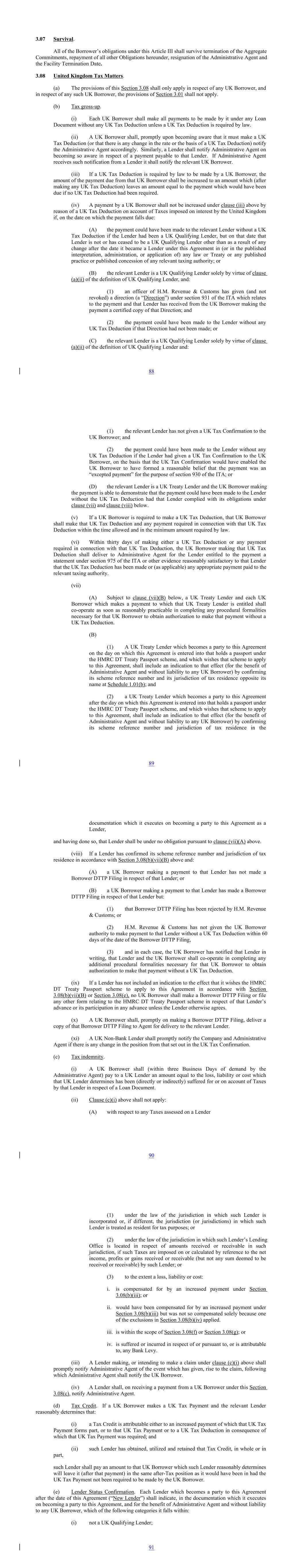 3.07 Survival. All of the Borrower’s obligations under this Article III shall survive termination of the Aggregate Commitments, repayment of all other Obligations hereunder, resignation of the Administrative Agent and the Facility Termination Date. 3.08 United Kingdom Tax Matters. (a) The provisions of this Section 3.08 shall only apply in respect of any UK Borrower, and in respect of any such UK Borrower, the provisions of Section 3.01 shall not apply. (b) Tax gross-up. (i) Each UK Borrower shall make all payments to be made by it under any Loan Document without any UK Tax Deduction unless a UK Tax Deduction is required by law. (ii) A UK Borrower shall, promptly upon becoming aware that it must make a UK Tax Deduction (or that there is any change in the rate or the basis of a UK Tax Deduction) notify the Administrative Agent accordingly. Similarly, a Lender shall notify Administrative Agent on becoming so aware in respect of a payment payable to that Lender. If Administrative Agent receives such notification from a Lender it shall notify the relevant UK Borrower. (iii) If a UK Tax Deduction is required by law to be made by a UK Borrower, the amount of the payment due from that UK Borrower shall be increased to an amount which (after making any UK Tax Deduction) leaves an amount equal to the payment which would have been due if no UK Tax Deduction had been required. (iv) A payment by a UK Borrower shall not be increased under clause (iii) above by reason of a UK Tax Deduction on account of Taxes imposed on interest by the United Kingdom if, on the date on which the payment falls due: (A) the payment could have been made to the relevant Lender without a UK Tax Deduction if the Lender had been a UK Qualifying Lender, but on that date that Lender is not or has ceased to be a UK Qualifying Lender other than as a result of any change after the date it became a Lender under this Agreement in (or in the published interpretation, administration, or application of) any law or Treaty or any published practice or published concession of any relevant taxing authority; or (B) the relevant Lender is a UK Qualifying Lender solely by virtue of clause (a)(ii) of the definition of UK Qualifying Lender, and: (1) an officer of H.M. Revenue & Customs has given (and not revoked) a direction (a “Direction”) under section 931 of the ITA which relates to the payment and that Lender has received from the UK Borrower making the payment a certified copy of that Direction; and (2) the payment could have been made to the Lender without any UK Tax Deduction if that Direction had not been made; or (C) the relevant Lender is a UK Qualifying Lender solely by virtue of clause (a)(ii) of the definition of UK Qualifying Lender and: 88 (1) the relevant Lender has not given a UK Tax Confirmation to the UK Borrower; and (2) the payment could have been made to the Lender without any UK Tax Deduction if the Lender had given a UK Tax Confirmation to the UK Borrower, on the basis that the UK Tax Confirmation would have enabled the UK Borrower to have formed a reasonable belief that the payment was an “excepted payment” for the purpose of section 930 of the ITA; or (D) the relevant Lender is a UK Treaty Lender and the UK Borrower making the payment is able to demonstrate that the payment could have been made to the Lender without the UK Tax Deduction had that Lender complied with its obligations under clause (vii) and clause (viii) below. (v) If a UK Borrower is required to make a UK Tax Deduction, that UK Borrower shall make that UK Tax Deduction and any payment required in connection with that UK Tax Deduction within the time allowed and in the minimum amount required by law. (vi) Within thirty days of making either a UK Tax Deduction or any payment required in connection with that UK Tax Deduction, the UK Borrower making that UK Tax Deduction shall deliver to Administrative Agent for the Lender entitled to the payment a statement under section 975 of the ITA or other evidence reasonably satisfactory to that Lender that the UK Tax Deduction has been made or (as applicable) any appropriate payment paid to the relevant taxing authority. (vii) (A) Subject to clause (vii)(B) below, a UK Treaty Lender and each UK Borrower which makes a payment to which that UK Treaty Lender is entitled shall co-operate as soon as reasonably practicable in completing any procedural formalities necessary for that UK Borrower to obtain authorization to make that payment without a UK Tax Deduction. (B) (1) A UK Treaty Lender which becomes a party to this Agreement on the day on which this Agreement is entered into that holds a passport under the HMRC DT Treaty Passport scheme, and which wishes that scheme to apply to this Agreement, shall include an indication to that effect (for the benefit of Administrative Agent and without liability to any UK Borrower) by confirming its scheme reference number and its jurisdiction of tax residence opposite its name at Schedule 1.01(b); and (2) a UK Treaty Lender which becomes a party to this Agreement after the day on which this Agreement is entered into that holds a passport under the HMRC DT Treaty Passport scheme, and which wishes that scheme to apply to this Agreement, shall include an indication to that effect (for the benefit of Administrative Agent and without liability to any UK Borrower) by confirming its scheme reference number and jurisdiction of tax residence in the 89 documentation which it executes on becoming a party to this Agreement as a Lender, and having done so, that Lender shall be under no obligation pursuant to clause (vii)(A) above. (viii) If a Lender has confirmed its scheme reference number and jurisdiction of tax residence in accordance with Section 3.08(b)(vii)(B) above and: (A) a UK Borrower making a payment to that Lender has not made a Borrower DTTP Filing in respect of that Lender; or (B) a UK Borrower making a payment to that Lender has made a Borrower DTTP Filing in respect 