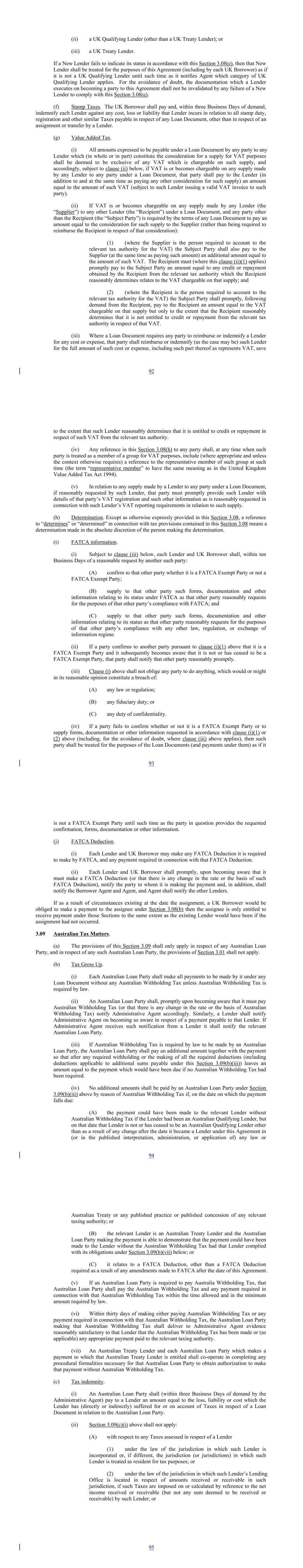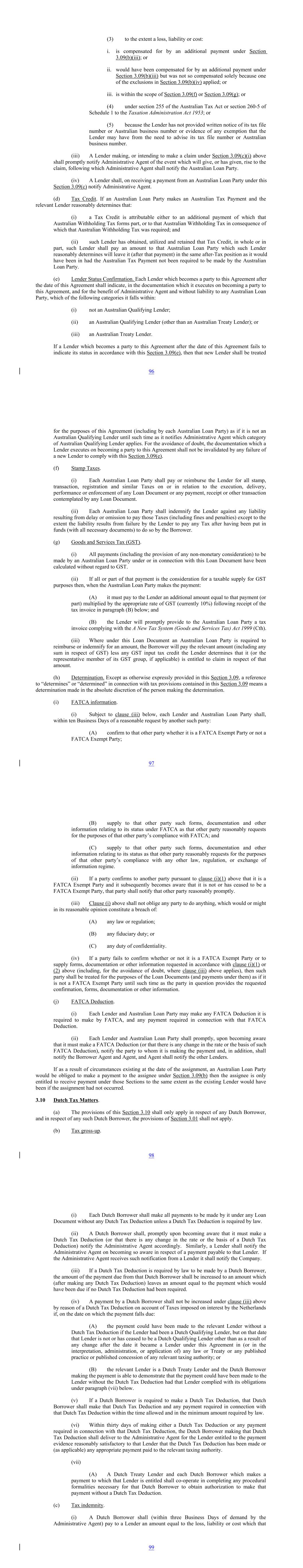 (3) to the extent a loss, liability or cost: i. is compensated for by an additional payment under Section 3.09(b)(iii); or ii. would have been compensated for by an additional payment under Section 3.09(b)(iii) but was not so compensated solely because one of the exclusions in Section 3.09(b)(iv) applied; or iii. is within the scope of Section 3.09(f) or Section 3.09(g); or (4) under section 255 of the Australian Tax Act or section 260-5 of Schedule 1 to the Taxation Administration Act 1953; or (5) because the Lender has not provided written notice of its tax file number or Australian business number or evidence of any exemption that the Lender may have from the need to advise its tax file number or Australian business number. (iii) A Lender making, or intending to make a claim under Section 3.09(c)(i) above shall promptly notify Administrative Agent of the event which will give, or has given, rise to the claim, following which Administrative Agent shall notify the Australian Loan Party. (iv) A Lender shall, on receiving a payment from an Australian Loan Party under this Section 3.09(c) notify Administrative Agent. (d) Tax Credit. If an Australian Loan Party makes an Australian Tax Payment and the relevant Lender reasonably determines that: (i) a Tax Credit is attributable either to an additional payment of which that Australian Withholding Tax forms part, or to that Australian Withholding Tax in consequence of which that Australian Withholding Tax was required; and (ii) such Lender has obtained, utilized and retained that Tax Credit, in whole or in part, such Lender shall pay an amount to that Australian Loan Party which such Lender reasonably determines will leave it (after that payment) in the same after-Tax position as it would have been in had the Australian Tax Payment not been required to be made by the Australian Loan Party. (e) Lender Status Confirmation. Each Lender which becomes a party to this Agreement after the date of this Agreement shall indicate, in the documentation which it executes on becoming a party to this Agreement, and for the benefit of Administrative Agent and without liability to any Australian Loan Party, which of the following categories it falls within: (i) not an Australian Qualifying Lender; (ii) an Australian Qualifying Lender (other than an Australian Treaty Lender); or (iii) an Australian Treaty Lender. If a Lender which becomes a party to this Agreement after the date of this Agreement fails to indicate its status in accordance with this Section 3.09(e), then that new Lender shall be treated 96 for the purposes of this Agreement (including by each Australian Loan Party) as if it is not an Australian Qualifying Lender until such time as it notifies Administrative Agent which category of Australian Qualifying Lender applies. For the avoidance of doubt, the documentation which a Lender executes on becoming a party to this Agreement shall not be invalidated by any failure of a new Lender to comply with this Section 3.09(e). (f) Stamp Taxes. (i) Each Australian Loan Party shall pay or reimburse the Lender for all stamp, transaction, registration and similar Taxes on or in relation to the execution, delivery, performance or enforcement of any Loan Document or any payment, receipt or other transaction contemplated by any Loan Document. (ii) Each Australian Loan Party shall indemnify the Lender against any liability resulting from delay or omission to pay those Taxes (including fines and penalties) except to the extent the liability results from failure by the Lender to pay any Tax after having been put in funds (with all necessary documents) to do so by the Borrower. (g) Goods and Services Tax (GST). (i) All payments (including the provision of any non-monetary consideration) to be made by an Australian Loan Party under or in connection with this Loan Document have been calculated without regard to GST. (ii) If all or part of that payment is the consideration for a taxable supply for GST purposes then, when the Australian Loan Party makes the payment: (A) it must pay to the Lender an additional amount equal to that payment (or part) multiplied by the appropriate rate of GST (currently 10%) following receipt of the tax invoice in paragraph (B) below; and (B) the Lender will promptly provide to the Australian Loan Party a tax invoice complying with the A New Tax System (Goods and Services Tax) Act 1999 (Cth). (iii) Where under this Loan Document an Australian Loan Party is required to reimburse or indemnify for an amount, the Borrower will pay the relevant amount (including any sum in respect of GST) less any GST input tax credit the Lender determines that it (or the representative member of its GST group, if applicable) is entitled to claim in respect of that amount. (h) Determination. Except as otherwise expressly provided in this Section 3.09, a reference to “determines” or “determined” in connection with tax provisions contained in this Section 3.09 means a determination made in the absolute discretion of the person making the determination. (i) FATCA information. (i) Subject to clause (iii) below, each Lender and Australian Loan Party shall, within ten Business Days of a reasonable request by another such party: (A) confirm to that other party whether it is a FATCA Exempt Party or not a FATCA Exempt Party; 97 (B) supply to that other party such forms, documentation and other information relating to its status under FATCA as that other party reasonably requests for the purposes of that other party’s compliance with FATCA; and (C) supply to that other party such forms, documentation and other information relating to its status as that other party reasonably requests for the purposes of that other party’s compliance with any other law, regulation, or exchange of information regime. (ii) If a party confirms to another party pursuant to clause (i)(1) above that it is a FATCA Exempt Party and it subsequently becomes aware that it is not or has cease