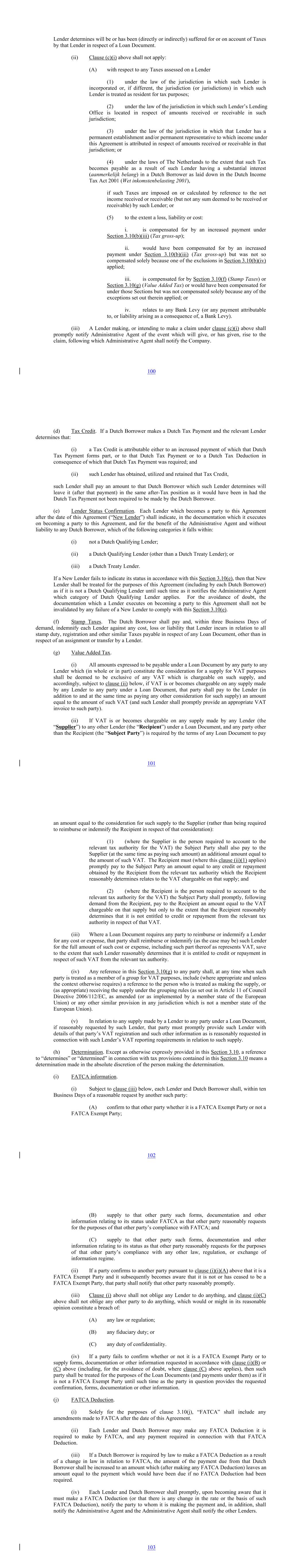 Lender determines will be or has been (directly or indirectly) suffered for or on account of Taxes by that Lender in respect of a Loan Document. (ii) Clause (c)(i) above shall not apply: (A) with respect to any Taxes assessed on a Lender (1) under the law of the jurisdiction in which such Lender is incorporated or, if different, the jurisdiction (or jurisdictions) in which such Lender is treated as resident for tax purposes; (2) under the law of the jurisdiction in which such Lender’s Lending Office is located in respect of amounts received or receivable in such jurisdiction; (3) under the law of the jurisdiction in which that Lender has a permanent establishment and/or permanent representative to which income under this Agreement is attributed in respect of amounts received or receivable in that jurisdiction; or (4) under the laws of The Netherlands to the extent that such Tax becomes payable as a result of such Lender having a substantial interest (aanmerkelijk belang) in a Dutch Borrower as laid down in the Dutch Income Tax Act 2001 (Wet inkomstenbelasting 2001), if such Taxes are imposed on or calculated by reference to the net income received or receivable (but not any sum deemed to be received or receivable) by such Lender; or (5) to the extent a loss, liability or cost: i. is compensated for by an increased payment under Section 3.10(b)(iii) (Tax gross-up); ii. would have been compensated for by an increased payment under Section 3.10(b)(iii) (Tax gross-up) but was not so compensated solely because one of the exclusions in Section 3.10(b)(iv) applied; iii. is compensated for by Section 3.10(f) (Stamp Taxes) or Section 3.10(g) (Value Added Tax) or would have been compensated for under those Sections but was not compensated solely because any of the exceptions set out therein applied; or iv. relates to any Bank Levy (or any payment attributable to, or liability arising as a consequence of, a Bank Levy). (iii) A Lender making, or intending to make a claim under clause (c)(i) above shall promptly notify Administrative Agent of the event which will give, or has given, rise to the claim, following which Administrative Agent shall notify the Company. 100 (d) Tax Credit. If a Dutch Borrower makes a Dutch Tax Payment and the relevant Lender determines that: (i) a Tax Credit is attributable either to an increased payment of which that Dutch Tax Payment forms part, or to that Dutch Tax Payment or to a Dutch Tax Deduction in consequence of which that Dutch Tax Payment was required; and (ii) such Lender has obtained, utilized and retained that Tax Credit, such Lender shall pay an amount to that Dutch Borrower which such Lender determines will leave it (after that payment) in the same after-Tax position as it would have been in had the Dutch Tax Payment not been required to be made by the Dutch Borrower. (e) Lender Status Confirmation. Each Lender which becomes a party to this Agreement after the date of this Agreement (“New Lender”) shall indicate, in the documentation which it executes on becoming a party to this Agreement, and for the benefit of the Administrative Agent and without liability to any Dutch Borrower, which of the following categories it falls within: (i) not a Dutch Qualifying Lender; (ii) a Dutch Qualifying Lender (other than a Dutch Treaty Lender); or (iii) a Dutch Treaty Lender. If a New Lender fails to indicate its status in accordance with this Section 3.10(e), then that New Lender shall be treated for the purposes of this Agreement (including by each Dutch Borrower) as if it is not a Dutch Qualifying Lender until such time as it notifies the Administrative Agent which category of Dutch Qualifying Lender applies. For the avoidance of doubt, the documentation which a Lender executes on becoming a party to this Agreement shall not be invalidated by any failure of a New Lender to comply with this Section 3.10(e). (f) Stamp Taxes. The Dutch Borrower shall pay and, within three Business Days of demand, indemnify each Lender against any cost, loss or liability that Lender incurs in relation to all stamp duty, registration and other similar Taxes payable in respect of any Loan Document, other than in respect of an assignment or transfer by a Lender. (g) Value Added Tax. (i) All amounts expressed to be payable under a Loan Document by any party to any Lender which (in whole or in part) constitute the consideration for a supply for VAT purposes shall be deemed to be exclusive of any VAT which is chargeable on such supply, and accordingly, subject to clause (ii) below, if VAT is or becomes chargeable on any supply made by any Lender to any party under a Loan Document, that party shall pay to the Lender (in addition to and at the same time as paying any other consideration for such supply) an amount equal to the amount of such VAT (and such Lender shall promptly provide an appropriate VAT invoice to such party). (ii) If VAT is or becomes chargeable on any supply made by any Lender (the “Supplier”) to any other Lender (the “Recipient”) under a Loan Document, and any party other than the Recipient (the “Subject Party”) is required by the terms of any Loan Document to pay 101 an amount equal to the consideration for such supply to the Supplier (rather than being required to reimburse or indemnify the Recipient in respect of that consideration): (1) (where the Supplier is the person required to account to the relevant tax authority for the VAT) the Subject Party shall also pay to the Supplier (at the same time as paying such amount) an additional amount equal to the amount of such VAT. The Recipient must (where this clause (ii)(1) applies) promptly pay to the Subject Party an amount equal to any credit or repayment obtained by the Recipient from the relevant tax authority which the Recipient reasonably determines relates to the VAT chargeable on that supply; and (2) (where the Recipient is the person required to account to the relevant tax authority for the VAT) the Sub