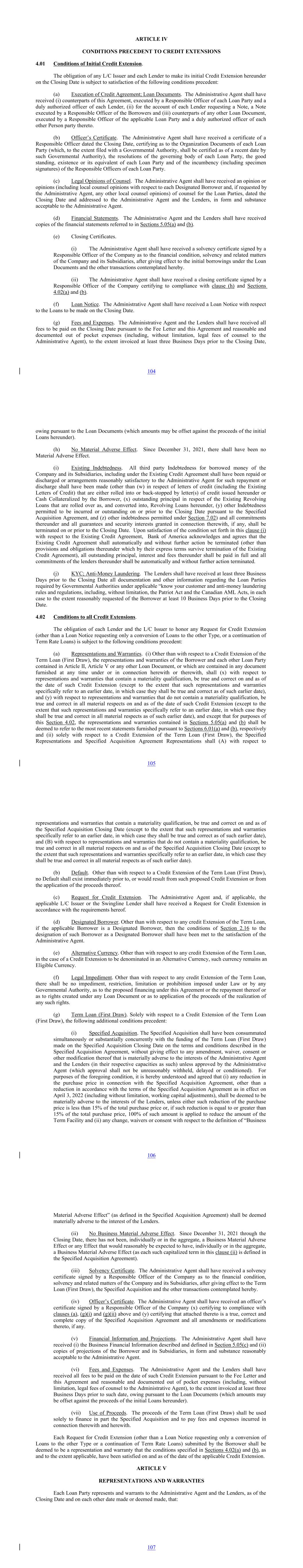 ARTICLE IV CONDITIONS PRECEDENT TO CREDIT EXTENSIONS 4.01 Conditions of Initial Credit Extension. The obligation of any L/C Issuer and each Lender to make its initial Credit Extension hereunder on the Closing Date is subject to satisfaction of the following conditions precedent: (a) Execution of Credit Agreement; Loan Documents. The Administrative Agent shall have received (i) counterparts of this Agreement, executed by a Responsible Officer of each Loan Party and a duly authorized officer of each Lender, (ii) for the account of each Lender requesting a Note, a Note executed by a Responsible Officer of the Borrowers and (iii) counterparts of any other Loan Document, executed by a Responsible Officer of the applicable Loan Party and a duly authorized officer of each other Person party thereto. (b) Officer’s Certificate. The Administrative Agent shall have received a certificate of a Responsible Officer dated the Closing Date, certifying as to the Organization Documents of each Loan Party (which, to the extent filed with a Governmental Authority, shall be certified as of a recent date by such Governmental Authority), the resolutions of the governing body of each Loan Party, the good standing, existence or its equivalent of each Loan Party and of the incumbency (including specimen signatures) of the Responsible Officers of each Loan Party. (c) Legal Opinions of Counsel. The Administrative Agent shall have received an opinion or opinions (including local counsel opinions with respect to each Designated Borrower and, if requested by the Administrative Agent, any other local counsel opinions) of counsel for the Loan Parties, dated the Closing Date and addressed to the Administrative Agent and the Lenders, in form and substance acceptable to the Administrative Agent. (d) Financial Statements. The Administrative Agent and the Lenders shall have received copies of the financial statements referred to in Sections 5.05(a) and (b). (e) Closing Certificates. (i) The Administrative Agent shall have received a solvency certificate signed by a Responsible Officer of the Company as to the financial condition, solvency and related matters of the Company and its Subsidiaries, after giving effect to the initial borrowings under the Loan Documents and the other transactions contemplated hereby. (ii) The Administrative Agent shall have received a closing certificate signed by a Responsible Officer of the Company certifying to compliance with clause (h) and Sections 4.02(a) and (b). (f) Loan Notice. The Administrative Agent shall have received a Loan Notice with respect to the Loans to be made on the Closing Date. (g) Fees and Expenses. The Administrative Agent and the Lenders shall have received all fees to be paid on the Closing Date pursuant to the Fee Letter and this Agreement and reasonable and documented out of pocket expenses (including, without limitation, legal fees of counsel to the Administrative Agent), to the extent invoiced at least three Business Days prior to the Closing Date, 104 owing pursuant to the Loan Documents (which amounts may be offset against the proceeds of the initial Loans hereunder). (h) No Material Adverse Effect. Since December 31, 2021, there shall have been no Material Adverse Effect. (i) Existing Indebtedness. All third party Indebtedness for borrowed money of the Company and its Subsidiaries, including under the Existing Credit Agreement shall have been repaid or discharged or arrangements reasonably satisfactory to the Administrative Agent for such repayment or discharge shall have been made (other than (w) in respect of letters of credit (including the Existing Letters of Credit) that are either rolled into or back-stopped by letter(s) of credit issued hereunder or Cash Collateralized by the Borrower, (x) outstanding principal in respect of the Existing Revolving Loans that are rolled over as, and converted into, Revolving Loans hereunder, (y) other Indebtedness permitted to be incurred or outstanding on or prior to the Closing Date pursuant to the Specified Acquisition Agreement, and (z) other indebtedness permitted under Section 7.02) and all commitments thereunder and all guarantees and security interests granted in connection therewith, if any, shall be terminated on or prior to the Closing Date. Upon satisfaction of the condition set forth in this clause (i) with respect to the Existing Credit Agreement, Bank of America acknowledges and agrees that the Existing Credit Agreement shall automatically and without further action be terminated (other than provisions and obligations thereunder which by their express terms survive termination of the Existing Credit Agreement), all outstanding principal, interest and fees thereunder shall be paid in full and all commitments of the lenders thereunder shall be automatically and without further action terminated. (j) KYC; Anti-Money Laundering. The Lenders shall have received at least three Business Days prior to the Closing Date all documentation and other information regarding the Loan Parties required by Governmental Authorities under applicable “know your customer and anti-money laundering rules and regulations, including, without limitation, the Patriot Act and the Canadian AML Acts, in each case to the extent reasonably requested of the Borrower at least 10 Business Days prior to the Closing Date. 4.02 Conditions to all Credit Extensions. The obligation of each Lender and the L/C Issuer to honor any Request for Credit Extension (other than a Loan Notice requesting only a conversion of Loans to the other Type, or a continuation of Term Rate Loans) is subject to the following conditions precedent: (a) Representations and Warranties. (i) Other than with respect to a Credit Extension of the Term Loan (First Draw), the representations and warranties of the Borrower and each other Loan Party contained in Article II, Article V or any other Loan Document, or which are contained in any document furnished at any time under or in