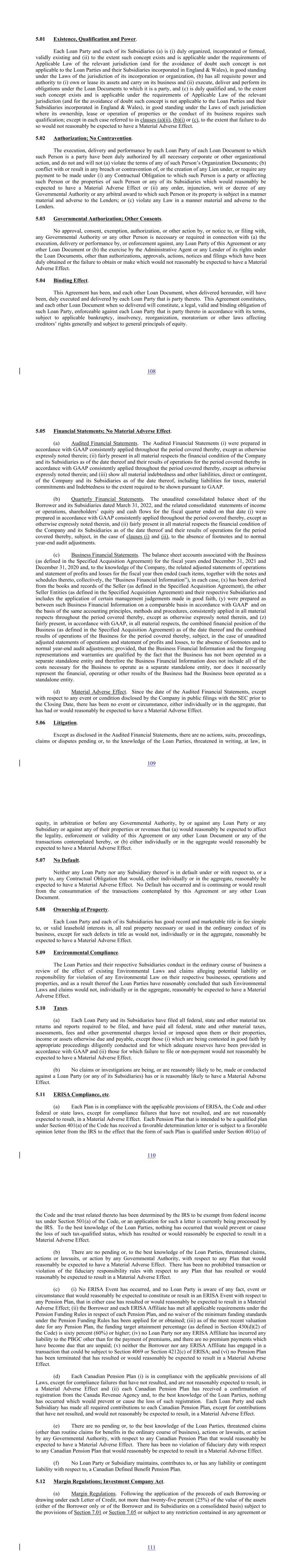 5.01 Existence, Qualification and Power. Each Loan Party and each of its Subsidiaries (a) is (i) duly organized, incorporated or formed, validly existing and (ii) to the extent such concept exists and is applicable under the requirements of Applicable Law of the relevant jurisdiction (and for the avoidance of doubt such concept is not applicable to the Loan Parties and their Subsidiaries incorporated in England & Wales), in good standing under the Laws of the jurisdiction of its incorporation or organization, (b) has all requisite power and authority to (i) own or lease its assets and carry on its business and (ii) execute, deliver and perform its obligations under the Loan Documents to which it is a party, and (c) is duly qualified and, to the extent such concept exists and is applicable under the requirements of Applicable Law of the relevant jurisdiction (and for the avoidance of doubt such concept is not applicable to the Loan Parties and their Subsidiaries incorporated in England & Wales), in good standing under the Laws of each jurisdiction where its ownership, lease or operation of properties or the conduct of its business requires such qualification; except in each case referred to in clauses (a)(ii), (b)(i) or (c), to the extent that failure to do so would not reasonably be expected to have a Material Adverse Effect. 5.02 Authorization; No Contravention. The execution, delivery and performance by each Loan Party of each Loan Document to which such Person is a party have been duly authorized by all necessary corporate or other organizational action, and do not and will not (a) violate the terms of any of such Person’s Organization Documents; (b) conflict with or result in any breach or contravention of, or the creation of any Lien under, or require any payment to be made under (i) any Contractual Obligation to which such Person is a party or affecting such Person or the properties of such Person or any of its Subsidiaries which would reasonably be expected to have a Material Adverse Effect or (ii) any order, injunction, writ or decree of any Governmental Authority or any arbitral award to which such Person or its property is subject in a manner material and adverse to the Lenders; or (c) violate any Law in a manner material and adverse to the Lenders. 5.03 Governmental Authorization; Other Consents. No approval, consent, exemption, authorization, or other action by, or notice to, or filing with, any Governmental Authority or any other Person is necessary or required in connection with (a) the execution, delivery or performance by, or enforcement against, any Loan Party of this Agreement or any other Loan Document or (b) the exercise by the Administrative Agent or any Lender of its rights under the Loan Documents, other than authorizations, approvals, actions, notices and filings which have been duly obtained or the failure to obtain or make which would not reasonably be expected to have a Material Adverse Effect. 5.04 Binding Effect. This Agreement has been, and each other Loan Document, when delivered hereunder, will have been, duly executed and delivered by each Loan Party that is party thereto. This Agreement constitutes, and each other Loan Document when so delivered will constitute, a legal, valid and binding obligation of such Loan Party, enforceable against each Loan Party that is party thereto in accordance with its terms, subject to applicable bankruptcy, insolvency, reorganization, moratorium or other laws affecting creditors’ rights generally and subject to general principals of equity. 108 5.05 Financial Statements; No Material Adverse Effect. (a) Audited Financial Statements. The Audited Financial Statements (i) were prepared in accordance with GAAP consistently applied throughout the period covered thereby, except as otherwise expressly noted therein; (ii) fairly present in all material respects the financial condition of the Company and its Subsidiaries as of the date thereof and their results of operations for the period covered thereby in accordance with GAAP consistently applied throughout the period covered thereby, except as otherwise expressly noted therein; and (iii) show all material indebtedness and other liabilities, direct or contingent, of the Company and its Subsidiaries as of the date thereof, including liabilities for taxes, material commitments and Indebtedness to the extent required to be shown pursuant to GAAP. (b) Quarterly Financial Statements. The unaudited consolidated balance sheet of the Borrower and its Subsidiaries dated March 31, 2022, and the related consolidated statements of income or operations, shareholders’ equity and cash flows for the fiscal quarter ended on that date (i) were prepared in accordance with GAAP consistently applied throughout the period covered thereby, except as otherwise expressly noted therein, and (ii) fairly present in all material respects the financial condition of the Company and its Subsidiaries as of the date thereof and their results of operations for the period covered thereby, subject, in the case of clauses (i) and (ii), to the absence of footnotes and to normal year-end audit adjustments. (c) Business Financial Statements. The balance sheet accounts associated with the Business (as defined in the Specified Acquisition Agreement) for the fiscal years ended December 31, 2021 and December 31, 2020 and, to the knowledge of the Company, the related adjusted statements of operations and statement of profits and losses for the fiscal year then ended (such items, together with the notes and schedules thereto, collectively, the “Business Financial Information”), in each case, (x) has been derived from the books and records of the Seller (as defined in the Specified Acquisition Agreement), the other Seller Entities (as defined in the Specified Acquisition Agreement) and their respective Subsidiaries and includes the application of certain management judgements made in good faith, (y) were prepared as 
