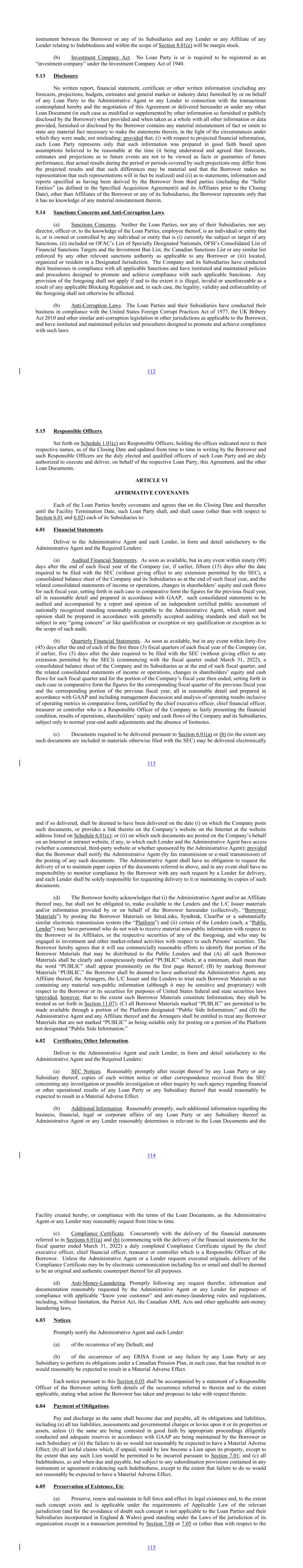 instrument between the Borrower or any of its Subsidiaries and any Lender or any Affiliate of any Lender relating to Indebtedness and within the scope of Section 8.01(e) will be margin stock. (b) Investment Company Act. No Loan Party is or is required to be registered as an “investment company” under the Investment Company Act of 1940. 5.13 Disclosure. No written report, financial statement, certificate or other written information (excluding any forecasts, projections, budgets, estimates and general market or industry data) furnished by or on behalf of any Loan Party to the Administrative Agent or any Lender in connection with the transactions contemplated hereby and the negotiation of this Agreement or delivered hereunder or under any other Loan Document (in each case as modified or supplemented by other information so furnished or publicly disclosed by the Borrower) when provided and when taken as a whole with all other information or data provided, furnished or disclosed by the Borrower contains any material misstatement of fact or omits to state any material fact necessary to make the statements therein, in the light of the circumstances under which they were made, not misleading; provided that, (i) with respect to projected financial information, each Loan Party represents only that such information was prepared in good faith based upon assumptions believed to be reasonable at the time (it being understood and agreed that forecasts, estimates and projections as to future events are not to be viewed as facts or guaranties of future performance, that actual results during the period or periods covered by such projections may differ from the projected results and that such differences may be material and that the Borrower makes no representation that such representations will in fact be realized) and (ii) as to statements, information and reports specified as having been derived by the Borrower from third parties (including the “Seller Entities” (as defined in the Specified Acquisition Agreement)) and its Affiliates prior to the Closing Date), other than Affiliates of the Borrower or any of its Subsidiaries, the Borrower represents only that it has no knowledge of any material misstatement therein. 5.14 Sanctions Concerns and Anti-Corruption Laws. (a) Sanctions Concerns. Neither the Loan Parties, nor any of their Subsidiaries, nor any director, officer or, to the knowledge of the Loan Parties, employee thereof, is an individual or entity that is, or is owned or controlled by any individual or entity that is (i) currently the subject or target of any Sanctions, (ii) included on OFAC’s List of Specially Designated Nationals, OFSI’s Consolidated List of Financial Sanctions Targets and the Investment Ban List, the Canadian Sanctions List or any similar list enforced by any other relevant sanctions authority as applicable to any Borrower or (iii) located, organized or resident in a Designated Jurisdiction. The Company and its Subsidiaries have conducted their businesses in compliance with all applicable Sanctions and have instituted and maintained policies and procedures designed to promote and achieve compliance with such applicable Sanctions. Any provision of the foregoing shall not apply if and to the extent it is illegal, invalid or unenforceable as a result of any applicable Blocking Regulation and, in such case, the legality, validity and enforceability of the foregoing shall not otherwise be affected. (b) Anti-Corruption Laws. The Loan Parties and their Subsidiaries have conducted their business in compliance with the United States Foreign Corrupt Practices Act of 1977, the UK Bribery Act 2010 and other similar anti-corruption legislation in other jurisdictions as applicable to the Borrower, and have instituted and maintained policies and procedures designed to promote and achieve compliance with such laws. 112 5.15 Responsible Officers. Set forth on Schedule 1.01(c) are Responsible Officers, holding the offices indicated next to their respective names, as of the Closing Date and updated from time to time in writing by the Borrower and such Responsible Officers are the duly elected and qualified officers of such Loan Party and are duly authorized to execute and deliver, on behalf of the respective Loan Party, this Agreement, and the other Loan Documents. ARTICLE VI AFFIRMATIVE COVENANTS Each of the Loan Parties hereby covenants and agrees that on the Closing Date and thereafter until the Facility Termination Date, such Loan Party shall, and shall cause (other than with respect to Section 6.01 and 6.02) each of its Subsidiaries to: 6.01 Financial Statements. Deliver to the Administrative Agent and each Lender, in form and detail satisfactory to the Administrative Agent and the Required Lenders: (a) Audited Financial Statements. As soon as available, but in any event within ninety (90) days after the end of each fiscal year of the Company (or, if earlier, fifteen (15) days after the date required to be filed with the SEC (without giving effect to any extension permitted by the SEC), a consolidated balance sheet of the Company and its Subsidiaries as at the end of such fiscal year, and the related consolidated statements of income or operations, changes in shareholders’ equity and cash flows for such fiscal year, setting forth in each case in comparative form the figures for the previous fiscal year, all in reasonable detail and prepared in accordance with GAAP, such consolidated statements to be audited and accompanied by a report and opinion of an independent certified public accountant of nationally recognized standing reasonably acceptable to the Administrative Agent, which report and opinion shall be prepared in accordance with generally accepted auditing standards and shall not be subject to any “going concern” or like qualification or exception or any qualification or exception as to the scope of such audit. (b) Quarterly Financial Statements. As soon as availa