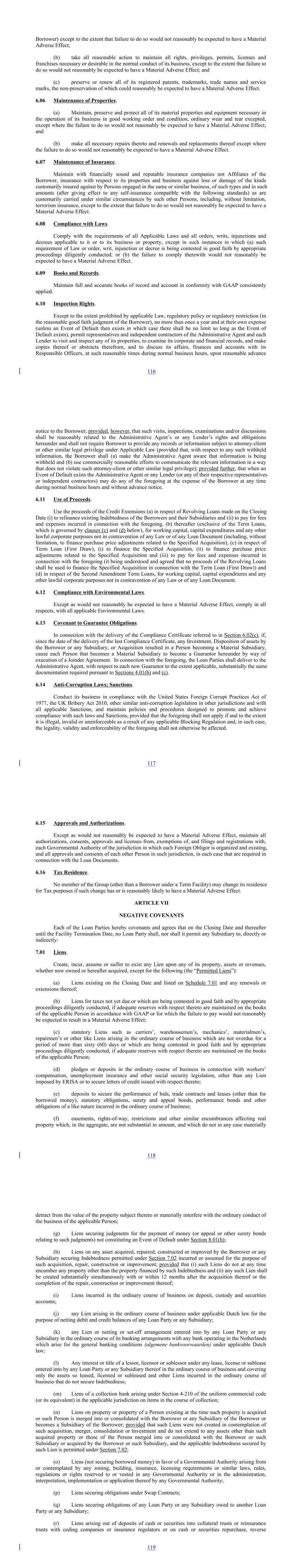 Borrower) except to the extent that failure to do so would not reasonably be expected to have a Material Adverse Effect; (b) take all reasonable action to maintain all rights, privileges, permits, licenses and franchises necessary or desirable in the normal conduct of its business, except to the extent that failure to do so would not reasonably be expected to have a Material Adverse Effect; and (c) preserve or renew all of its registered patents, trademarks, trade names and service marks, the non-preservation of which could reasonably be expected to have a Material Adverse Effect. 6.06 Maintenance of Properties. (a) Maintain, preserve and protect all of its material properties and equipment necessary in the operation of its business in good working order and condition, ordinary wear and tear excepted, except where the failure to do so would not reasonably be expected to have a Material Adverse Effect; and (b) make all necessary repairs thereto and renewals and replacements thereof except where the failure to do so would not reasonably be expected to have a Material Adverse Effect. 6.07 Maintenance of Insurance. Maintain with financially sound and reputable insurance companies not Affiliates of the Borrower, insurance with respect to its properties and business against loss or damage of the kinds customarily insured against by Persons engaged in the same or similar business, of such types and in such amounts (after giving effect to any self-insurance compatible with the following standards) as are customarily carried under similar circumstances by such other Persons, including, without limitation, terrorism insurance, except to the extent that failure to do so would not reasonably be expected to have a Material Adverse Effect. 6.08 Compliance with Laws. Comply with the requirements of all Applicable Laws and all orders, writs, injunctions and decrees applicable to it or to its business or property, except in such instances in which (a) such requirement of Law or order, writ, injunction or decree is being contested in good faith by appropriate proceedings diligently conducted; or (b) the failure to comply therewith would not reasonably be expected to have a Material Adverse Effect. 6.09 Books and Records. Maintain full and accurate books of record and account in conformity with GAAP consistently applied. 6.10 Inspection Rights. Except to the extent prohibited by applicable Law, regulatory policy or regulatory restriction (in the reasonable good faith judgment of the Borrower), no more than once a year and at their own expense (unless an Event of Default then exists in which case there shall be no limit so long as the Event of Default exists), permit representatives and independent contractors of the Administrative Agent and each Lender to visit and inspect any of its properties, to examine its corporate and financial records, and make copies thereof or abstracts therefrom, and to discuss its affairs, finances and accounts with its Responsible Officers, at such reasonable times during normal business hours, upon reasonable advance 116 notice to the Borrower; provided, however, that such visits, inspections, examinations and/or discussions shall be reasonably related to the Administrative Agent’s or any Lender’s rights and obligations hereunder and shall not require Borrower to provide any records or information subject to attorney-client or other similar legal privilege under Applicable Law (provided that, with respect to any such withheld information, the Borrower shall (a) make the Administrative Agent aware that information is being withheld and (b) use commercially reasonable efforts to communicate the relevant information in a way that does not violate such attorney-client or other similar legal privilege); provided further, that when an Event of Default exists the Administrative Agent or any Lender (or any of their respective representatives or independent contractors) may do any of the foregoing at the expense of the Borrower at any time during normal business hours and without advance notice. 6.11 Use of Proceeds. Use the proceeds of the Credit Extensions (a) in respect of Revolving Loans made on the Closing Date (i) to refinance existing Indebtedness of the Borrowers and their Subsidiaries and (ii) to pay for fees and expenses incurred in connection with the foregoing, (b) thereafter (exclusive of the Term Loans, which is governed by clauses (c) and (d) below), for working capital, capital expenditures and any other lawful corporate purposes not in contravention of any Law or of any Loan Document (including, without limitation, to finance purchase price adjustments related to the Specified Acquisition), (c) in respect of Term Loan (First Draw), (i) to finance the Specified Acquisition, (ii) to finance purchase price adjustments related to the Specified Acquisition and (iii) to pay for fees and expenses incurred in connection with the foregoing (it being understood and agreed that no proceeds of the Revolving Loans shall be used to finance the Specified Acquisition in connection with the Term Loan (First Draw)) and (d) in respect of the Second Amendment Term Loans, for working capital, capital expenditures and any other lawful corporate purposes not in contravention of any Law or of any Loan Document. 6.12 Compliance with Environmental Laws. Except as would not reasonably be expected to have a Material Adverse Effect, comply in all respects, with all applicable Environmental Laws. 6.13 Covenant to Guarantee Obligations. In connection with the delivery of the Compliance Certificate referred to in Section 6.02(c), if, since the date of the delivery of the last Compliance Certificate, any Investment, Disposition of assets by the Borrower or any Subsidiary, or Acquisition resulted in a Person becoming a Material Subsidiary, cause each Person that becomes a Material Subsidiary to become a Guarantor hereunder by way of execution of a Joinder Agreement. In connection with the foregoing