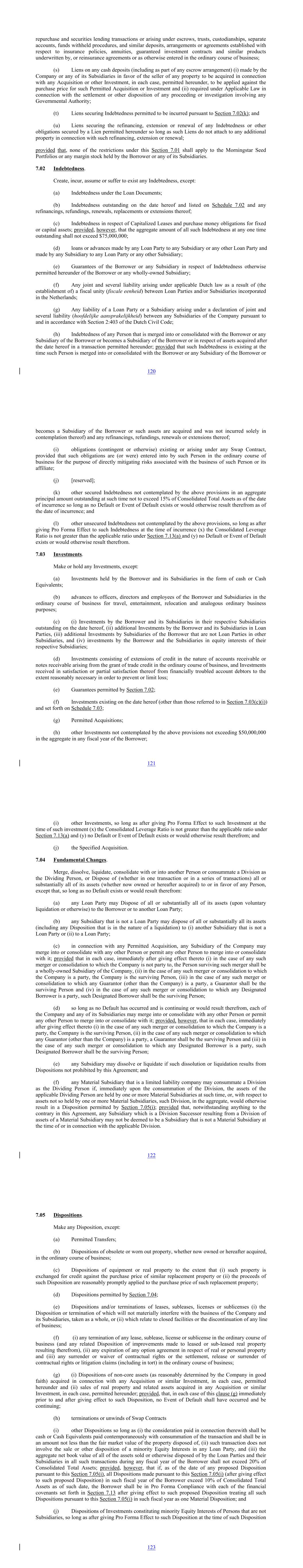 repurchase and securities lending transactions or arising under escrows, trusts, custodianships, separate accounts, funds withheld procedures, and similar deposits, arrangements or agreements established with respect to insurance policies, annuities, guaranteed investment contracts and similar products underwritten by, or reinsurance agreements or as otherwise entered in the ordinary course of business; (s) Liens on any cash deposits (including as part of any escrow arrangement) (i) made by the Company or any of its Subsidiaries in favor of the seller of any property to be acquired in connection with any Acquisition or other Investment, in each case, permitted hereunder, to be applied against the purchase price for such Permitted Acquisition or Investment and (ii) required under Applicable Law in connection with the settlement or other disposition of any proceeding or investigation involving any Governmental Authority; (t) Liens securing Indebtedness permitted to be incurred pursuant to Section 7.02(k); and (u) Liens securing the refinancing, extension or renewal of any Indebtedness or other obligations secured by a Lien permitted hereunder so long as such Liens do not attach to any additional property in connection with such refinancing, extension or renewal; provided that, none of the restrictions under this Section 7.01 shall apply to the Morningstar Seed Portfolios or any margin stock held by the Borrower or any of its Subsidiaries. 7.02 Indebtedness. Create, incur, assume or suffer to exist any Indebtedness, except: (a) Indebtedness under the Loan Documents; (b) Indebtedness outstanding on the date hereof and listed on Schedule 7.02 and any refinancings, refundings, renewals, replacements or extensions thereof; (c) Indebtedness in respect of Capitalized Leases and purchase money obligations for fixed or capital assets; provided, however, that the aggregate amount of all such Indebtedness at any one time outstanding shall not exceed $75,000,000; (d) loans or advances made by any Loan Party to any Subsidiary or any other Loan Party and made by any Subsidiary to any Loan Party or any other Subsidiary; (e) Guarantees of the Borrower or any Subsidiary in respect of Indebtedness otherwise permitted hereunder of the Borrower or any wholly-owned Subsidiary; (f) Any joint and several liability arising under applicable Dutch law as a result of (the establishment of) a fiscal unity (fiscale eenheid) between Loan Parties and/or Subsidiaries incorporated in the Netherlands; (g) Any liability of a Loan Party or a Subsidiary arising under a declaration of joint and several liability (hoofdelijke aansprakelijkheid) between any Subsidiaries of the Company pursuant to and in accordance with Section 2:403 of the Dutch Civil Code; (h) Indebtedness of any Person that is merged into or consolidated with the Borrower or any Subsidiary of the Borrower or becomes a Subsidiary of the Borrower or in respect of assets acquired after the date hereof in a transaction permitted hereunder; provided that such Indebtedness is existing at the time such Person is merged into or consolidated with the Borrower or any Subsidiary of the Borrower or 120 becomes a Subsidiary of the Borrower or such assets are acquired and was not incurred solely in contemplation thereof) and any refinancings, refundings, renewals or extensions thereof; (i) obligations (contingent or otherwise) existing or arising under any Swap Contract, provided that such obligations are (or were) entered into by such Person in the ordinary course of business for the purpose of directly mitigating risks associated with the business of such Person or its affiliate; (j) [reserved]; (k) other secured Indebtedness not contemplated by the above provisions in an aggregate principal amount outstanding at such time not to exceed 15% of Consolidated Total Assets as of the date of incurrence so long as no Default or Event of Default exists or would otherwise result therefrom as of the date of incurrence; and (l) other unsecured Indebtedness not contemplated by the above provisions, so long as after giving Pro Forma Effect to such Indebtedness at the time of incurrence (x) the Consolidated Leverage Ratio is not greater than the applicable ratio under Section 7.13(a) and (y) no Default or Event of Default exists or would otherwise result therefrom. 7.03 Investments. Make or hold any Investments, except: (a) Investments held by the Borrower and its Subsidiaries in the form of cash or Cash Equivalents; (b) advances to officers, directors and employees of the Borrower and Subsidiaries in the ordinary course of business for travel, entertainment, relocation and analogous ordinary business purposes; (c) (i) Investments by the Borrower and its Subsidiaries in their respective Subsidiaries outstanding on the date hereof, (ii) additional Investments by the Borrower and its Subsidiaries in Loan Parties, (iii) additional Investments by Subsidiaries of the Borrower that are not Loan Parties in other Subsidiaries, and (iv) investments by the Borrower and the Subsidiaries in equity interests of their respective Subsidiaries; (d) Investments consisting of extensions of credit in the nature of accounts receivable or notes receivable arising from the grant of trade credit in the ordinary course of business, and Investments received in satisfaction or partial satisfaction thereof from financially troubled account debtors to the extent reasonably necessary in order to prevent or limit loss; (e) Guarantees permitted by Section 7.02; (f) Investments existing on the date hereof (other than those referred to in Section 7.03(c)(i)) and set forth on Schedule 7.03; (g) Permitted Acquisitions; (h) other Investments not contemplated by the above provisions not exceeding $50,000,000 in the aggregate in any fiscal year of the Borrower; 121 (i) other Investments, so long as after giving Pro Forma Effect to such Investment at the time of such investment (x) the Consolidated Leverage Ratio is not gr