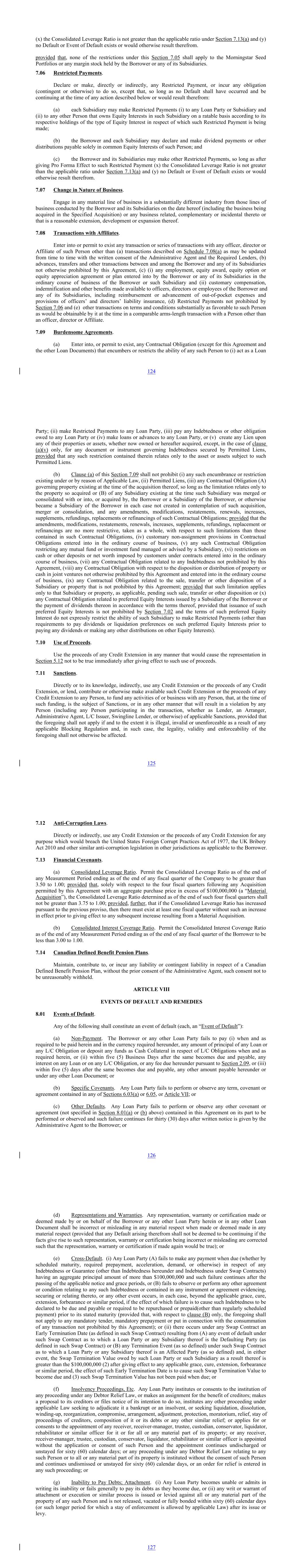(x) the Consolidated Leverage Ratio is not greater than the applicable ratio under Section 7.13(a) and (y) no Default or Event of Default exists or would otherwise result therefrom. provided that, none of the restrictions under this Section 7.05 shall apply to the Morningstar Seed Portfolios or any margin stock held by the Borrower or any of its Subsidiaries. 7.06 Restricted Payments. Declare or make, directly or indirectly, any Restricted Payment, or incur any obligation (contingent or otherwise) to do so, except that, so long as no Default shall have occurred and be continuing at the time of any action described below or would result therefrom: (a) each Subsidiary may make Restricted Payments (i) to any Loan Party or Subsidiary and (ii) to any other Person that owns Equity Interests in such Subsidiary on a ratable basis according to its respective holdings of the type of Equity Interest in respect of which such Restricted Payment is being made; (b) the Borrower and each Subsidiary may declare and make dividend payments or other distributions payable solely in common Equity Interests of such Person; and (c) the Borrower and its Subsidiaries may make other Restricted Payments, so long as after giving Pro Forma Effect to such Restricted Payment (x) the Consolidated Leverage Ratio is not greater than the applicable ratio under Section 7.13(a) and (y) no Default or Event of Default exists or would otherwise result therefrom. 7.07 Change in Nature of Business. Engage in any material line of business in a substantially different industry from those lines of business conducted by the Borrower and its Subsidiaries on the date hereof (including the business being acquired in the Specified Acquisition) or any business related, complementary or incidental thereto or that is a reasonable extension, development or expansion thereof. 7.08 Transactions with Affiliates. Enter into or permit to exist any transaction or series of transactions with any officer, director or Affiliate of such Person other than (a) transactions described on Schedule 7.08(a) as may be updated from time to time with the written consent of the Administrative Agent and the Required Lenders, (b) advances, transfers and other transactions between and among the Borrower and any of its Subsidiaries not otherwise prohibited by this Agreement, (c) (i) any employment, equity award, equity option or equity appreciation agreement or plan entered into by the Borrower or any of its Subsidiaries in the ordinary course of business of the Borrower or such Subsidiary and (ii) customary compensation, indemnification and other benefits made available to officers, directors or employees of the Borrower and any of its Subsidiaries, including reimbursement or advancement of out-of-pocket expenses and provisions of officers’ and directors’ liability insurance, (d) Restricted Payments not prohibited by Section 7.06 and (e) other transactions on terms and conditions substantially as favorable to such Person as would be obtainable by it at the time in a comparable arms-length transaction with a Person other than an officer, director or Affiliate. 7.09 Burdensome Agreements. (a) Enter into, or permit to exist, any Contractual Obligation (except for this Agreement and the other Loan Documents) that encumbers or restricts the ability of any such Person to (i) act as a Loan 124 Party; (ii) make Restricted Payments to any Loan Party, (iii) pay any Indebtedness or other obligation owed to any Loan Party or (iv) make loans or advances to any Loan Party, or (v) create any Lien upon any of their properties or assets, whether now owned or hereafter acquired, except, in the case of clause (a)(v) only, for any document or instrument governing Indebtedness secured by Permitted Liens, provided that any such restriction contained therein relates only to the asset or assets subject to such Permitted Liens. (b) Clause (a) of this Section 7.09 shall not prohibit (i) any such encumbrance or restriction existing under or by reason of Applicable Law, (ii) Permitted Liens, (iii) any Contractual Obligation (A) governing property existing at the time of the acquisition thereof, so long as the limitation relates only to the property so acquired or (B) of any Subsidiary existing at the time such Subsidiary was merged or consolidated with or into, or acquired by, the Borrower or a Subsidiary of the Borrower, or otherwise became a Subsidiary of the Borrower in each case not created in contemplation of such acquisition, merger or consolidation, and any amendments, modifications, restatements, renewals, increases, supplements, refundings, replacements or refinancings of such Contractual Obligations; provided that the amendments, modifications, restatements, renewals, increases, supplements, refundings, replacement or refinancings are no more restrictive, taken as a whole, with respect to such limitations than those contained in such Contractual Obligations, (iv) customary non-assignment provisions in Contractual Obligations entered into in the ordinary course of business, (v) any such Contractual Obligation restricting any mutual fund or investment fund managed or advised by a Subsidiary, (vi) restrictions on cash or other deposits or net worth imposed by customers under contracts entered into in the ordinary course of business, (vii) any Contractual Obligation related to any Indebtedness not prohibited by this Agreement, (viii) any Contractual Obligation with respect to the disposition or distribution of property or cash in joint ventures not otherwise prohibited by this Agreement and entered into in the ordinary course of business, (ix) any Contractual Obligation related to the sale, transfer or other disposition of a Subsidiary or property that is not prohibited by this Agreement; provided that such limitation applies only to that Subsidiary or property, as applicable, pending such sale, transfer or other disposition or (x) any Contractual Obligation related to preferred Equ