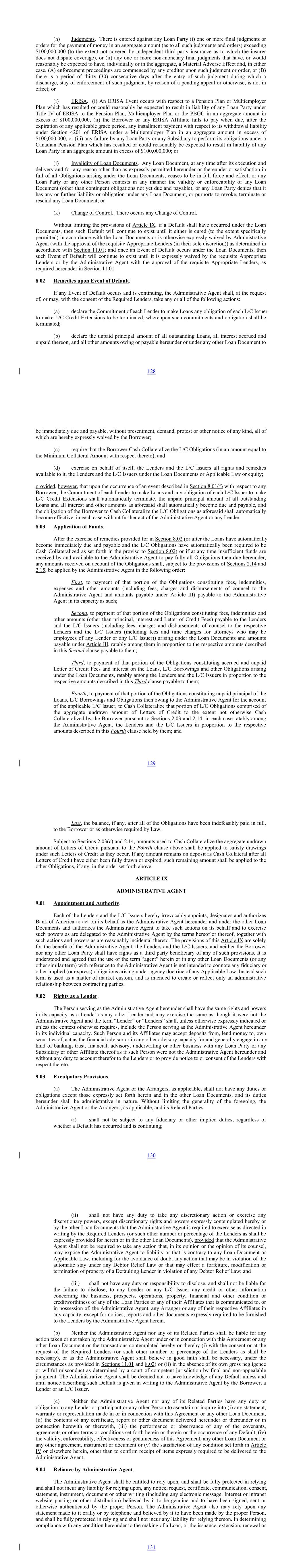 (h) Judgments. There is entered against any Loan Party (i) one or more final judgments or orders for the payment of money in an aggregate amount (as to all such judgments and orders) exceeding $100,000,000 (to the extent not covered by independent third-party insurance as to which the insurer does not dispute coverage), or (ii) any one or more non-monetary final judgments that have, or would reasonably be expected to have, individually or in the aggregate, a Material Adverse Effect and, in either case, (A) enforcement proceedings are commenced by any creditor upon such judgment or order, or (B) there is a period of thirty (30) consecutive days after the entry of such judgment during which a discharge, stay of enforcement of such judgment, by reason of a pending appeal or otherwise, is not in effect; or (i) ERISA. (i) An ERISA Event occurs with respect to a Pension Plan or Multiemployer Plan which has resulted or could reasonably be expected to result in liability of any Loan Party under Title IV of ERISA to the Pension Plan, Multiemployer Plan or the PBGC in an aggregate amount in excess of $100,000,000, (ii) the Borrower or any ERISA Affiliate fails to pay when due, after the expiration of any applicable grace period, any installment payment with respect to its withdrawal liability under Section 4201 of ERISA under a Multiemployer Plan in an aggregate amount in excess of $100,000,000, or (iii) any failure by any Loan Party or any Subsidiary to perform its obligations under a Canadian Pension Plan which has resulted or could reasonably be expected to result in liability of any Loan Party in an aggregate amount in excess of $100,000,000; or (j) Invalidity of Loan Documents. Any Loan Document, at any time after its execution and delivery and for any reason other than as expressly permitted hereunder or thereunder or satisfaction in full of all Obligations arising under the Loan Documents, ceases to be in full force and effect; or any Loan Party or any other Person contests in any manner the validity or enforceability of any Loan Document (other than contingent obligations not yet due and payable); or any Loan Party denies that it has any or further liability or obligation under any Loan Document, or purports to revoke, terminate or rescind any Loan Document; or (k) Change of Control. There occurs any Change of Control. Without limiting the provisions of Article IX, if a Default shall have occurred under the Loan Documents, then such Default will continue to exist until it either is cured (to the extent specifically permitted) in accordance with the Loan Documents or is otherwise expressly waived by Administrative Agent (with the approval of the requisite Appropriate Lenders (in their sole discretion)) as determined in accordance with Section 11.01; and once an Event of Default occurs under the Loan Documents, then such Event of Default will continue to exist until it is expressly waived by the requisite Appropriate Lenders or by the Administrative Agent with the approval of the requisite Appropriate Lenders, as required hereunder in Section 11.01. 8.02 Remedies upon Event of Default. If any Event of Default occurs and is continuing, the Administrative Agent shall, at the request of, or may, with the consent of the Required Lenders, take any or all of the following actions: (a) declare the Commitment of each Lender to make Loans any obligation of each L/C Issuer to make L/C Credit Extensions to be terminated, whereupon such commitments and obligation shall be terminated; (b) declare the unpaid principal amount of all outstanding Loans, all interest accrued and unpaid thereon, and all other amounts owing or payable hereunder or under any other Loan Document to 128 be immediately due and payable, without presentment, demand, protest or other notice of any kind, all of which are hereby expressly waived by the Borrower; (c) require that the Borrower Cash Collateralize the L/C Obligations (in an amount equal to the Minimum Collateral Amount with respect thereto); and (d) exercise on behalf of itself, the Lenders and the L/C Issuers all rights and remedies available to it, the Lenders and the L/C Issuers under the Loan Documents or Applicable Law or equity; provided, however, that upon the occurrence of an event described in Section 8.01(f) with respect to any Borrower, the Commitment of each Lender to make Loans and any obligation of each L/C Issuer to make L/C Credit Extensions shall automatically terminate, the unpaid principal amount of all outstanding Loans and all interest and other amounts as aforesaid shall automatically become due and payable, and the obligation of the Borrower to Cash Collateralize the L/C Obligations as aforesaid shall automatically become effective, in each case without further act of the Administrative Agent or any Lender. 8.03 Application of Funds. After the exercise of remedies provided for in Section 8.02 (or after the Loans have automatically become immediately due and payable and the L/C Obligations have automatically been required to be Cash Collateralized as set forth in the proviso to Section 8.02) or if at any time insufficient funds are received by and available to the Administrative Agent to pay fully all Obligations then due hereunder, any amounts received on account of the Obligations shall, subject to the provisions of Sections 2.14 and 2.15, be applied by the Administrative Agent in the following order: First, to payment of that portion of the Obligations constituting fees, indemnities, expenses and other amounts (including fees, charges and disbursements of counsel to the Administrative Agent and amounts payable under Article III) payable to the Administrative Agent in its capacity as such; Second, to payment of that portion of the Obligations constituting fees, indemnities and other amounts (other than principal, interest and Letter of Credit Fees) payable to the Lenders and the L/C Issuers (including fees, charges and disbursements of counsel to the