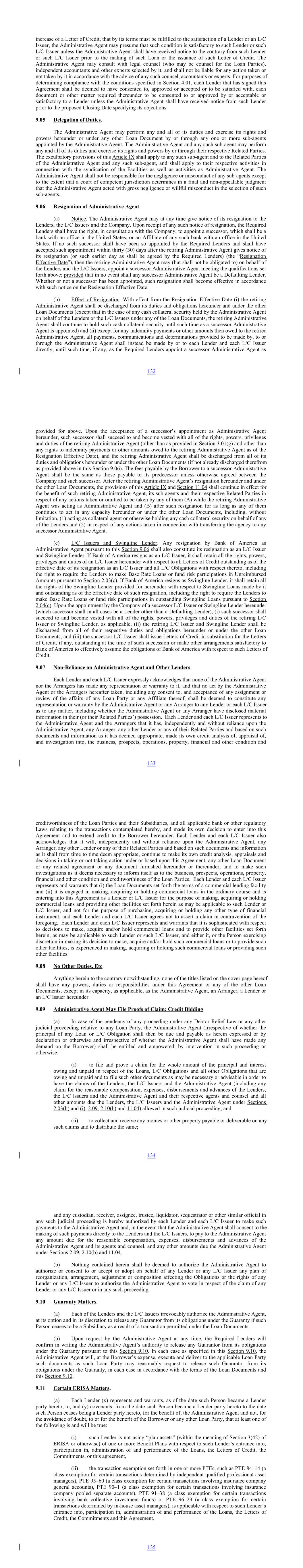 increase of a Letter of Credit, that by its terms must be fulfilled to the satisfaction of a Lender or an L/C Issuer, the Administrative Agent may presume that such condition is satisfactory to such Lender or such L/C Issuer unless the Administrative Agent shall have received notice to the contrary from such Lender or such L/C Issuer prior to the making of such Loan or the issuance of such Letter of Credit. The Administrative Agent may consult with legal counsel (who may be counsel for the Loan Parties), independent accountants and other experts selected by it, and shall not be liable for any action taken or not taken by it in accordance with the advice of any such counsel, accountants or experts. For purposes of determining compliance with the conditions specified in Section 4.01, each Lender that has signed this Agreement shall be deemed to have consented to, approved or accepted or to be satisfied with, each document or other matter required thereunder to be consented to or approved by or acceptable or satisfactory to a Lender unless the Administrative Agent shall have received notice from such Lender prior to the proposed Closing Date specifying its objections. 9.05 Delegation of Duties. The Administrative Agent may perform any and all of its duties and exercise its rights and powers hereunder or under any other Loan Document by or through any one or more sub-agents appointed by the Administrative Agent. The Administrative Agent and any such sub-agent may perform any and all of its duties and exercise its rights and powers by or through their respective Related Parties. The exculpatory provisions of this Article IX shall apply to any such sub-agent and to the Related Parties of the Administrative Agent and any such sub-agent, and shall apply to their respective activities in connection with the syndication of the Facilities as well as activities as Administrative Agent. The Administrative Agent shall not be responsible for the negligence or misconduct of any sub-agents except to the extent that a court of competent jurisdiction determines in a final and non-appealable judgment that the Administrative Agent acted with gross negligence or willful misconduct in the selection of such sub-agents. 9.06 Resignation of Administrative Agent. (a) Notice. The Administrative Agent may at any time give notice of its resignation to the Lenders, the L/C Issuers and the Company. Upon receipt of any such notice of resignation, the Required Lenders shall have the right, in consultation with the Company, to appoint a successor, which shall be a bank with an office in the United States, or an Affiliate of any such bank with an office in the United States. If no such successor shall have been so appointed by the Required Lenders and shall have accepted such appointment within thirty (30) days after the retiring Administrative Agent gives notice of its resignation (or such earlier day as shall be agreed by the Required Lenders) (the “Resignation Effective Date”), then the retiring Administrative Agent may (but shall not be obligated to) on behalf of the Lenders and the L/C Issuers, appoint a successor Administrative Agent meeting the qualifications set forth above; provided that in no event shall any successor Administrative Agent be a Defaulting Lender. Whether or not a successor has been appointed, such resignation shall become effective in accordance with such notice on the Resignation Effective Date. (b) Effect of Resignation. With effect from the Resignation Effective Date (i) the retiring Administrative Agent shall be discharged from its duties and obligations hereunder and under the other Loan Documents (except that in the case of any cash collateral security held by the Administrative Agent on behalf of the Lenders or the L/C Issuers under any of the Loan Documents, the retiring Administrative Agent shall continue to hold such cash collateral security until such time as a successor Administrative Agent is appointed) and (ii) except for any indemnity payments or other amounts then owed to the retired Administrative Agent, all payments, communications and determinations provided to be made by, to or through the Administrative Agent shall instead be made by or to each Lender and each L/C Issuer directly, until such time, if any, as the Required Lenders appoint a successor Administrative Agent as 132 provided for above. Upon the acceptance of a successor’s appointment as Administrative Agent hereunder, such successor shall succeed to and become vested with all of the rights, powers, privileges and duties of the retiring Administrative Agent (other than as provided in Section 3.01(g) and other than any rights to indemnity payments or other amounts owed to the retiring Administrative Agent as of the Resignation Effective Date), and the retiring Administrative Agent shall be discharged from all of its duties and obligations hereunder or under the other Loan Documents (if not already discharged therefrom as provided above in this Section 9.06). The fees payable by the Borrower to a successor Administrative Agent shall be the same as those payable to its predecessor unless otherwise agreed between the Company and such successor. After the retiring Administrative Agent’s resignation hereunder and under the other Loan Documents, the provisions of this Article IX and Section 11.04 shall continue in effect for the benefit of such retiring Administrative Agent, its sub-agents and their respective Related Parties in respect of any actions taken or omitted to be taken by any of them (A) while the retiring Administrative Agent was acting as Administrative Agent and (B) after such resignation for as long as any of them continues to act in any capacity hereunder or under the other Loan Documents, including, without limitation, (1) acting as collateral agent or otherwise holding any cash collateral security on behalf of any of the Lenders and (2) in respect of any actions taken in connection with transferring