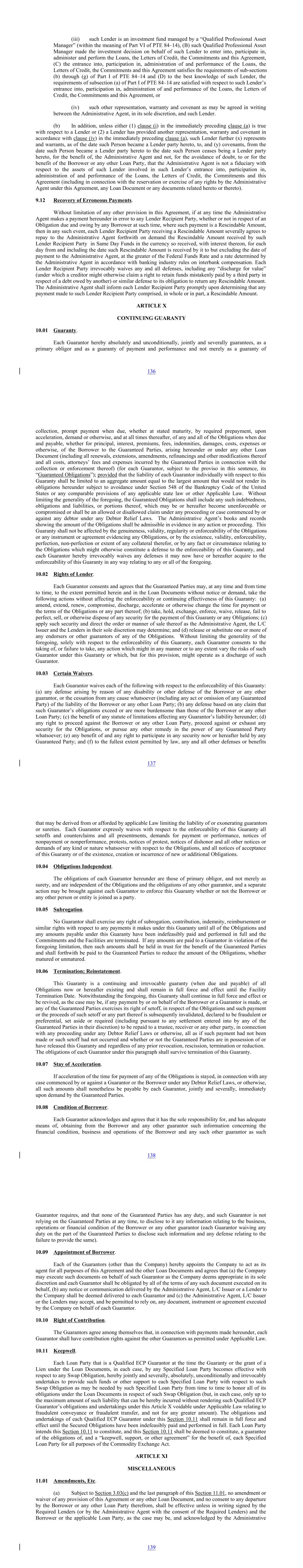 (iii) such Lender is an investment fund managed by a “Qualified Professional Asset Manager” (within the meaning of Part VI of PTE 84–14), (B) such Qualified Professional Asset Manager made the investment decision on behalf of such Lender to enter into, participate in, administer and perform the Loans, the Letters of Credit, the Commitments and this Agreement, (C) the entrance into, participation in, administration of and performance of the Loans, the Letters of Credit, the Commitments and this Agreement satisfies the requirements of sub-sections (b) through (g) of Part I of PTE 84–14 and (D) to the best knowledge of such Lender, the requirements of subsection (a) of Part I of PTE 84–14 are satisfied with respect to such Lender’s entrance into, participation in, administration of and performance of the Loans, the Letters of Credit, the Commitments and this Agreement, or (iv) such other representation, warranty and covenant as may be agreed in writing between the Administrative Agent, in its sole discretion, and such Lender. (b) In addition, unless either (1) clause (i) in the immediately preceding clause (a) is true with respect to a Lender or (2) a Lender has provided another representation, warranty and covenant in accordance with clause (iv) in the immediately preceding clause (a), such Lender further (x) represents and warrants, as of the date such Person became a Lender party hereto, to, and (y) covenants, from the date such Person became a Lender party hereto to the date such Person ceases being a Lender party hereto, for the benefit of, the Administrative Agent and not, for the avoidance of doubt, to or for the benefit of the Borrower or any other Loan Party, that the Administrative Agent is not a fiduciary with respect to the assets of such Lender involved in such Lender’s entrance into, participation in, administration of and performance of the Loans, the Letters of Credit, the Commitments and this Agreement (including in connection with the reservation or exercise of any rights by the Administrative Agent under this Agreement, any Loan Document or any documents related hereto or thereto). 9.12 Recovery of Erroneous Payments. Without limitation of any other provision in this Agreement, if at any time the Administrative Agent makes a payment hereunder in error to any Lender Recipient Party, whether or not in respect of an Obligation due and owing by any Borrower at such time, where such payment is a Rescindable Amount, then in any such event, each Lender Recipient Party receiving a Rescindable Amount severally agrees to repay to the Administrative Agent forthwith on demand the Rescindable Amount received by such Lender Recipient Party in Same Day Funds in the currency so received, with interest thereon, for each day from and including the date such Rescindable Amount is received by it to but excluding the date of payment to the Administrative Agent, at the greater of the Federal Funds Rate and a rate determined by the Administrative Agent in accordance with banking industry rules on interbank compensation. Each Lender Recipient Party irrevocably waives any and all defenses, including any “discharge for value” (under which a creditor might otherwise claim a right to retain funds mistakenly paid by a third party in respect of a debt owed by another) or similar defense to its obligation to return any Rescindable Amount. The Administrative Agent shall inform each Lender Recipient Party promptly upon determining that any payment made to such Lender Recipient Party comprised, in whole or in part, a Rescindable Amount. ARTICLE X CONTINUING GUARANTY 10.01 Guaranty. Each Guarantor hereby absolutely and unconditionally, jointly and severally guarantees, as a primary obligor and as a guaranty of payment and performance and not merely as a guaranty of 136 collection, prompt payment when due, whether at stated maturity, by required prepayment, upon acceleration, demand or otherwise, and at all times thereafter, of any and all of the Obligations when due and payable, whether for principal, interest, premiums, fees, indemnities, damages, costs, expenses or otherwise, of the Borrower to the Guaranteed Parties, arising hereunder or under any other Loan Document (including all renewals, extensions, amendments, refinancings and other modifications thereof and all costs, attorneys’ fees and expenses incurred by the Guaranteed Parties in connection with the collection or enforcement thereof) (for each Guarantor, subject to the proviso in this sentence, its “Guaranteed Obligations”); provided that the liability of each Guarantor individually with respect to this Guaranty shall be limited to an aggregate amount equal to the largest amount that would not render its obligations hereunder subject to avoidance under Section 548 of the Bankruptcy Code of the United States or any comparable provisions of any applicable state law or other Applicable Law. Without limiting the generality of the foregoing, the Guaranteed Obligations shall include any such indebtedness, obligations and liabilities, or portions thereof, which may be or hereafter become unenforceable or compromised or shall be an allowed or disallowed claim under any proceeding or case commenced by or against any debtor under any Debtor Relief Laws. The Administrative Agent’s books and records showing the amount of the Obligations shall be admissible in evidence in any action or proceeding. This Guaranty shall not be affected by the genuineness, validity, regularity or enforceability of the Obligations or any instrument or agreement evidencing any Obligations, or by the existence, validity, enforceability, perfection, non-perfection or extent of any collateral therefor, or by any fact or circumstance relating to the Obligations which might otherwise constitute a defense to the enforceability of this Guaranty, and each Guarantor hereby irrevocably waives any defenses it may now have or hereafter acquire to the enforceability