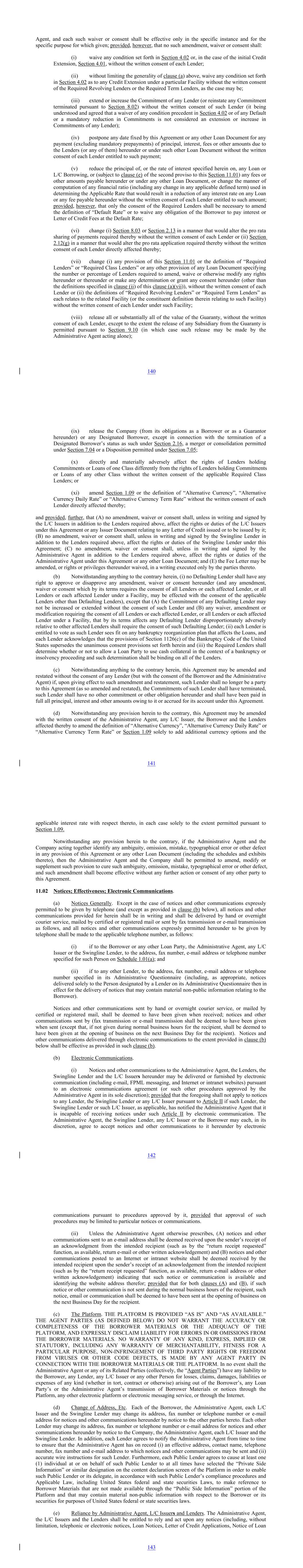 Agent, and each such waiver or consent shall be effective only in the specific instance and for the specific purpose for which given; provided, however, that no such amendment, waiver or consent shall: (i) waive any condition set forth in Section 4.02 or, in the case of the initial Credit Extension, Section 4.01, without the written consent of each Lender; (ii) without limiting the generality of clause (a) above, waive any condition set forth in Section 4.02 as to any Credit Extension under a particular Facility without the written consent of the Required Revolving Lenders or the Required Term Lenders, as the case may be; (iii) extend or increase the Commitment of any Lender (or reinstate any Commitment terminated pursuant to Section 8.02) without the written consent of such Lender (it being understood and agreed that a waiver of any condition precedent in Section 4.02 or of any Default or a mandatory reduction in Commitments is not considered an extension or increase in Commitments of any Lender); (iv) postpone any date fixed by this Agreement or any other Loan Document for any payment (excluding mandatory prepayments) of principal, interest, fees or other amounts due to the Lenders (or any of them) hereunder or under such other Loan Document without the written consent of each Lender entitled to such payment; (v) reduce the principal of, or the rate of interest specified herein on, any Loan or L/C Borrowing, or (subject to clause (e) of the second proviso to this Section 11.01) any fees or other amounts payable hereunder or under any other Loan Document, or change the manner of computation of any financial ratio (including any change in any applicable defined term) used in determining the Applicable Rate that would result in a reduction of any interest rate on any Loan or any fee payable hereunder without the written consent of each Lender entitled to such amount; provided, however, that only the consent of the Required Lenders shall be necessary to amend the definition of “Default Rate” or to waive any obligation of the Borrower to pay interest or Letter of Credit Fees at the Default Rate; (vi) change (i) Section 8.03 or Section 2.13 in a manner that would alter the pro rata sharing of payments required thereby without the written consent of each Lender or (ii) Section 2.12(g) in a manner that would alter the pro rata application required thereby without the written consent of each Lender directly affected thereby; (vii) change (i) any provision of this Section 11.01 or the definition of “Required Lenders” or “Required Class Lenders” or any other provision of any Loan Document specifying the number or percentage of Lenders required to amend, waive or otherwise modify any rights hereunder or thereunder or make any determination or grant any consent hereunder (other than the definitions specified in clause (ii) of this clause (a)(vii)), without the written consent of each Lender or (ii) the definitions of “Required Revolving Lenders” or “Required Term Lenders” as each relates to the related Facility (or the constituent definition therein relating to such Facility) without the written consent of each Lender under such Facility; (viii) release all or substantially all of the value of the Guaranty, without the written consent of each Lender, except to the extent the release of any Subsidiary from the Guaranty is permitted pursuant to Section 9.10 (in which case such release may be made by the Administrative Agent acting alone); 140 (ix) release the Company (from its obligations as a Borrower or as a Guarantor hereunder) or any Designated Borrower, except in connection with the termination of a Designated Borrower’s status as such under Section 2.16, a merger or consolidation permitted under Section 7.04 or a Disposition permitted under Section 7.05; (x) directly and materially adversely affect the rights of Lenders holding Commitments or Loans of one Class differently from the rights of Lenders holding Commitments or Loans of any other Class without the written consent of the applicable Required Class Lenders; or (xi) amend Section 1.09 or the definition of “Alternative Currency”, “Alternative Currency Daily Rate” or “Alternative Currency Term Rate” without the written consent of each Lender directly affected thereby; and provided, further, that (A) no amendment, waiver or consent shall, unless in writing and signed by the L/C Issuers in addition to the Lenders required above, affect the rights or duties of the L/C Issuers under this Agreement or any Issuer Document relating to any Letter of Credit issued or to be issued by it; (B) no amendment, waiver or consent shall, unless in writing and signed by the Swingline Lender in addition to the Lenders required above, affect the rights or duties of the Swingline Lender under this Agreement; (C) no amendment, waiver or consent shall, unless in writing and signed by the Administrative Agent in addition to the Lenders required above, affect the rights or duties of the Administrative Agent under this Agreement or any other Loan Document; and (E) the Fee Letter may be amended, or rights or privileges thereunder waived, in a writing executed only by the parties thereto. (b) Notwithstanding anything to the contrary herein, (i) no Defaulting Lender shall have any right to approve or disapprove any amendment, waiver or consent hereunder (and any amendment, waiver or consent which by its terms requires the consent of all Lenders or each affected Lender, or all Lenders or each affected Lender under a Facility, may be effected with the consent of the applicable Lenders other than Defaulting Lenders), except that (A) the Commitment of any Defaulting Lender may not be increased or extended without the consent of such Lender and (B) any waiver, amendment or modification requiring the consent of all Lenders or each affected Lender, or all Lenders or each affected Lender under a Facility, that by its terms affects any Defaulti