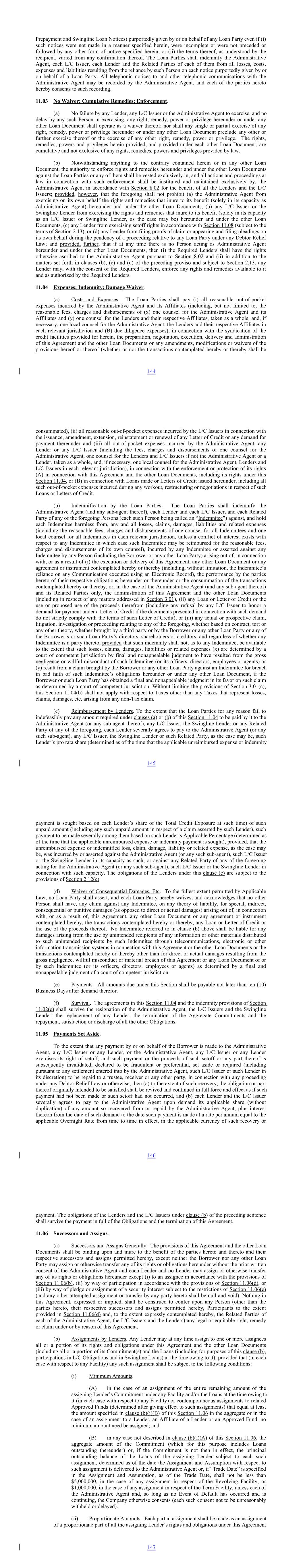 Prepayment and Swingline Loan Notices) purportedly given by or on behalf of any Loan Party even if (i) such notices were not made in a manner specified herein, were incomplete or were not preceded or followed by any other form of notice specified herein, or (ii) the terms thereof, as understood by the recipient, varied from any confirmation thereof. The Loan Parties shall indemnify the Administrative Agent, each L/C Issuer, each Lender and the Related Parties of each of them from all losses, costs, expenses and liabilities resulting from the reliance by such Person on each notice purportedly given by or on behalf of a Loan Party. All telephonic notices to and other telephonic communications with the Administrative Agent may be recorded by the Administrative Agent, and each of the parties hereto hereby consents to such recording. 11.03 No Waiver; Cumulative Remedies; Enforcement. (a) No failure by any Lender, any L/C Issuer or the Administrative Agent to exercise, and no delay by any such Person in exercising, any right, remedy, power or privilege hereunder or under any other Loan Document shall operate as a waiver thereof; nor shall any single or partial exercise of any right, remedy, power or privilege hereunder or under any other Loan Document preclude any other or further exercise thereof or the exercise of any other right, remedy, power or privilege. The rights, remedies, powers and privileges herein provided, and provided under each other Loan Document, are cumulative and not exclusive of any rights, remedies, powers and privileges provided by law. (b) Notwithstanding anything to the contrary contained herein or in any other Loan Document, the authority to enforce rights and remedies hereunder and under the other Loan Documents against the Loan Parties or any of them shall be vested exclusively in, and all actions and proceedings at law in connection with such enforcement shall be instituted and maintained exclusively by, the Administrative Agent in accordance with Section 8.02 for the benefit of all the Lenders and the L/C Issuers; provided, however, that the foregoing shall not prohibit (a) the Administrative Agent from exercising on its own behalf the rights and remedies that inure to its benefit (solely in its capacity as Administrative Agent) hereunder and under the other Loan Documents, (b) any L/C Issuer or the Swingline Lender from exercising the rights and remedies that inure to its benefit (solely in its capacity as an L/C Issuer or Swingline Lender, as the case may be) hereunder and under the other Loan Documents, (c) any Lender from exercising setoff rights in accordance with Section 11.08 (subject to the terms of Section 2.13), or (d) any Lender from filing proofs of claim or appearing and filing pleadings on its own behalf during the pendency of a proceeding relative to any Loan Party under any Debtor Relief Law; and provided, further, that if at any time there is no Person acting as Administrative Agent hereunder and under the other Loan Documents, then (i) the Required Lenders shall have the rights otherwise ascribed to the Administrative Agent pursuant to Section 8.02 and (ii) in addition to the matters set forth in clauses (b), (c) and (d) of the preceding proviso and subject to Section 2.13, any Lender may, with the consent of the Required Lenders, enforce any rights and remedies available to it and as authorized by the Required Lenders. 11.04 Expenses; Indemnity; Damage Waiver. (a) Costs and Expenses. The Loan Parties shall pay (i) all reasonable out-of-pocket expenses incurred by the Administrative Agent and its Affiliates (including, but not limited to, the reasonable fees, charges and disbursements of (x) one counsel for the Administrative Agent and its Affiliates and (y) one counsel for the Lenders and their respective Affiliates, taken as a whole, and, if necessary, one local counsel for the Administrative Agent, the Lenders and their respective Affiliates in each relevant jurisdiction and (B) due diligence expenses), in connection with the syndication of the credit facilities provided for herein, the preparation, negotiation, execution, delivery and administration of this Agreement and the other Loan Documents or any amendments, modifications or waivers of the provisions hereof or thereof (whether or not the transactions contemplated hereby or thereby shall be 144 consummated), (ii) all reasonable out-of-pocket expenses incurred by the L/C Issuers in connection with the issuance, amendment, extension, reinstatement or renewal of any Letter of Credit or any demand for payment thereunder and (iii) all out-of-pocket expenses incurred by the Administrative Agent, any Lender or any L/C Issuer (including the fees, charges and disbursements of one counsel for the Administrative Agent, one counsel for the Lenders and L/C Issuers if not the Administrative Agent or a Lender, taken as a whole, and, if necessary, one local counsel for the Administrative Agent, Lenders and L/C Issuers in each relevant jurisdiction), in connection with the enforcement or protection of its rights (A) in connection with this Agreement and the other Loan Documents, including its rights under this Section 11.04, or (B) in connection with Loans made or Letters of Credit issued hereunder, including all such out-of-pocket expenses incurred during any workout, restructuring or negotiations in respect of such Loans or Letters of Credit. (b) Indemnification by the Loan Parties. The Loan Parties shall indemnify the Administrative Agent (and any sub-agent thereof), each Lender and each L/C Issuer, and each Related Party of any of the foregoing Persons (each such Person being called an “Indemnitee”) against, and hold each Indemnitee harmless from, any and all losses, claims, damages, liabilities and related expenses (including the reasonable fees, charges and disbursements of one counsel for all Indemnitees and one local counsel for all Indemnitees in each relevant jurisdiction, unless a conflict