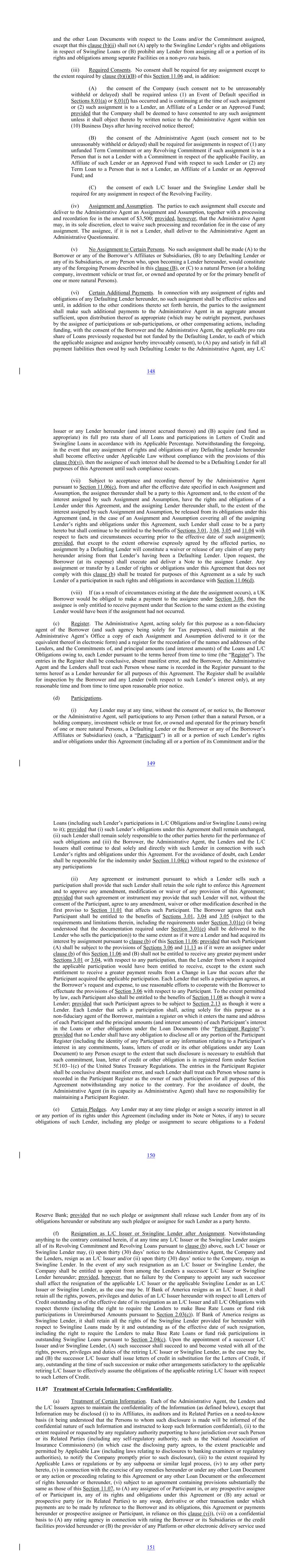 and the other Loan Documents with respect to the Loans and/or the Commitment assigned, except that this clause (b)(ii) shall not (A) apply to the Swingline Lender’s rights and obligations in respect of Swingline Loans or (B) prohibit any Lender from assigning all or a portion of its rights and obligations among separate Facilities on a non-pro rata basis. (iii) Required Consents. No consent shall be required for any assignment except to the extent required by clause (b)(i)(B) of this Section 11.06 and, in addition: (A) the consent of the Company (such consent not to be unreasonably withheld or delayed) shall be required unless (1) an Event of Default specified in Sections 8.01(a) or 8.01(f) has occurred and is continuing at the time of such assignment or (2) such assignment is to a Lender, an Affiliate of a Lender or an Approved Fund; provided that the Company shall be deemed to have consented to any such assignment unless it shall object thereto by written notice to the Administrative Agent within ten (10) Business Days after having received notice thereof; (B) the consent of the Administrative Agent (such consent not to be unreasonably withheld or delayed) shall be required for assignments in respect of (1) any unfunded Term Commitment or any Revolving Commitment if such assignment is to a Person that is not a Lender with a Commitment in respect of the applicable Facility, an Affiliate of such Lender or an Approved Fund with respect to such Lender or (2) any Term Loan to a Person that is not a Lender, an Affiliate of a Lender or an Approved Fund; and (C) the consent of each L/C Issuer and the Swingline Lender shall be required for any assignment in respect of the Revolving Facility. (iv) Assignment and Assumption. The parties to each assignment shall execute and deliver to the Administrative Agent an Assignment and Assumption, together with a processing and recordation fee in the amount of $3,500; provided, however, that the Administrative Agent may, in its sole discretion, elect to waive such processing and recordation fee in the case of any assignment. The assignee, if it is not a Lender, shall deliver to the Administrative Agent an Administrative Questionnaire. (v) No Assignment to Certain Persons. No such assignment shall be made (A) to the Borrower or any of the Borrower’s Affiliates or Subsidiaries, (B) to any Defaulting Lender or any of its Subsidiaries, or any Person who, upon becoming a Lender hereunder, would constitute any of the foregoing Persons described in this clause (B), or (C) to a natural Person (or a holding company, investment vehicle or trust for, or owned and operated by or for the primary benefit of one or more natural Persons). (vi) Certain Additional Payments. In connection with any assignment of rights and obligations of any Defaulting Lender hereunder, no such assignment shall be effective unless and until, in addition to the other conditions thereto set forth herein, the parties to the assignment shall make such additional payments to the Administrative Agent in an aggregate amount sufficient, upon distribution thereof as appropriate (which may be outright payment, purchases by the assignee of participations or sub-participations, or other compensating actions, including funding, with the consent of the Borrower and the Administrative Agent, the applicable pro rata share of Loans previously requested but not funded by the Defaulting Lender, to each of which the applicable assignee and assignor hereby irrevocably consent), to (A) pay and satisfy in full all payment liabilities then owed by such Defaulting Lender to the Administrative Agent, any L/C 148 Issuer or any Lender hereunder (and interest accrued thereon) and (B) acquire (and fund as appropriate) its full pro rata share of all Loans and participations in Letters of Credit and Swingline Loans in accordance with its Applicable Percentage. Notwithstanding the foregoing, in the event that any assignment of rights and obligations of any Defaulting Lender hereunder shall become effective under Applicable Law without compliance with the provisions of this clause (b)(vi), then the assignee of such interest shall be deemed to be a Defaulting Lender for all purposes of this Agreement until such compliance occurs. (vii) Subject to acceptance and recording thereof by the Administrative Agent pursuant to Section 11.06(c), from and after the effective date specified in each Assignment and Assumption, the assignee thereunder shall be a party to this Agreement and, to the extent of the interest assigned by such Assignment and Assumption, have the rights and obligations of a Lender under this Agreement, and the assigning Lender thereunder shall, to the extent of the interest assigned by such Assignment and Assumption, be released from its obligations under this Agreement (and, in the case of an Assignment and Assumption covering all of the assigning Lender’s rights and obligations under this Agreement, such Lender shall cease to be a party hereto but shall continue to be entitled to the benefits of Sections 3.01, 3.04, 3.05 and 11.04 with respect to facts and circumstances occurring prior to the effective date of such assignment); provided, that except to the extent otherwise expressly agreed by the affected parties, no assignment by a Defaulting Lender will constitute a waiver or release of any claim of any party hereunder arising from that Lender’s having been a Defaulting Lender. Upon request, the Borrower (at its expense) shall execute and deliver a Note to the assignee Lender. Any assignment or transfer by a Lender of rights or obligations under this Agreement that does not comply with this clause (b) shall be treated for purposes of this Agreement as a sale by such Lender of a participation in such rights and obligations in accordance with Section 11.06(d). (viii) If (as a result of circumstances existing at the date the assignment occurs), a UK Borrower would be obliged to make a payment to the assigne