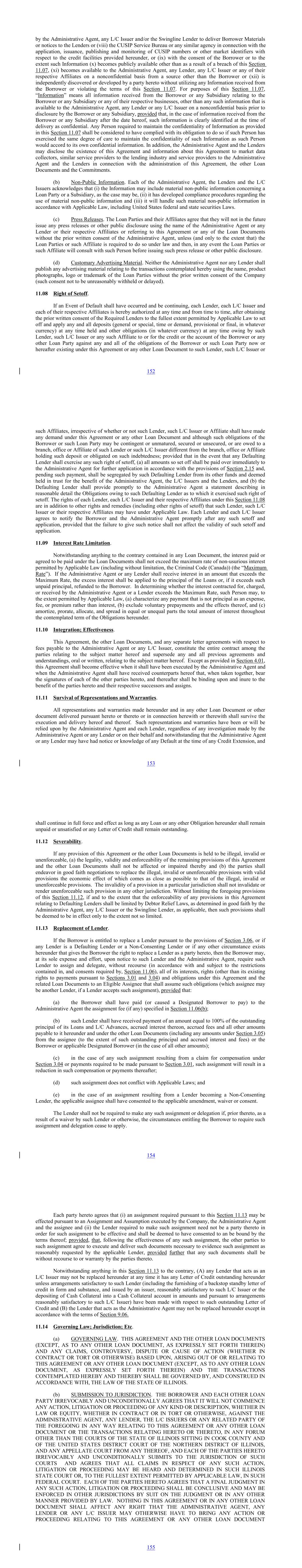 by the Administrative Agent, any L/C Issuer and/or the Swingline Lender to deliver Borrower Materials or notices to the Lenders or (viii) the CUSIP Service Bureau or any similar agency in connection with the application, issuance, publishing and monitoring of CUSIP numbers or other market identifiers with respect to the credit facilities provided hereunder, or (ix) with the consent of the Borrower or to the extent such Information (x) becomes publicly available other than as a result of a breach of this Section 11.07, (xi) becomes available to the Administrative Agent, any Lender, any L/C Issuer or any of their respective Affiliates on a nonconfidential basis from a source other than the Borrower or (xii) is independently discovered or developed by a party hereto without utilizing any Information received from the Borrower or violating the terms of this Section 11.07. For purposes of this Section 11.07, “Information” means all information received from the Borrower or any Subsidiary relating to the Borrower or any Subsidiary or any of their respective businesses, other than any such information that is available to the Administrative Agent, any Lender or any L/C Issuer on a nonconfidential basis prior to disclosure by the Borrower or any Subsidiary, provided that, in the case of information received from the Borrower or any Subsidiary after the date hereof, such information is clearly identified at the time of delivery as confidential. Any Person required to maintain the confidentiality of Information as provided in this Section 11.07 shall be considered to have complied with its obligation to do so if such Person has exercised the same degree of care to maintain the confidentiality of such Information as such Person would accord to its own confidential information. In addition, the Administrative Agent and the Lenders may disclose the existence of this Agreement and information about this Agreement to market data collectors, similar service providers to the lending industry and service providers to the Administrative Agent and the Lenders in connection with the administration of this Agreement, the other Loan Documents and the Commitments. (b) Non-Public Information. Each of the Administrative Agent, the Lenders and the L/C Issuers acknowledges that (i) the Information may include material non-public information concerning a Loan Party or a Subsidiary, as the case may be, (ii) it has developed compliance procedures regarding the use of material non-public information and (iii) it will handle such material non-public information in accordance with Applicable Law, including United States federal and state securities Laws. (c) Press Releases. The Loan Parties and their Affiliates agree that they will not in the future issue any press releases or other public disclosure using the name of the Administrative Agent or any Lender or their respective Affiliates or referring to this Agreement or any of the Loan Documents without the prior written consent of the Administrative Agent, unless (and only to the extent that) the Loan Parties or such Affiliate is required to do so under law and then, in any event the Loan Parties or such Affiliate will consult with such Person before issuing such press release or other public disclosure. (d) Customary Advertising Material. Neither the Administrative Agent nor any Lender shall publish any advertising material relating to the transactions contemplated hereby using the name, product photographs, logo or trademark of the Loan Parties without the prior written consent of the Company (such consent not to be unreasonably withheld or delayed). 11.08 Right of Setoff. If an Event of Default shall have occurred and be continuing, each Lender, each L/C Issuer and each of their respective Affiliates is hereby authorized at any time and from time to time, after obtaining the prior written consent of the Required Lenders to the fullest extent permitted by Applicable Law to set off and apply any and all deposits (general or special, time or demand, provisional or final, in whatever currency) at any time held and other obligations (in whatever currency) at any time owing by such Lender, such L/C Issuer or any such Affiliate to or for the credit or the account of the Borrower or any other Loan Party against any and all of the obligations of the Borrower or such Loan Party now or hereafter existing under this Agreement or any other Loan Document to such Lender, such L/C Issuer or 152 such Affiliates, irrespective of whether or not such Lender, such L/C Issuer or Affiliate shall have made any demand under this Agreement or any other Loan Document and although such obligations of the Borrower or such Loan Party may be contingent or unmatured, secured or unsecured, or are owed to a branch, office or Affiliate of such Lender or such L/C Issuer different from the branch, office or Affiliate holding such deposit or obligated on such indebtedness; provided that in the event that any Defaulting Lender shall exercise any such right of setoff, (a) all amounts so set off shall be paid over immediately to the Administrative Agent for further application in accordance with the provisions of Section 2.15 and, pending such payment, shall be segregated by such Defaulting Lender from its other funds and deemed held in trust for the benefit of the Administrative Agent, the L/C Issuers and the Lenders, and (b) the Defaulting Lender shall provide promptly to the Administrative Agent a statement describing in reasonable detail the Obligations owing to such Defaulting Lender as to which it exercised such right of setoff. The rights of each Lender, each L/C Issuer and their respective Affiliates under this Section 11.08 are in addition to other rights and remedies (including other rights of setoff) that such Lender, such L/C Issuer or their respective Affiliates may have under Applicable Law. Each Lender and each L/C Issuer agrees to notify the Borrower and the Administrative Agent promptly