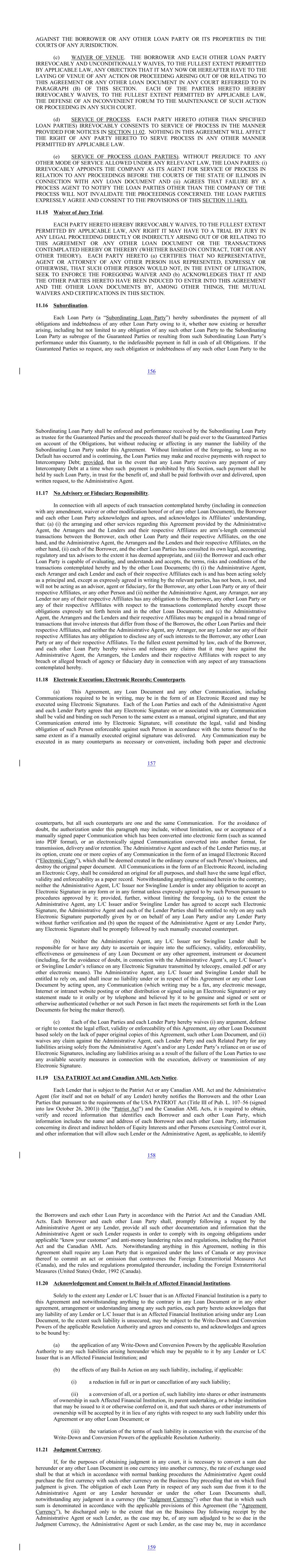 AGAINST THE BORROWER OR ANY OTHER LOAN PARTY OR ITS PROPERTIES IN THE COURTS OF ANY JURISDICTION. (c) WAIVER OF VENUE. THE BORROWER AND EACH OTHER LOAN PARTY IRREVOCABLY AND UNCONDITIONALLY WAIVES, TO THE FULLEST EXTENT PERMITTED BY APPLICABLE LAW, ANY OBJECTION THAT IT MAY NOW OR HEREAFTER HAVE TO THE LAYING OF VENUE OF ANY ACTION OR PROCEEDING ARISING OUT OF OR RELATING TO THIS AGREEMENT OR ANY OTHER LOAN DOCUMENT IN ANY COURT REFERRED TO IN PARAGRAPH (B) OF THIS SECTION. EACH OF THE PARTIES HERETO HEREBY IRREVOCABLY WAIVES, TO THE FULLEST EXTENT PERMITTED BY APPLICABLE LAW, THE DEFENSE OF AN INCONVENIENT FORUM TO THE MAINTENANCE OF SUCH ACTION OR PROCEEDING IN ANY SUCH COURT. (d) SERVICE OF PROCESS. EACH PARTY HERETO (OTHER THAN SPECIFIED LOAN PARTIES) IRREVOCABLY CONSENTS TO SERVICE OF PROCESS IN THE MANNER PROVIDED FOR NOTICES IN SECTION 11.02. NOTHING IN THIS AGREEMENT WILL AFFECT THE RIGHT OF ANY PARTY HERETO TO SERVE PROCESS IN ANY OTHER MANNER PERMITTED BY APPLICABLE LAW. (e) SERVICE OF PROCESS (LOAN PARTIES). WITHOUT PREJUDICE TO ANY OTHER MODE OF SERVICE ALLOWED UNDER ANY RELEVANT LAW, THE LOAN PARIES: (i) IRREVOCABLY APPOINTS THE COMPANY AS ITS AGENT FOR SERVICE OF PROCESS IN RELATION TO ANY PROCEEDINGS BEFORE THE COURTS OF THE STATE OF ILLINOIS IN CONNECTION WITH ANY LOAN DOCUMENT AND (ii) AGREES THAT FAILURE BY A PROCESS AGENT TO NOTIFY THE LOAN PARTIES OTHER THAN THE COMPANY OF THE PROCESS WILL NOT INVALIDATE THE PROCEEDINGS CONCERNED. THE LOAN PARTIES EXPRESSLY AGREE AND CONSENT TO THE PROVISIONS OF THIS SECTION 11.14(E). 11.15 Waiver of Jury Trial. EACH PARTY HERETO HEREBY IRREVOCABLY WAIVES, TO THE FULLEST EXTENT PERMITTED BY APPLICABLE LAW, ANY RIGHT IT MAY HAVE TO A TRIAL BY JURY IN ANY LEGAL PROCEEDING DIRECTLY OR INDIRECTLY ARISING OUT OF OR RELATING TO THIS AGREEMENT OR ANY OTHER LOAN DOCUMENT OR THE TRANSACTIONS CONTEMPLATED HEREBY OR THEREBY (WHETHER BASED ON CONTRACT, TORT OR ANY OTHER THEORY). EACH PARTY HERETO (a) CERTIFIES THAT NO REPRESENTATIVE, AGENT OR ATTORNEY OF ANY OTHER PERSON HAS REPRESENTED, EXPRESSLY OR OTHERWISE, THAT SUCH OTHER PERSON WOULD NOT, IN THE EVENT OF LITIGATION, SEEK TO ENFORCE THE FOREGOING WAIVER AND (b) ACKNOWLEDGES THAT IT AND THE OTHER PARTIES HERETO HAVE BEEN INDUCED TO ENTER INTO THIS AGREEMENT AND THE OTHER LOAN DOCUMENTS BY, AMONG OTHER THINGS, THE MUTUAL WAIVERS AND CERTIFICATIONS IN THIS SECTION. 11.16 Subordination. Each Loan Party (a “Subordinating Loan Party”) hereby subordinates the payment of all obligations and indebtedness of any other Loan Party owing to it, whether now existing or hereafter arising, including but not limited to any obligation of any such other Loan Party to the Subordinating Loan Party as subrogee of the Guaranteed Parties or resulting from such Subordinating Loan Party’s performance under this Guaranty, to the indefeasible payment in full in cash of all Obligations. If the Guaranteed Parties so request, any such obligation or indebtedness of any such other Loan Party to the 156 Subordinating Loan Party shall be enforced and performance received by the Subordinating Loan Party as trustee for the Guaranteed Parties and the proceeds thereof shall be paid over to the Guaranteed Parties on account of the Obligations, but without reducing or affecting in any manner the liability of the Subordinating Loan Party under this Agreement. Without limitation of the foregoing, so long as no Default has occurred and is continuing, the Loan Parties may make and receive payments with respect to Intercompany Debt; provided, that in the event that any Loan Party receives any payment of any Intercompany Debt at a time when such payment is prohibited by this Section, such payment shall be held by such Loan Party, in trust for the benefit of, and shall be paid forthwith over and delivered, upon written request, to the Administrative Agent. 11.17 No Advisory or Fiduciary Responsibility. In connection with all aspects of each transaction contemplated hereby (including in connection with any amendment, waiver or other modification hereof or of any other Loan Document), the Borrower and each other Loan Party acknowledges and agrees, and acknowledges its Affiliates’ understanding, that: (a) (i) the arranging and other services regarding this Agreement provided by the Administrative Agent, the Arrangers and the Lenders and their respective Affiliates are arm’s-length commercial transactions between the Borrower, each other Loan Party and their respective Affiliates, on the one hand, and the Administrative Agent, the Arrangers and the Lenders and their respective Affiliates, on the other hand, (ii) each of the Borrower, and the other Loan Parties has consulted its own legal, accounting, regulatory and tax advisors to the extent it has deemed appropriate, and (iii) the Borrower and each other Loan Party is capable of evaluating, and understands and accepts, the terms, risks and conditions of the transactions contemplated hereby and by the other Loan Documents; (b) (i) the Administrative Agent, each Arranger and each Lender and each of their respective Affiliates each is and has been acting solely as a principal and, except as expressly agreed in writing by the relevant parties, has not been, is not, and will not be acting as an advisor, agent or fiduciary, for the Borrower, any other Loan Party or any of their respective Affiliates, or any other Person and (ii) neither the Administrative Agent, any Arranger, nor any Lender nor any of their respective Affiliates has any obligation to the Borrower, any other Loan Party or any of their respective Affiliates with respect to the transactions contemplated hereby except those obligations expressly set forth herein and in the other Loan Documents; and (c) the Administrative Agent, the Arrangers and the Lenders and their respective Affiliates may be engaged in a broad range of transactions that involve interests that differ from those of the Borrower, the other Loan Parties and 