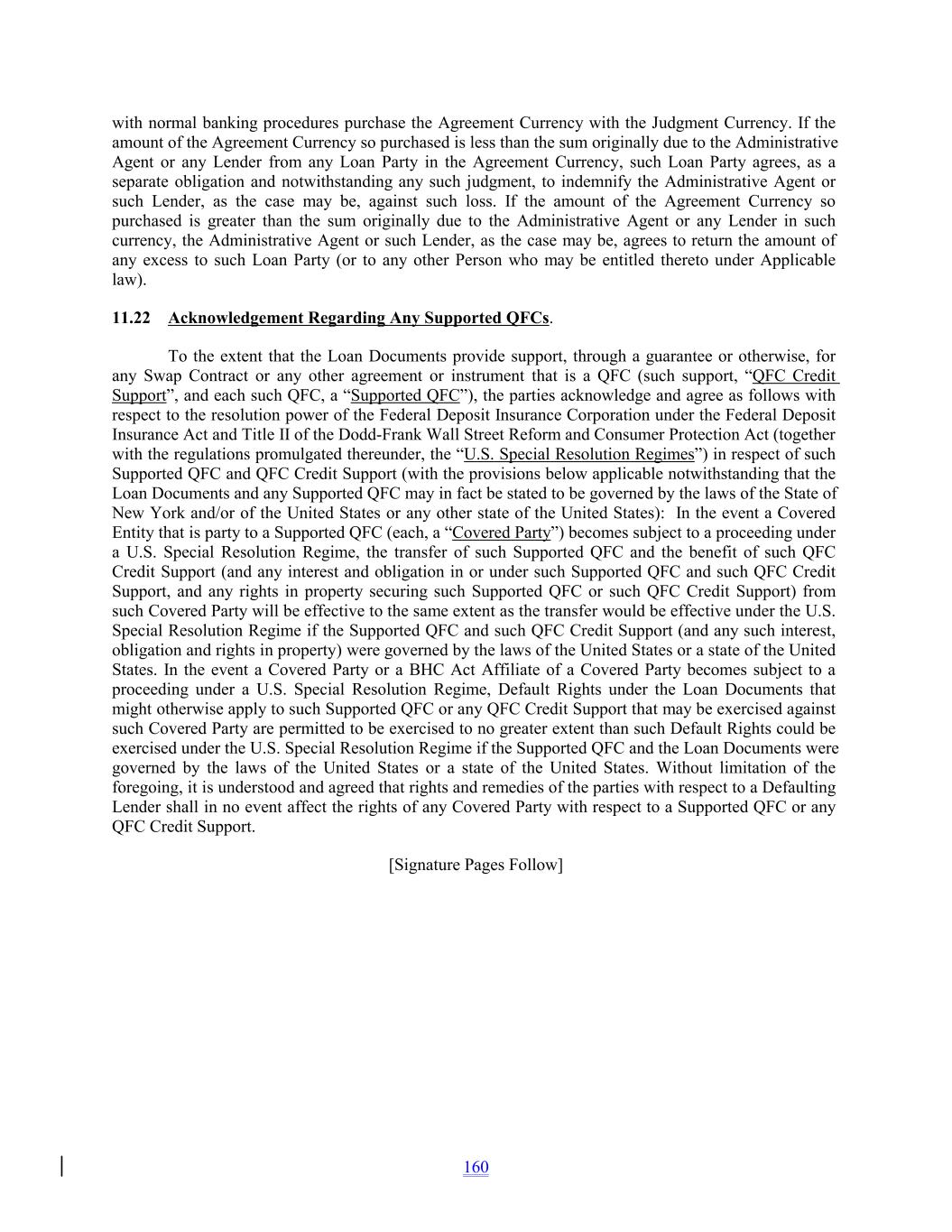 with normal banking procedures purchase the Agreement Currency with the Judgment Currency. If the amount of the Agreement Currency so purchased is less than the sum originally due to the Administrative Agent or any Lender from any Loan Party in the Agreement Currency, such Loan Party agrees, as a separate obligation and notwithstanding any such judgment, to indemnify the Administrative Agent or such Lender, as the case may be, against such loss. If the amount of the Agreement Currency so purchased is greater than the sum originally due to the Administrative Agent or any Lender in such currency, the Administrative Agent or such Lender, as the case may be, agrees to return the amount of any excess to such Loan Party (or to any other Person who may be entitled thereto under Applicable law). 11.22 Acknowledgement Regarding Any Supported QFCs. To the extent that the Loan Documents provide support, through a guarantee or otherwise, for any Swap Contract or any other agreement or instrument that is a QFC (such support, “QFC Credit Support”, and each such QFC, a “Supported QFC”), the parties acknowledge and agree as follows with respect to the resolution power of the Federal Deposit Insurance Corporation under the Federal Deposit Insurance Act and Title II of the Dodd-Frank Wall Street Reform and Consumer Protection Act (together with the regulations promulgated thereunder, the “U.S. Special Resolution Regimes”) in respect of such Supported QFC and QFC Credit Support (with the provisions below applicable notwithstanding that the Loan Documents and any Supported QFC may in fact be stated to be governed by the laws of the State of New York and/or of the United States or any other state of the United States): In the event a Covered Entity that is party to a Supported QFC (each, a “Covered Party”) becomes subject to a proceeding under a U.S. Special Resolution Regime, the transfer of such Supported QFC and the benefit of such QFC Credit Support (and any interest and obligation in or under such Supported QFC and such QFC Credit Support, and any rights in property securing such Supported QFC or such QFC Credit Support) from such Covered Party will be effective to the same extent as the transfer would be effective under the U.S. Special Resolution Regime if the Supported QFC and such QFC Credit Support (and any such interest, obligation and rights in property) were governed by the laws of the United States or a state of the United States. In the event a Covered Party or a BHC Act Affiliate of a Covered Party becomes subject to a proceeding under a U.S. Special Resolution Regime, Default Rights under the Loan Documents that might otherwise apply to such Supported QFC or any QFC Credit Support that may be exercised against such Covered Party are permitted to be exercised to no greater extent than such Default Rights could be exercised under the U.S. Special Resolution Regime if the Supported QFC and the Loan Documents were governed by the laws of the United States or a state of the United States. Without limitation of the foregoing, it is understood and agreed that rights and remedies of the parties with respect to a Defaulting Lender shall in no event affect the rights of any Covered Party with respect to a Supported QFC or any QFC Credit Support. [Signature Pages Follow] 160