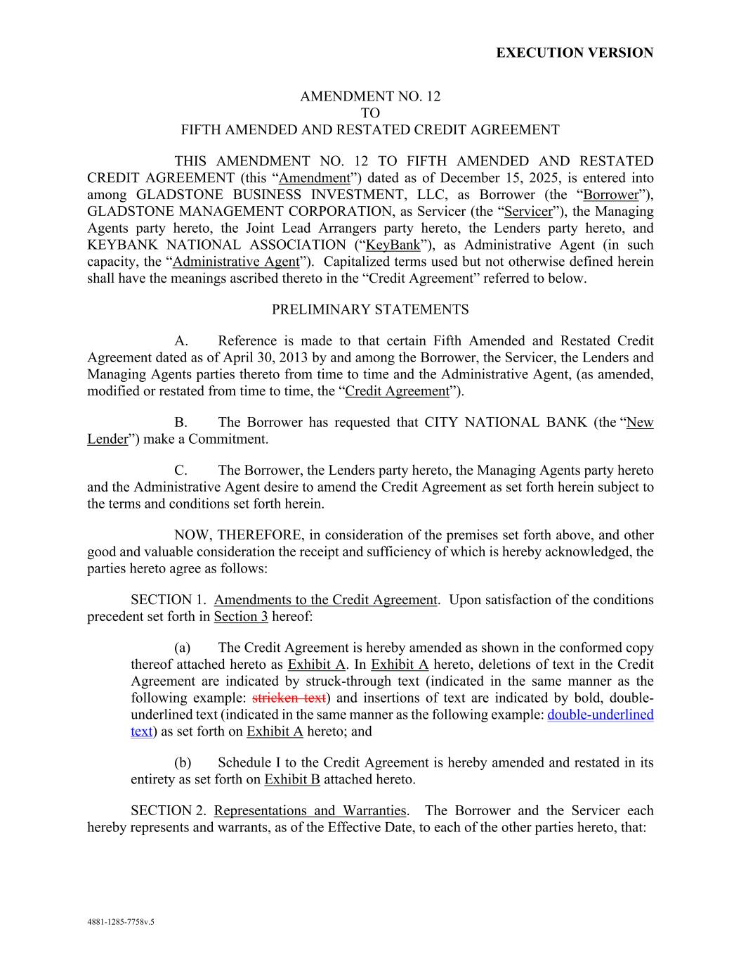 EXECUTION VERSION AMENDMENT NO. 12 TO FIFTH AMENDED AND RESTATED CREDIT AGREEMENT THIS AMENDMENT NO. 12 TO FIFTH AMENDED AND RESTATED CREDIT AGREEMENT (this “Amendment”) dated as of December 15, 2025, is entered into among GLADSTONE BUSINESS INVESTMENT, LLC, as Borrower (the “Borrower”), GLADSTONE MANAGEMENT CORPORATION, as Servicer (the “Servicer”), the Managing Agents party hereto, the Joint Lead Arrangers party hereto, the Lenders party hereto, and KEYBANK NATIONAL ASSOCIATION (“KeyBank”), as Administrative Agent (in such capacity, the “Administrative Agent”). Capitalized terms used but not otherwise defined herein shall have the meanings ascribed thereto in the “Credit Agreement” referred to below. PRELIMINARY STATEMENTS A. Reference is made to that certain Fifth Amended and Restated Credit Agreement dated as of April 30, 2013 by and among the Borrower, the Servicer, the Lenders and Managing Agents parties thereto from time to time and the Administrative Agent, (as amended, modified or restated from time to time, the “Credit Agreement”). B. The Borrower has requested that CITY NATIONAL BANK (the “New Lender”) make a Commitment. C. The Borrower, the Lenders party hereto, the Managing Agents party hereto and the Administrative Agent desire to amend the Credit Agreement as set forth herein subject to the terms and conditions set forth herein. NOW, THEREFORE, in consideration of the premises set forth above, and other good and valuable consideration the receipt and sufficiency of which is hereby acknowledged, the parties hereto agree as follows: SECTION 1. Amendments to the Credit Agreement. Upon satisfaction of the conditions precedent set forth in Section 3 hereof: (a) The Credit Agreement is hereby amended as shown in the conformed copy thereof attached hereto as Exhibit A. In Exhibit A hereto, deletions of text in the Credit Agreement are indicated by struck-through text (indicated in the same manner as the following example: stricken text) and insertions of text are indicated by bold, double- underlined text (indicated in the same manner as the following example: double-underlined text) as set forth on Exhibit A hereto; and (b) Schedule I to the Credit Agreement is hereby amended and restated in its entirety as set forth on Exhibit B attached hereto. SECTION 2. Representations and Warranties. The Borrower and the Servicer each hereby represents and warrants, as of the Effective Date, to each of the other parties hereto, that: 4881-1285-7758v.5