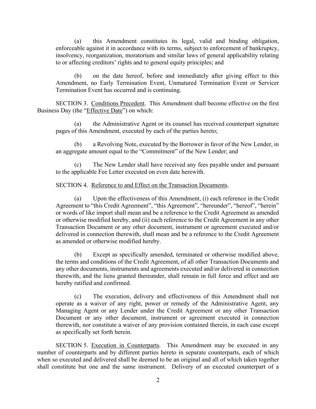 2 (a) this Amendment constitutes its legal, valid and binding obligation, enforceable against it in accordance with its terms, subject to enforcement of bankruptcy, insolvency, reorganization, moratorium and similar laws of general applicability relating to or affecting creditors’ rights and to general equity principles; and (b) on the date hereof, before and immediately after giving effect to this Amendment, no Early Termination Event, Unmatured Termination Event or Servicer Termination Event has occurred and is continuing. SECTION 3. Conditions Precedent. This Amendment shall become effective on the first Business Day (the “Effective Date”) on which: (a) the Administrative Agent or its counsel has received counterpart signature pages of this Amendment, executed by each of the parties hereto; (b) a Revolving Note, executed by the Borrower in favor of the New Lender, in an aggregate amount equal to the “Commitment” of the New Lender; and (c) The New Lender shall have received any fees payable under and pursuant to the applicable Fee Letter executed on even date herewith. SECTION 4. Reference to and Effect on the Transaction Documents. (a) Upon the effectiveness of this Amendment, (i) each reference in the Credit Agreement to “this Credit Agreement”, “this Agreement”, “hereunder”, “hereof”, “herein” or words of like import shall mean and be a reference to the Credit Agreement as amended or otherwise modified hereby, and (ii) each reference to the Credit Agreement in any other Transaction Document or any other document, instrument or agreement executed and/or delivered in connection therewith, shall mean and be a reference to the Credit Agreement as amended or otherwise modified hereby. (b) Except as specifically amended, terminated or otherwise modified above, the terms and conditions of the Credit Agreement, of all other Transaction Documents and any other documents, instruments and agreements executed and/or delivered in connection therewith, and the liens granted thereunder, shall remain in full force and effect and are hereby ratified and confirmed. (c) The execution, delivery and effectiveness of this Amendment shall not operate as a waiver of any right, power or remedy of the Administrative Agent, any Managing Agent or any Lender under the Credit Agreement or any other Transaction Document or any other document, instrument or agreement executed in connection therewith, nor constitute a waiver of any provision contained therein, in each case except as specifically set forth herein. SECTION 5. Execution in Counterparts. This Amendment may be executed in any number of counterparts and by different parties hereto in separate counterparts, each of which when so executed and delivered shall be deemed to be an original and all of which taken together shall constitute but one and the same instrument. Delivery of an executed counterpart of a