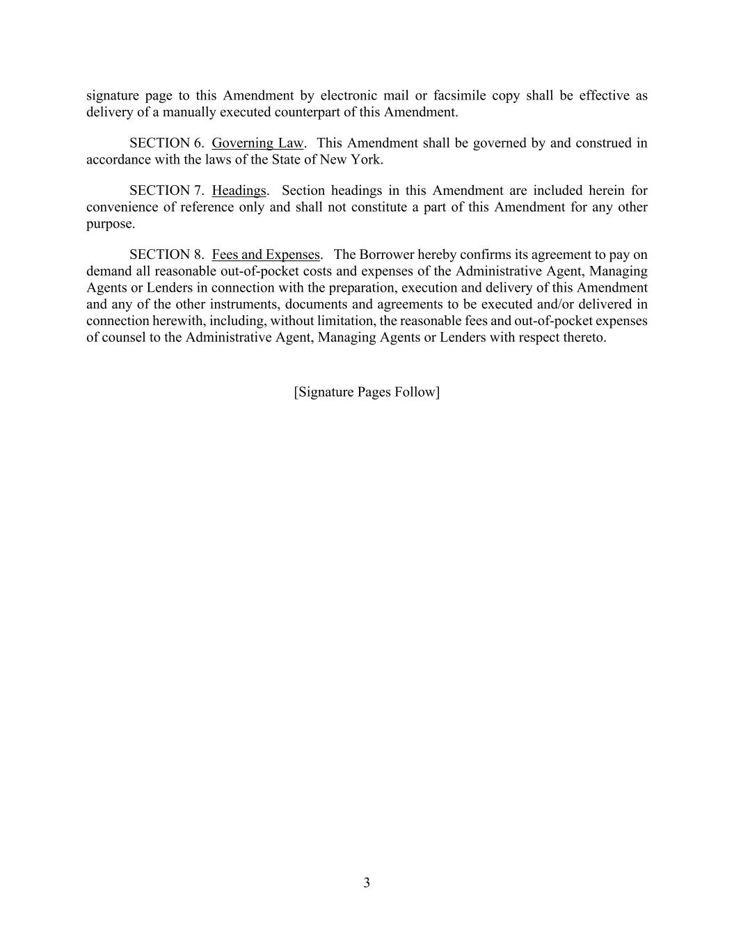 3 signature page to this Amendment by electronic mail or facsimile copy shall be effective as delivery of a manually executed counterpart of this Amendment. SECTION 6. Governing Law. This Amendment shall be governed by and construed in accordance with the laws of the State of New York. SECTION 7. Headings. Section headings in this Amendment are included herein for convenience of reference only and shall not constitute a part of this Amendment for any other purpose. SECTION 8. Fees and Expenses. The Borrower hereby confirms its agreement to pay on demand all reasonable out-of-pocket costs and expenses of the Administrative Agent, Managing Agents or Lenders in connection with the preparation, execution and delivery of this Amendment and any of the other instruments, documents and agreements to be executed and/or delivered in connection herewith, including, without limitation, the reasonable fees and out-of-pocket expenses of counsel to the Administrative Agent, Managing Agents or Lenders with respect thereto. [Signature Pages Follow]