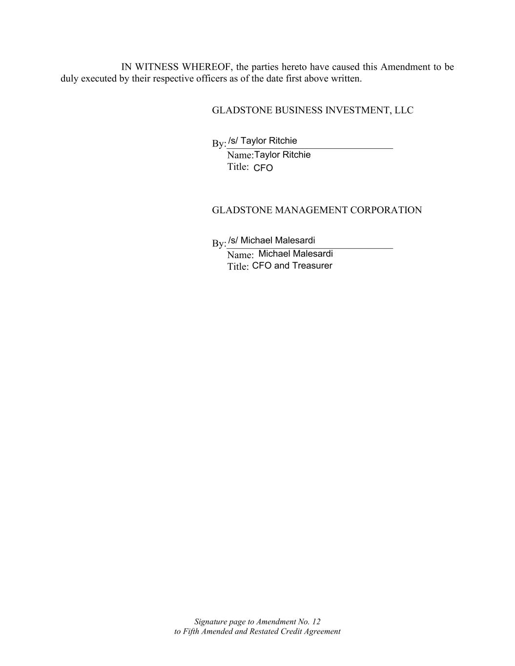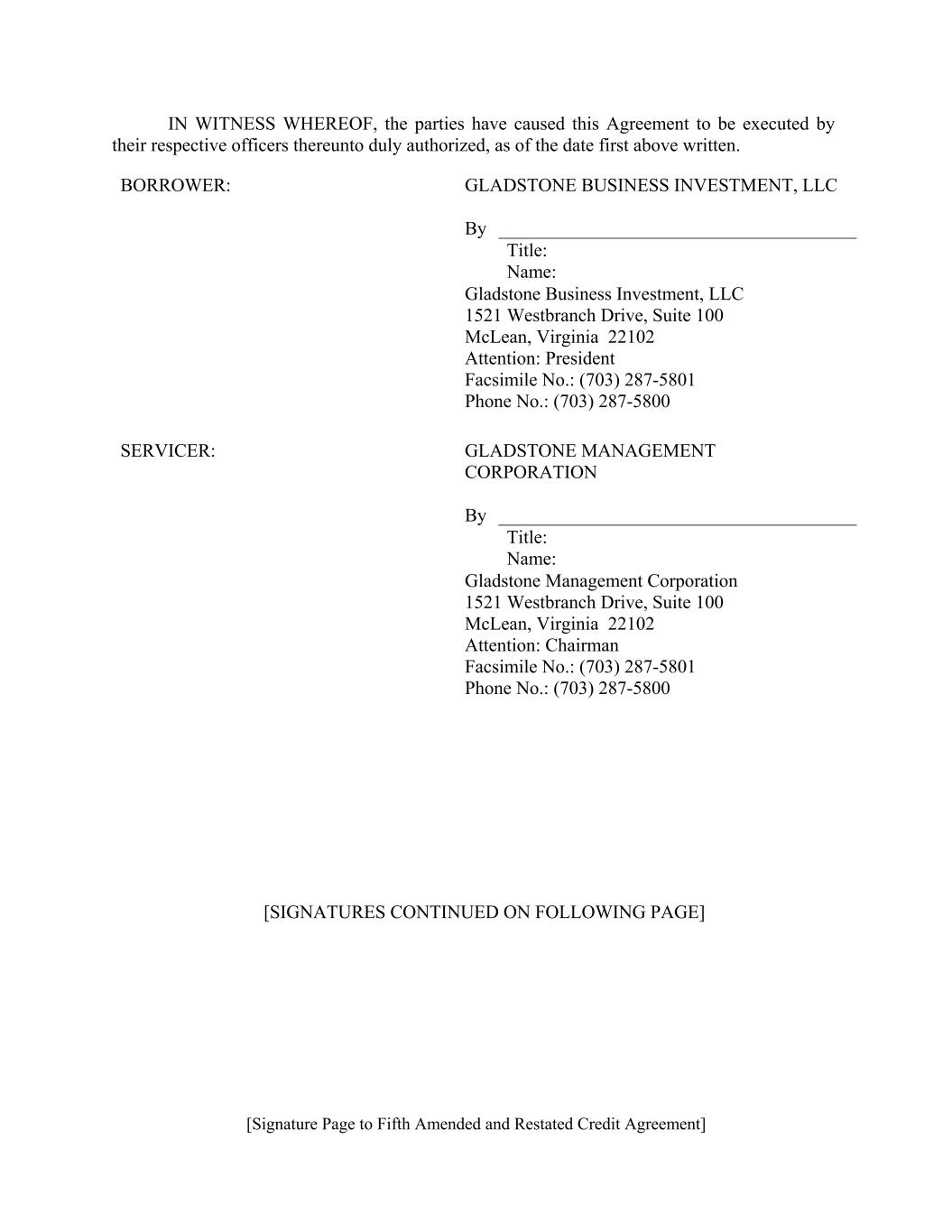 [Signature Page to Fifth Amended and Restated Credit Agreement] BORROWER: SERVICER: GLADSTONE MANAGEMENT CORPORATION GLADSTONE BUSINESS INVESTMENT, LLC By IN WITNESS WHEREOF, the parties have caused this Agreement to be executed by their respective officers thereunto duly authorized, as of the date first above written. Title: Name: Title: Name: Gladstone Management Corporation 1521 Westbranch Drive, Suite 100 McLean, Virginia 22102 Attention: Chairman Facsimile No.: (703) 287-5801 Phone No.: (703) 287-5800 [SIGNATURES CONTINUED ON FOLLOWING PAGE] Gladstone Business Investment, LLC 1521 Westbranch Drive, Suite 100 McLean, Virginia 22102 Attention: President Facsimile No.: (703) 287-5801 Phone No.: (703) 287-5800 By