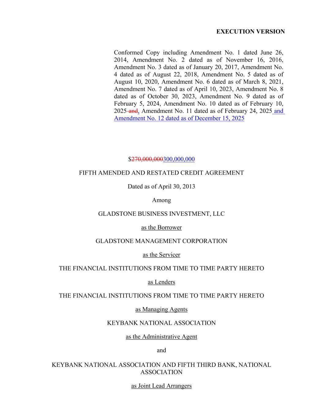 EXECUTION VERSION Conformed Copy including Amendment No. 1 dated June 26, 2014, Amendment No. 2 dated as of November 16, 2016, Amendment No. 3 dated as of January 20, 2017, Amendment No. 4 dated as of August 22, 2018, Amendment No. 5 dated as of August 10, 2020, Amendment No. 6 dated as of March 8, 2021, Amendment No. 7 dated as of April 10, 2023, Amendment No. 8 dated as of October 30, 2023, Amendment No. 9 dated as of February 5, 2024, Amendment No. 10 dated as of February 10, 2025 and, Amendment No. 11 dated as of February 24, 2025 and Amendment No. 12 dated as of December 15, 2025 $270,000,000300,000,000 FIFTH AMENDED AND RESTATED CREDIT AGREEMENT Dated as of April 30, 2013 Among GLADSTONE BUSINESS INVESTMENT, LLC as the Borrower GLADSTONE MANAGEMENT CORPORATION as the Servicer THE FINANCIAL INSTITUTIONS FROM TIME TO TIME PARTY HERETO as Lenders THE FINANCIAL INSTITUTIONS FROM TIME TO TIME PARTY HERETO as Managing Agents KEYBANK NATIONAL ASSOCIATION as the Administrative Agent and KEYBANK NATIONAL ASSOCIATION AND FIFTH THIRD BANK, NATIONAL ASSOCIATION as Joint Lead Arrangers