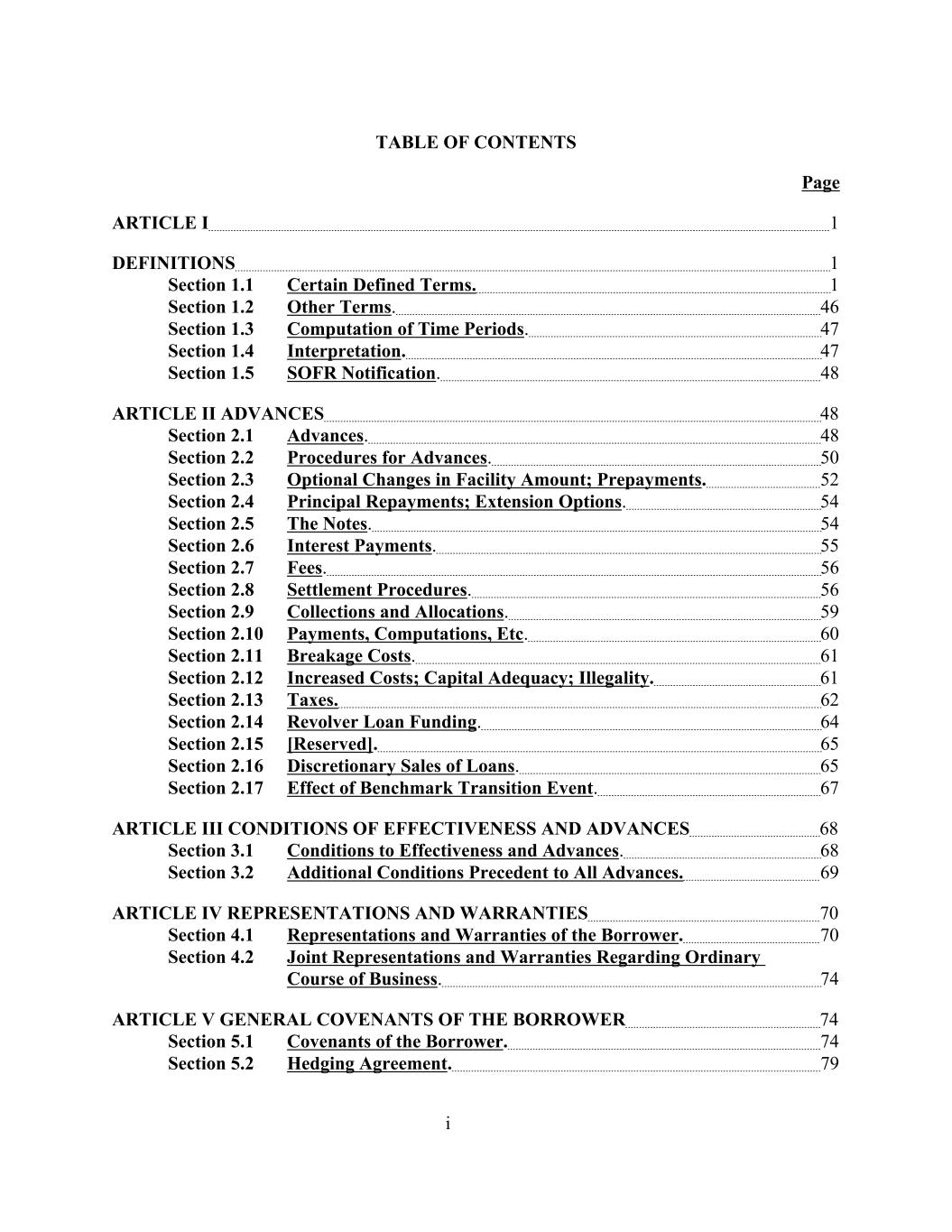 TABLE OF CONTENTS Page ARTICLE I 1 DEFINITIONS 1 Section 1.1 Certain Defined Terms. 1 Section 1.2 Other Terms. 46 Section 1.3 Computation of Time Periods. 47 Section 1.4 Interpretation. 47 Section 1.5 SOFR Notification. 48 ARTICLE II ADVANCES 48 Section 2.1 Advances. 48 Section 2.2 Procedures for Advances. 50 Section 2.3 Optional Changes in Facility Amount; Prepayments. 52 Section 2.4 Principal Repayments; Extension Options. 54 Section 2.5 The Notes. 54 Section 2.6 Interest Payments. 55 Section 2.7 Fees. 56 Section 2.8 Settlement Procedures. 56 Section 2.9 Collections and Allocations. 59 Section 2.10 Payments, Computations, Etc. 60 Section 2.11 Breakage Costs. 61 Section 2.12 Increased Costs; Capital Adequacy; Illegality. 61 Section 2.13 Taxes. 62 Section 2.14 Revolver Loan Funding. 64 Section 2.15 [Reserved]. 65 Section 2.16 Discretionary Sales of Loans. 65 Section 2.17 Effect of Benchmark Transition Event. 67 ARTICLE III CONDITIONS OF EFFECTIVENESS AND ADVANCES 68 Section 3.1 Conditions to Effectiveness and Advances. 68 Section 3.2 Additional Conditions Precedent to All Advances. 69 ARTICLE IV REPRESENTATIONS AND WARRANTIES 70 Section 4.1 Representations and Warranties of the Borrower. 70 Section 4.2 Joint Representations and Warranties Regarding Ordinary Course of Business. 74 ARTICLE V GENERAL COVENANTS OF THE BORROWER 74 Section 5.1 Covenants of the Borrower. 74 Section 5.2 Hedging Agreement. 79 i