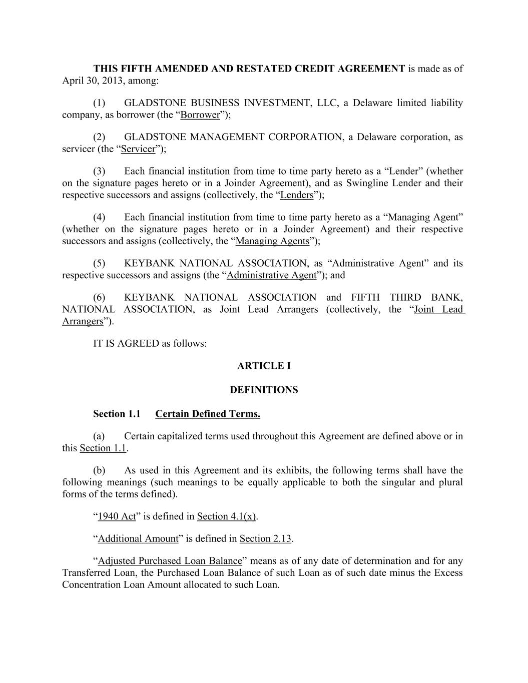 THIS FIFTH AMENDED AND RESTATED CREDIT AGREEMENT is made as of April 30, 2013, among: (1) GLADSTONE BUSINESS INVESTMENT, LLC, a Delaware limited liability company, as borrower (the “Borrower”); (2) GLADSTONE MANAGEMENT CORPORATION, a Delaware corporation, as servicer (the “Servicer”); (3) Each financial institution from time to time party hereto as a “Lender” (whether on the signature pages hereto or in a Joinder Agreement), and as Swingline Lender and their respective successors and assigns (collectively, the “Lenders”); (4) Each financial institution from time to time party hereto as a “Managing Agent” (whether on the signature pages hereto or in a Joinder Agreement) and their respective successors and assigns (collectively, the “Managing Agents”); (5) KEYBANK NATIONAL ASSOCIATION, as “Administrative Agent” and its respective successors and assigns (the “Administrative Agent”); and (6) KEYBANK NATIONAL ASSOCIATION and FIFTH THIRD BANK, NATIONAL ASSOCIATION, as Joint Lead Arrangers (collectively, the “Joint Lead Arrangers”). IT IS AGREED as follows: ARTICLE I DEFINITIONS Section 1.1 Certain Defined Terms. (a) Certain capitalized terms used throughout this Agreement are defined above or in this Section 1.1. (b) As used in this Agreement and its exhibits, the following terms shall have the following meanings (such meanings to be equally applicable to both the singular and plural forms of the terms defined). “1940 Act” is defined in Section 4.1(x). “Additional Amount” is defined in Section 2.13. “Adjusted Purchased Loan Balance” means as of any date of determination and for any Transferred Loan, the Purchased Loan Balance of such Loan as of such date minus the Excess Concentration Loan Amount allocated to such Loan.
