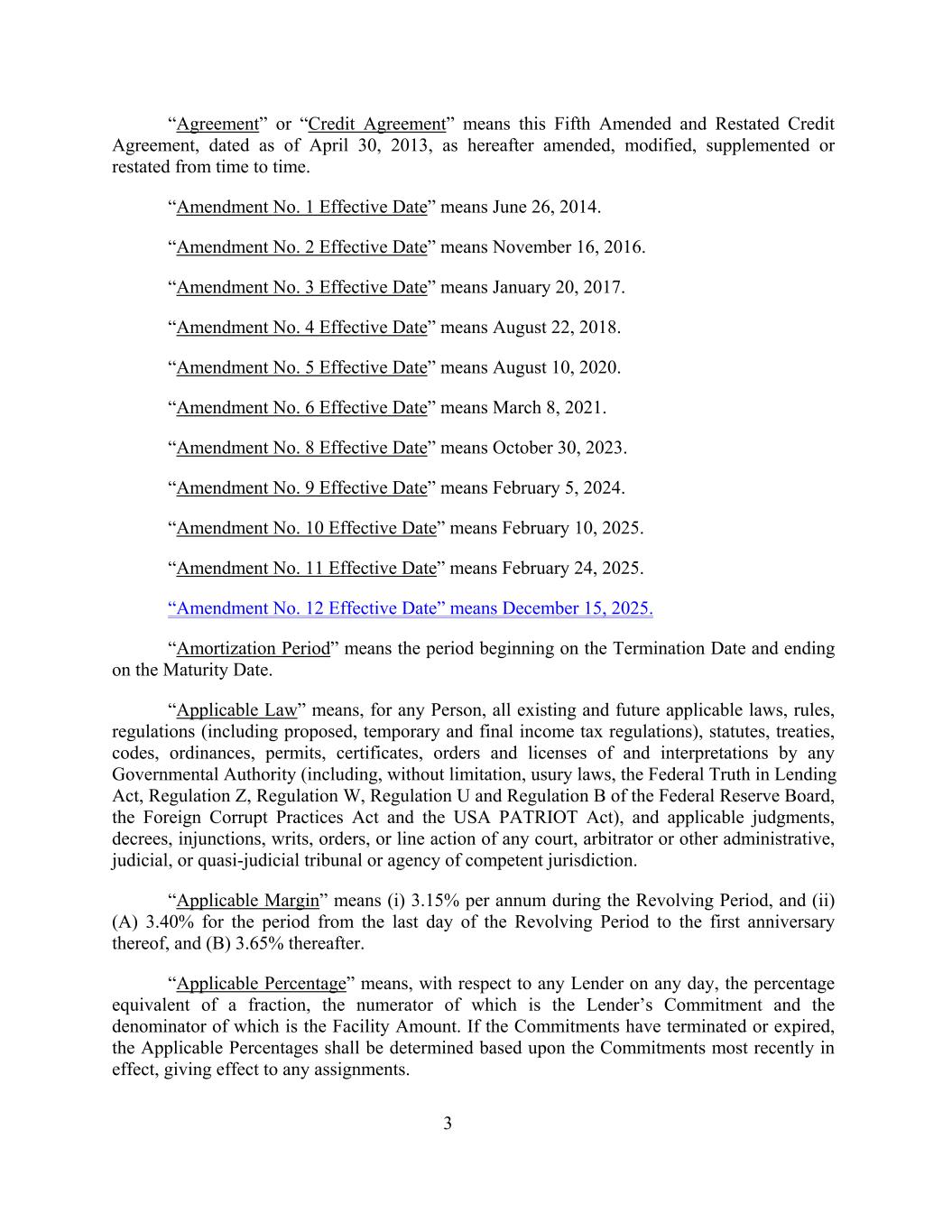 “Agreement” or “Credit Agreement” means this Fifth Amended and Restated Credit Agreement, dated as of April 30, 2013, as hereafter amended, modified, supplemented or restated from time to time. “Amendment No. 1 Effective Date” means June 26, 2014. “Amendment No. 2 Effective Date” means November 16, 2016. “Amendment No. 3 Effective Date” means January 20, 2017. “Amendment No. 4 Effective Date” means August 22, 2018. “Amendment No. 5 Effective Date” means August 10, 2020. “Amendment No. 6 Effective Date” means March 8, 2021. “Amendment No. 8 Effective Date” means October 30, 2023. “Amendment No. 9 Effective Date” means February 5, 2024. “Amendment No. 10 Effective Date” means February 10, 2025. “Amendment No. 11 Effective Date” means February 24, 2025. “Amendment No. 12 Effective Date” means December 15, 2025. “Amortization Period” means the period beginning on the Termination Date and ending on the Maturity Date. “Applicable Law” means, for any Person, all existing and future applicable laws, rules, regulations (including proposed, temporary and final income tax regulations), statutes, treaties, codes, ordinances, permits, certificates, orders and licenses of and interpretations by any Governmental Authority (including, without limitation, usury laws, the Federal Truth in Lending Act, Regulation Z, Regulation W, Regulation U and Regulation B of the Federal Reserve Board, the Foreign Corrupt Practices Act and the USA PATRIOT Act), and applicable judgments, decrees, injunctions, writs, orders, or line action of any court, arbitrator or other administrative, judicial, or quasi-judicial tribunal or agency of competent jurisdiction. “Applicable Margin” means (i) 3.15% per annum during the Revolving Period, and (ii) (A) 3.40% for the period from the last day of the Revolving Period to the first anniversary thereof, and (B) 3.65% thereafter. “Applicable Percentage” means, with respect to any Lender on any day, the percentage equivalent of a fraction, the numerator of which is the Lender’s Commitment and the denominator of which is the Facility Amount. If the Commitments have terminated or expired, the Applicable Percentages shall be determined based upon the Commitments most recently in effect, giving effect to any assignments. 3