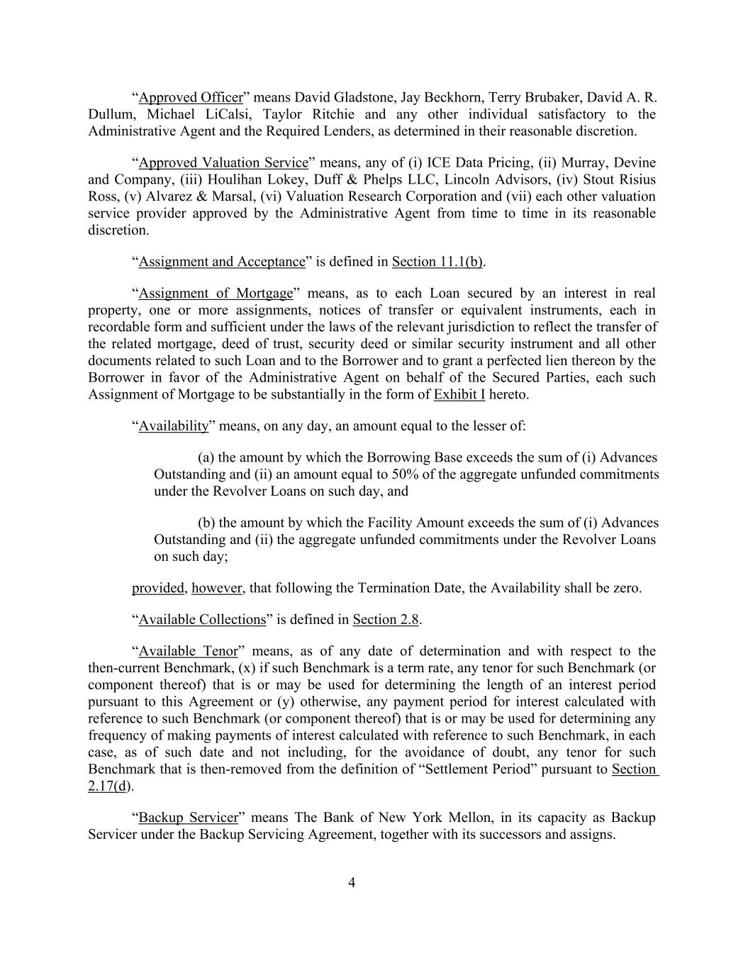 “Approved Officer” means David Gladstone, Jay Beckhorn, Terry Brubaker, David A. R. Dullum, Michael LiCalsi, Taylor Ritchie and any other individual satisfactory to the Administrative Agent and the Required Lenders, as determined in their reasonable discretion. “Approved Valuation Service” means, any of (i) ICE Data Pricing, (ii) Murray, Devine and Company, (iii) Houlihan Lokey, Duff & Phelps LLC, Lincoln Advisors, (iv) Stout Risius Ross, (v) Alvarez & Marsal, (vi) Valuation Research Corporation and (vii) each other valuation service provider approved by the Administrative Agent from time to time in its reasonable discretion. “Assignment and Acceptance” is defined in Section 11.1(b). “Assignment of Mortgage” means, as to each Loan secured by an interest in real property, one or more assignments, notices of transfer or equivalent instruments, each in recordable form and sufficient under the laws of the relevant jurisdiction to reflect the transfer of the related mortgage, deed of trust, security deed or similar security instrument and all other documents related to such Loan and to the Borrower and to grant a perfected lien thereon by the Borrower in favor of the Administrative Agent on behalf of the Secured Parties, each such Assignment of Mortgage to be substantially in the form of Exhibit I hereto. “Availability” means, on any day, an amount equal to the lesser of: (a) the amount by which the Borrowing Base exceeds the sum of (i) Advances Outstanding and (ii) an amount equal to 50% of the aggregate unfunded commitments under the Revolver Loans on such day, and (b) the amount by which the Facility Amount exceeds the sum of (i) Advances Outstanding and (ii) the aggregate unfunded commitments under the Revolver Loans on such day; provided, however, that following the Termination Date, the Availability shall be zero. “Available Collections” is defined in Section 2.8. “Available Tenor” means, as of any date of determination and with respect to the then-current Benchmark, (x) if such Benchmark is a term rate, any tenor for such Benchmark (or component thereof) that is or may be used for determining the length of an interest period pursuant to this Agreement or (y) otherwise, any payment period for interest calculated with reference to such Benchmark (or component thereof) that is or may be used for determining any frequency of making payments of interest calculated with reference to such Benchmark, in each case, as of such date and not including, for the avoidance of doubt, any tenor for such Benchmark that is then-removed from the definition of “Settlement Period” pursuant to Section 2.17(d). “Backup Servicer” means The Bank of New York Mellon, in its capacity as Backup Servicer under the Backup Servicing Agreement, together with its successors and assigns. 4