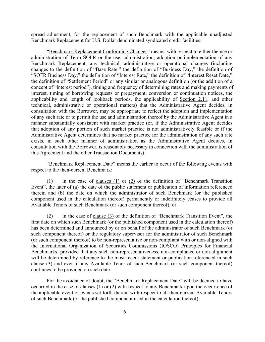 spread adjustment, for the replacement of such Benchmark with the applicable unadjusted Benchmark Replacement for U.S. Dollar denominated syndicated credit facilities. “Benchmark Replacement Conforming Changes” means, with respect to either the use or administration of Term SOFR or the use, administration, adoption or implementation of any Benchmark Replacement, any technical, administrative or operational changes (including changes to the definition of “Base Rate,” the definition of “Business Day,” the definition of “SOFR Business Day,” the definition of “Interest Rate,” the definition of “Interest Reset Date,” the definition of “Settlement Period” or any similar or analogous definition (or the addition of a concept of “interest period”), timing and frequency of determining rates and making payments of interest, timing of borrowing requests or prepayment, conversion or continuation notices, the applicability and length of lookback periods, the applicability of Section 2.11, and other technical, administrative or operational matters) that the Administrative Agent decides, in consultation with the Borrower, may be appropriate to reflect the adoption and implementation of any such rate or to permit the use and administration thereof by the Administrative Agent in a manner substantially consistent with market practice (or, if the Administrative Agent decides that adoption of any portion of such market practice is not administratively feasible or if the Administrative Agent determines that no market practice for the administration of any such rate exists, in such other manner of administration as the Administrative Agent decides, in consultation with the Borrower, is reasonably necessary in connection with the administration of this Agreement and the other Transaction Documents). “Benchmark Replacement Date” means the earlier to occur of the following events with respect to the then-current Benchmark: (1) in the case of clauses (1) or (2) of the definition of “Benchmark Transition Event”, the later of (a) the date of the public statement or publication of information referenced therein and (b) the date on which the administrator of such Benchmark (or the published component used in the calculation thereof) permanently or indefinitely ceases to provide all Available Tenors of such Benchmark (or such component thereof); or (2) in the case of clause (3) of the definition of “Benchmark Transition Event”, the first date on which such Benchmark (or the published component used in the calculation thereof) has been determined and announced by or on behalf of the administrator of such Benchmark (or such component thereof) or the regulatory supervisor for the administrator of such Benchmark (or such component thereof) to be non-representative or non-compliant with or non-aligned with the International Organization of Securities Commissions (IOSCO) Principles for Financial Benchmarks; provided that any such non-representativeness, non-compliance or non-alignment will be determined by reference to the most recent statement or publication referenced in such clause (3) and even if any Available Tenor of such Benchmark (or such component thereof) continues to be provided on such date. For the avoidance of doubt, the “Benchmark Replacement Date” will be deemed to have occurred in the case of clauses (1) or (2) with respect to any Benchmark upon the occurrence of the applicable event or events set forth therein with respect to all then-current Available Tenors of such Benchmark (or the published component used in the calculation thereof). 6