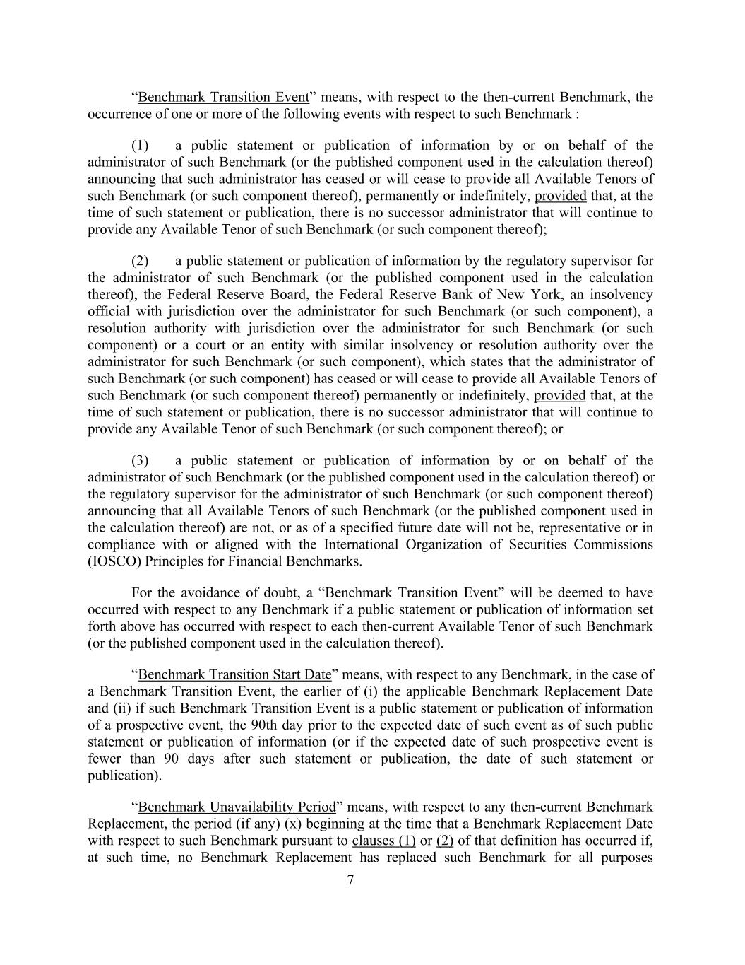 “Benchmark Transition Event” means, with respect to the then-current Benchmark, the occurrence of one or more of the following events with respect to such Benchmark : (1) a public statement or publication of information by or on behalf of the administrator of such Benchmark (or the published component used in the calculation thereof) announcing that such administrator has ceased or will cease to provide all Available Tenors of such Benchmark (or such component thereof), permanently or indefinitely, provided that, at the time of such statement or publication, there is no successor administrator that will continue to provide any Available Tenor of such Benchmark (or such component thereof); (2) a public statement or publication of information by the regulatory supervisor for the administrator of such Benchmark (or the published component used in the calculation thereof), the Federal Reserve Board, the Federal Reserve Bank of New York, an insolvency official with jurisdiction over the administrator for such Benchmark (or such component), a resolution authority with jurisdiction over the administrator for such Benchmark (or such component) or a court or an entity with similar insolvency or resolution authority over the administrator for such Benchmark (or such component), which states that the administrator of such Benchmark (or such component) has ceased or will cease to provide all Available Tenors of such Benchmark (or such component thereof) permanently or indefinitely, provided that, at the time of such statement or publication, there is no successor administrator that will continue to provide any Available Tenor of such Benchmark (or such component thereof); or (3) a public statement or publication of information by or on behalf of the administrator of such Benchmark (or the published component used in the calculation thereof) or the regulatory supervisor for the administrator of such Benchmark (or such component thereof) announcing that all Available Tenors of such Benchmark (or the published component used in the calculation thereof) are not, or as of a specified future date will not be, representative or in compliance with or aligned with the International Organization of Securities Commissions (IOSCO) Principles for Financial Benchmarks. For the avoidance of doubt, a “Benchmark Transition Event” will be deemed to have occurred with respect to any Benchmark if a public statement or publication of information set forth above has occurred with respect to each then-current Available Tenor of such Benchmark (or the published component used in the calculation thereof). “Benchmark Transition Start Date” means, with respect to any Benchmark, in the case of a Benchmark Transition Event, the earlier of (i) the applicable Benchmark Replacement Date and (ii) if such Benchmark Transition Event is a public statement or publication of information of a prospective event, the 90th day prior to the expected date of such event as of such public statement or publication of information (or if the expected date of such prospective event is fewer than 90 days after such statement or publication, the date of such statement or publication). “Benchmark Unavailability Period” means, with respect to any then-current Benchmark Replacement, the period (if any) (x) beginning at the time that a Benchmark Replacement Date with respect to such Benchmark pursuant to clauses (1) or (2) of that definition has occurred if, at such time, no Benchmark Replacement has replaced such Benchmark for all purposes 7