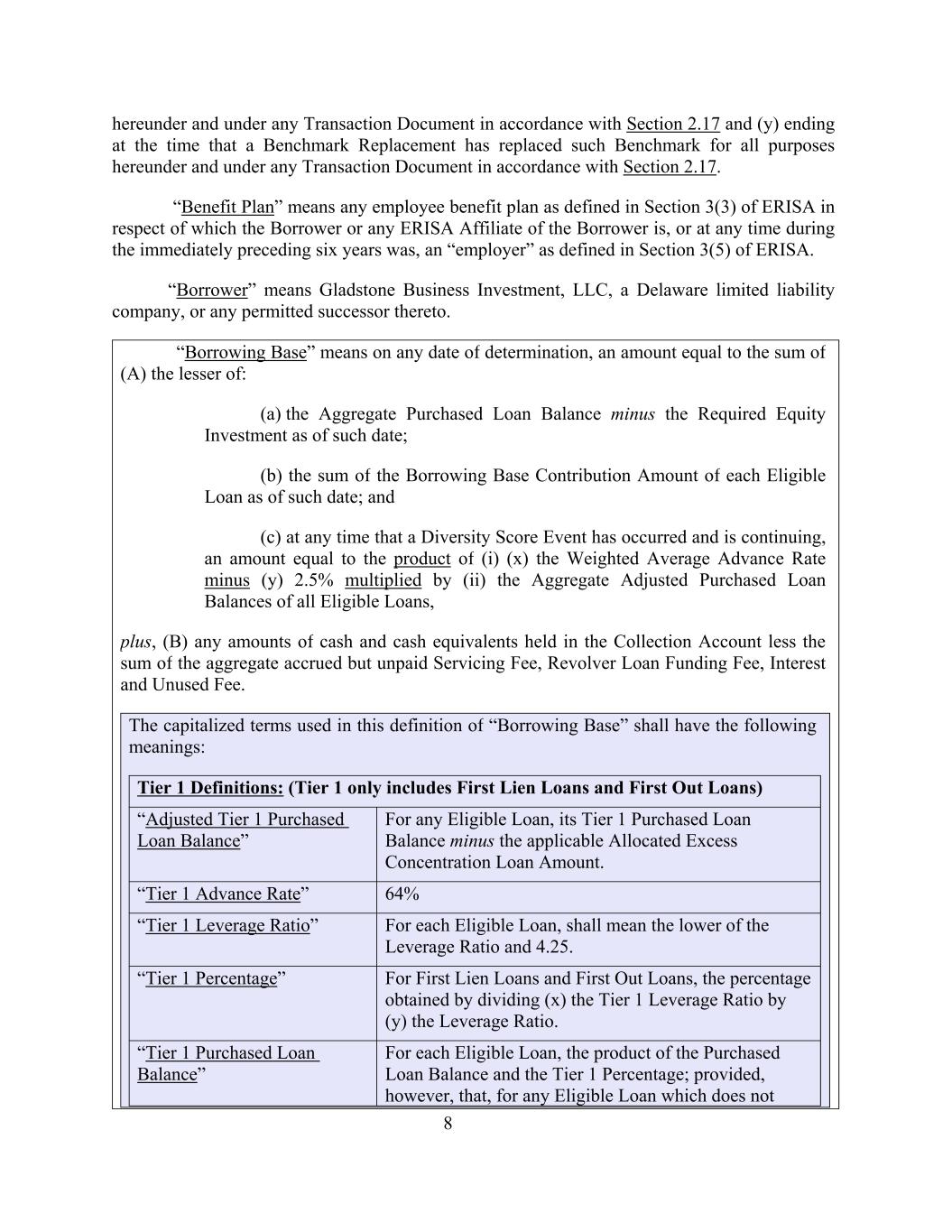 8 “Borrowing Base” means on any date of determination, an amount equal to the sum of (A) the lesser of: (a) the Aggregate Purchased Loan Balance minus the Required Equity Investment as of such date; (b) the sum of the Borrowing Base Contribution Amount of each Eligible Loan as of such date; and (c) at any time that a Diversity Score Event has occurred and is continuing, an amount equal to the product of (i) (x) the Weighted Average Advance Rate minus (y) 2.5% multiplied by (ii) the Aggregate Adjusted Purchased Loan Balances of all Eligible Loans, plus, (B) any amounts of cash and cash equivalents held in the Collection Account less the sum of the aggregate accrued but unpaid Servicing Fee, Revolver Loan Funding Fee, Interest and Unused Fee. hereunder and under any Transaction Document in accordance with Section 2.17 and (y) ending at the time that a Benchmark Replacement has replaced such Benchmark for all purposes hereunder and under any Transaction Document in accordance with Section 2.17. “Benefit Plan” means any employee benefit plan as defined in Section 3(3) of ERISA in respect of which the Borrower or any ERISA Affiliate of the Borrower is, or at any time during the immediately preceding six years was, an “employer” as defined in Section 3(5) of ERISA. “Borrower” means Gladstone Business Investment, LLC, a Delaware limited liability company, or any permitted successor thereto. The capitalized terms used in this definition of “Borrowing Base” shall have the following meanings: 64% “Tier 1 Purchased Loan Balance” For each Eligible Loan, the product of the Purchased Loan Balance and the Tier 1 Percentage; provided, however, that, for any Eligible Loan which does not For any Eligible Loan, its Tier 1 Purchased Loan Balance minus the applicable Allocated Excess Concentration Loan Amount. “Tier 1 Leverage Ratio” For each Eligible Loan, shall mean the lower of the Leverage Ratio and 4.25. Tier 1 Definitions: (Tier 1 only includes First Lien Loans and First Out Loans) “Tier 1 Percentage” “Tier 1 Advance Rate” For First Lien Loans and First Out Loans, the percentage obtained by dividing (x) the Tier 1 Leverage Ratio by (y) the Leverage Ratio. “Adjusted Tier 1 Purchased Loan Balance”