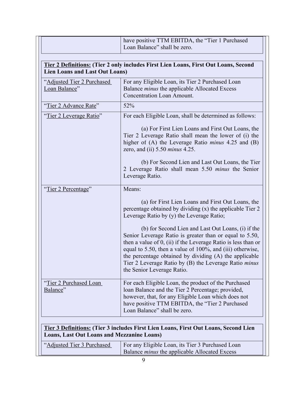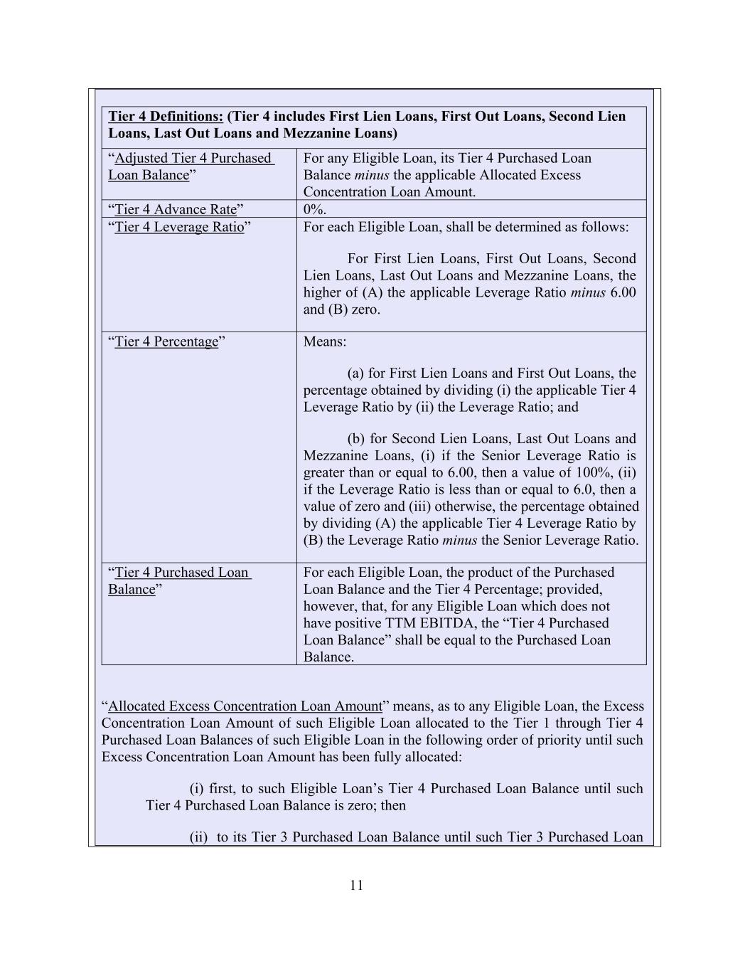 11 “Allocated Excess Concentration Loan Amount” means, as to any Eligible Loan, the Excess Concentration Loan Amount of such Eligible Loan allocated to the Tier 1 through Tier 4 Purchased Loan Balances of such Eligible Loan in the following order of priority until such Excess Concentration Loan Amount has been fully allocated: (i) first, to such Eligible Loan’s Tier 4 Purchased Loan Balance until such Tier 4 Purchased Loan Balance is zero; then (ii) to its Tier 3 Purchased Loan Balance until such Tier 3 Purchased Loan 0%. “Tier 4 Purchased Loan Balance” For each Eligible Loan, the product of the Purchased Loan Balance and the Tier 4 Percentage; provided, however, that, for any Eligible Loan which does not have positive TTM EBITDA, the “Tier 4 Purchased Loan Balance” shall be equal to the Purchased Loan Balance. For any Eligible Loan, its Tier 4 Purchased Loan Balance minus the applicable Allocated Excess Concentration Loan Amount. “Tier 4 Leverage Ratio” For each Eligible Loan, shall be determined as follows: For First Lien Loans, First Out Loans, Second Lien Loans, Last Out Loans and Mezzanine Loans, the higher of (A) the applicable Leverage Ratio minus 6.00 and (B) zero. Tier 4 Definitions: (Tier 4 includes First Lien Loans, First Out Loans, Second Lien Loans, Last Out Loans and Mezzanine Loans) “Tier 4 Percentage” “Tier 4 Advance Rate” Means: (a) for First Lien Loans and First Out Loans, the percentage obtained by dividing (i) the applicable Tier 4 Leverage Ratio by (ii) the Leverage Ratio; and (b) for Second Lien Loans, Last Out Loans and Mezzanine Loans, (i) if the Senior Leverage Ratio is greater than or equal to 6.00, then a value of 100%, (ii) if the Leverage Ratio is less than or equal to 6.0, then a value of zero and (iii) otherwise, the percentage obtained by dividing (A) the applicable Tier 4 Leverage Ratio by (B) the Leverage Ratio minus the Senior Leverage Ratio. “Adjusted Tier 4 Purchased Loan Balance”