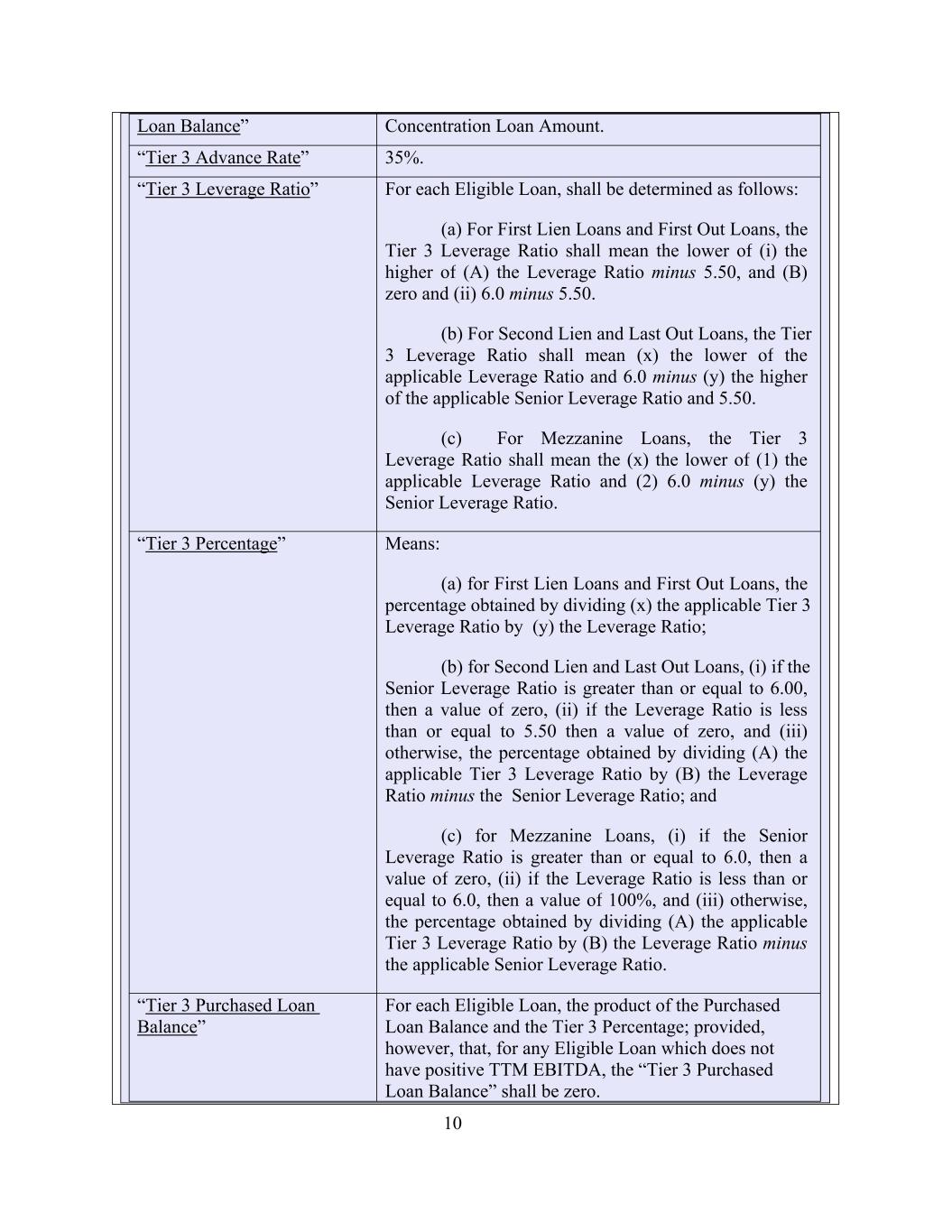 9 “Tier 2 Purchased Loan Balance” “Tier 2 Advance Rate” For each Eligible Loan, the product of the Purchased loan Balance and the Tier 2 Percentage; provided, however, that, for any Eligible Loan which does not have positive TTM EBITDA, the “Tier 2 Purchased Loan Balance” shall be zero. have positive TTM EBITDA, the “Tier 1 Purchased Loan Balance” shall be zero. 52% Tier 3 Definitions: (Tier 3 includes First Lien Loans, First Out Loans, Second Lien Loans, Last Out Loans and Mezzanine Loans) “Adjusted Tier 3 Purchased For any Eligible Loan, its Tier 3 Purchased Loan Balance minus the applicable Allocated Excess “Tier 2 Leverage Ratio” “Adjusted Tier 2 Purchased Loan Balance” For each Eligible Loan, shall be determined as follows: (a) For First Lien Loans and First Out Loans, the Tier 2 Leverage Ratio shall mean the lower of (i) the higher of (A) the Leverage Ratio minus 4.25 and (B) zero, and (ii) 5.50 minus 4.25. (b) For Second Lien and Last Out Loans, the Tier 2 Leverage Ratio shall mean 5.50 minus the Senior Leverage Ratio. For any Eligible Loan, its Tier 2 Purchased Loan Balance minus the applicable Allocated Excess Concentration Loan Amount. “Tier 2 Percentage” Means: (a) for First Lien Loans and First Out Loans, the percentage obtained by dividing (x) the applicable Tier 2 Leverage Ratio by (y) the Leverage Ratio; (b) for Second Lien and Last Out Loans, (i) if the Senior Leverage Ratio is greater than or equal to 5.50, then a value of 0, (ii) if the Leverage Ratio is less than or equal to 5.50, then a value of 100%, and (iii) otherwise, the percentage obtained by dividing (A) the applicable Tier 2 Leverage Ratio by (B) the Leverage Ratio minus the Senior Leverage Ratio. Tier 2 Definitions: (Tier 2 only includes First Lien Loans, First Out Loans, Second Lien Loans and Last Out Loans)